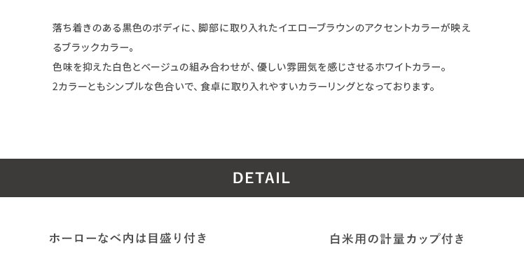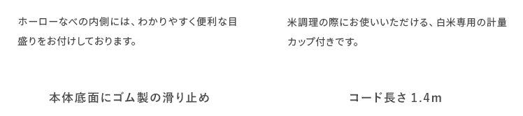 米調理の際にお使いいただける、白米専用の計量カップ付きです。
