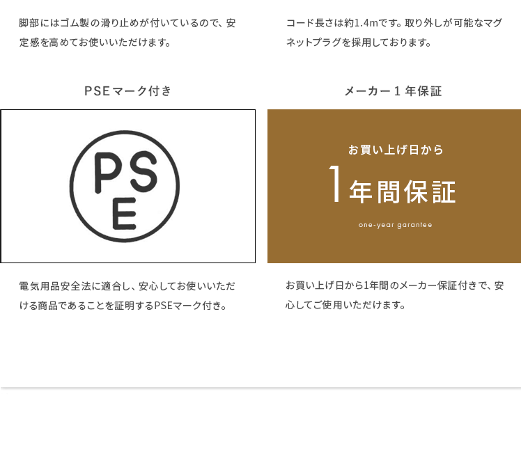 脚部にはゴム製の滑り止めが付いているので、安定感を高めてお使いいただけます。