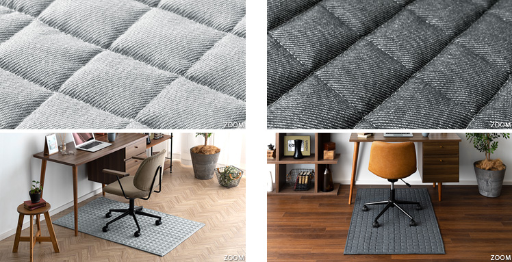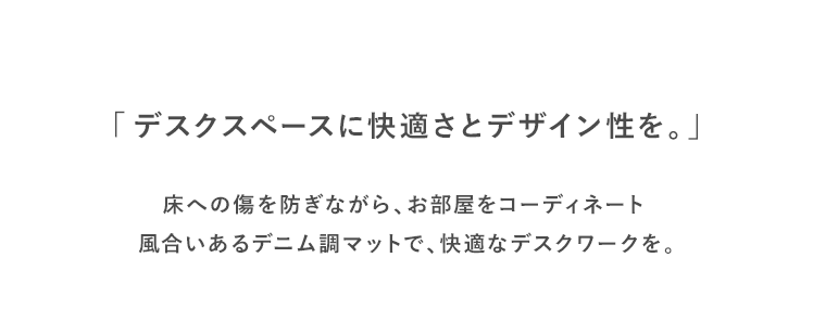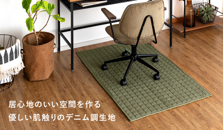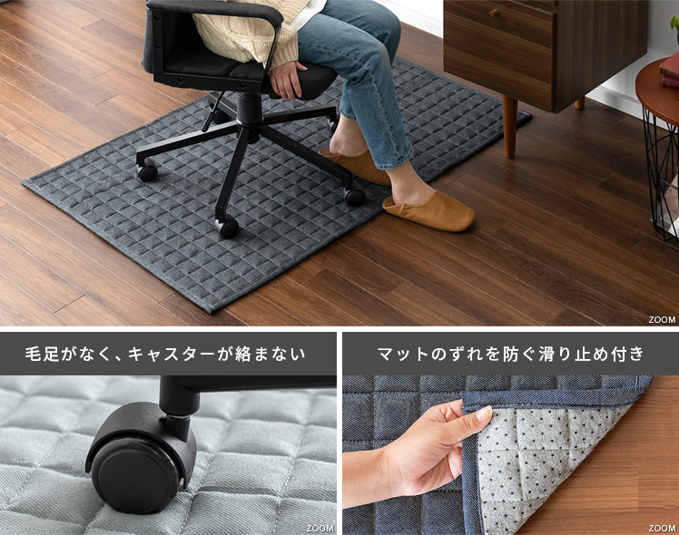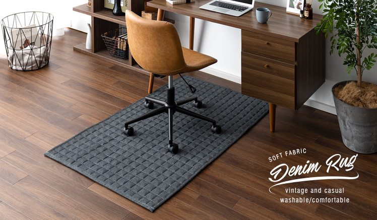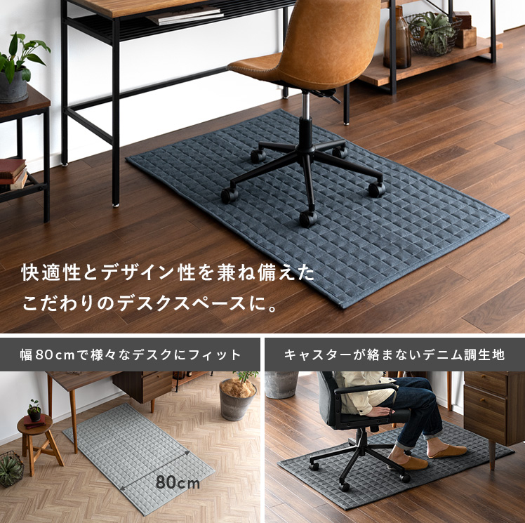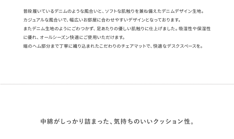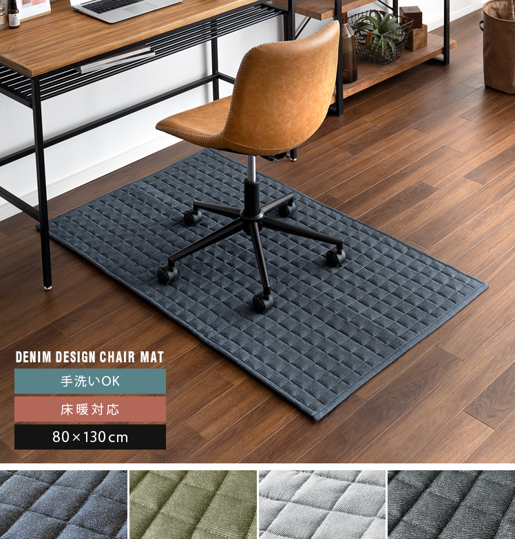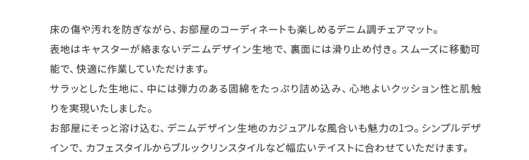 デニムデザインチェアマット 80×130cm/床の傷や汚れを防ぎながら、お部屋のコーディネートも楽しめるデニム調チェアマット。表地はキャスターが絡まないデニムデザイン生地で、裏面には滑り止め付き。スムーズに移動可能で、快適に作業していただけます。サラッとした生地に、中には弾力のある固綿をたっぷり詰め込み、心地よいクッション性と肌触りを実現いたしました。お部屋にそっと溶け込む、デニムデザイン生地のカジュアルな風合いも魅力の1つ。シンプルデザインで、カフェスタイルからブルックリンスタイルなど幅広いテイストに合わせていただけます。