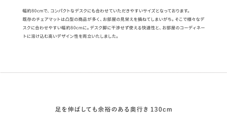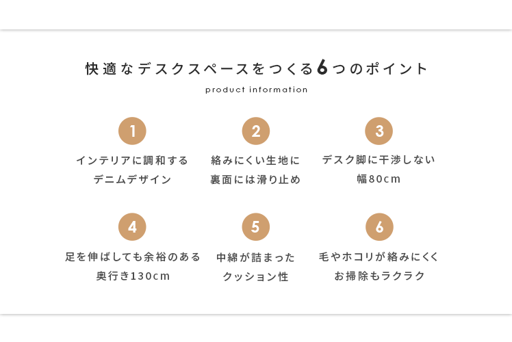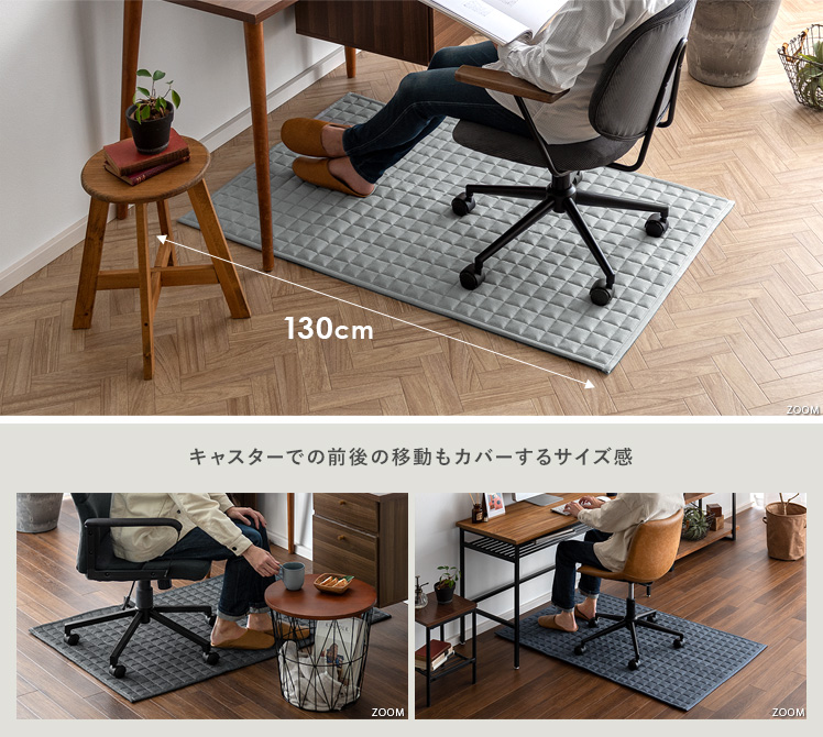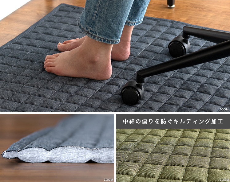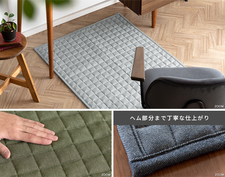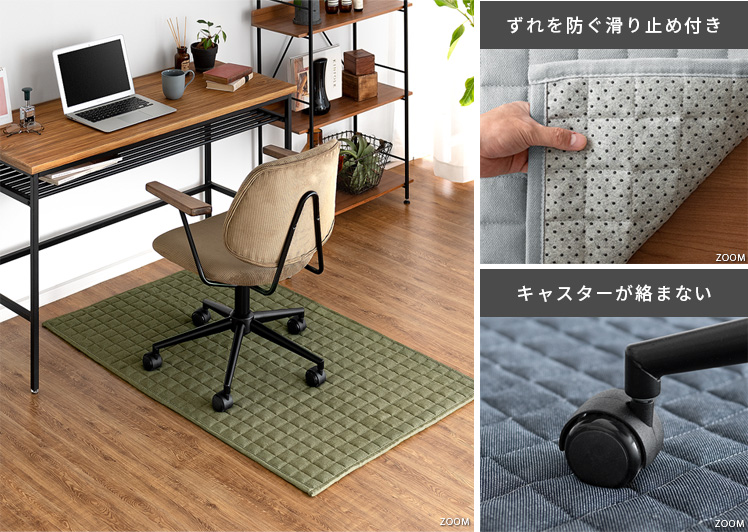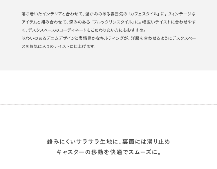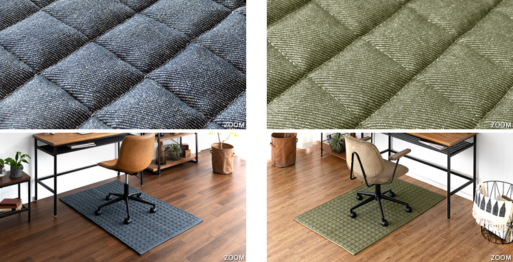 デニムデザインチェアマット 80×130cm/床の傷や汚れを防ぎながら、お部屋のコーディネートも楽しめるデニム調チェアマット。表地はキャスターが絡まないデニムデザイン生地で、裏面には滑り止め付き。スムーズに移動可能で、快適に作業していただけます。サラッとした生地に、中には弾力のある固綿をたっぷり詰め込み、心地よいクッション性と肌触りを実現いたしました。お部屋にそっと溶け込む、デニムデザイン生地のカジュアルな風合いも魅力の1つ。シンプルデザインで、カフェスタイルからブルックリンスタイルなど幅広いテイストに合わせていただけます。