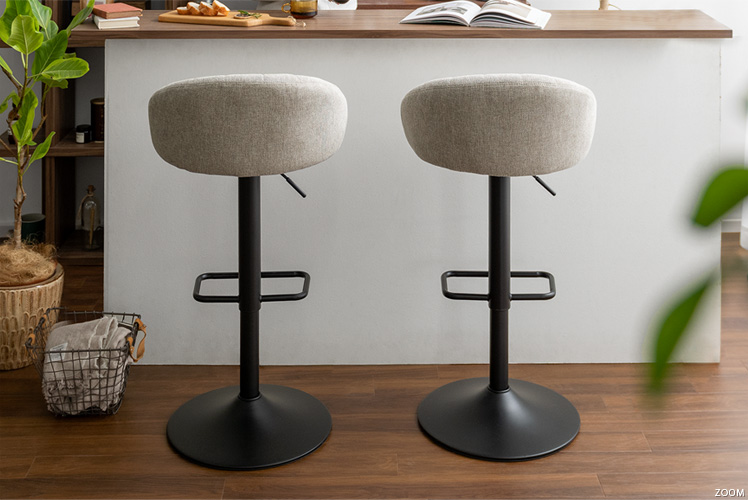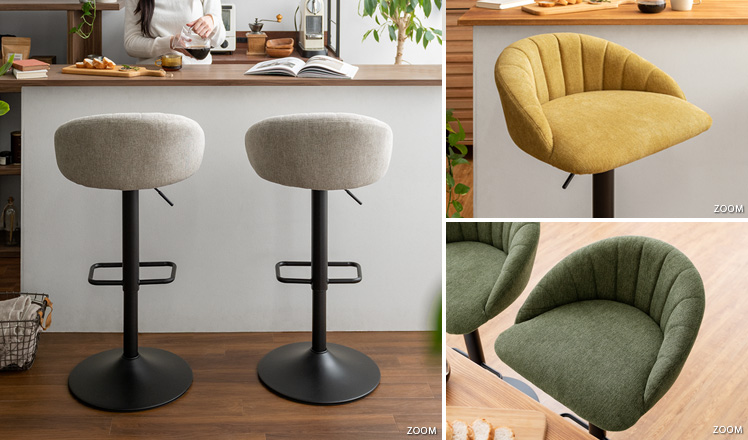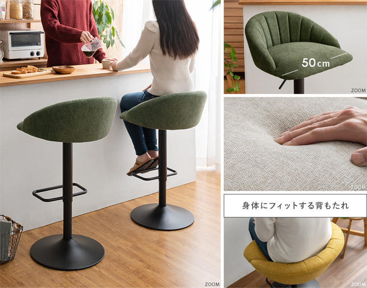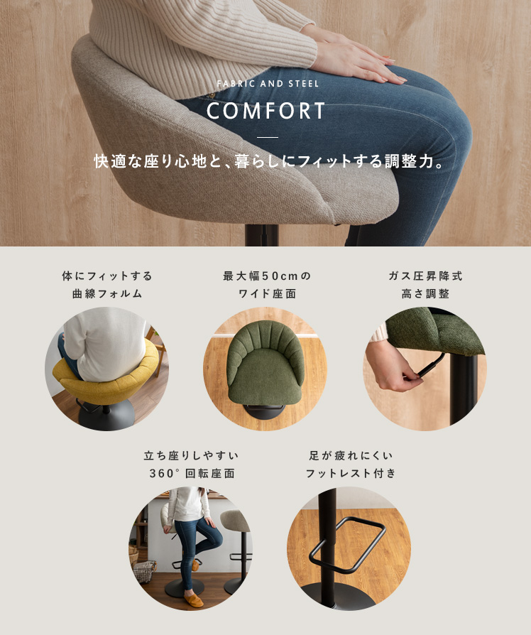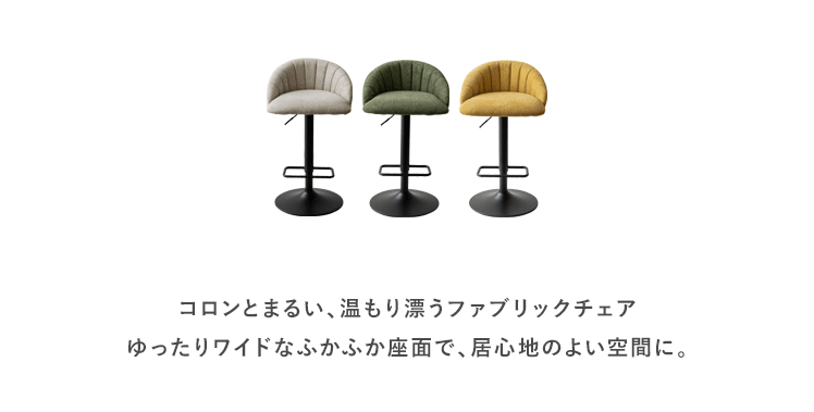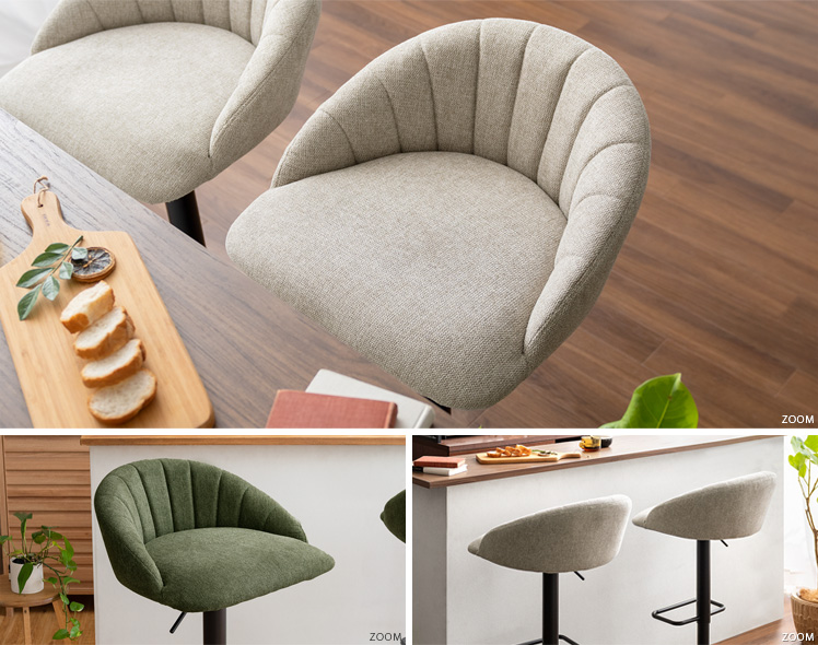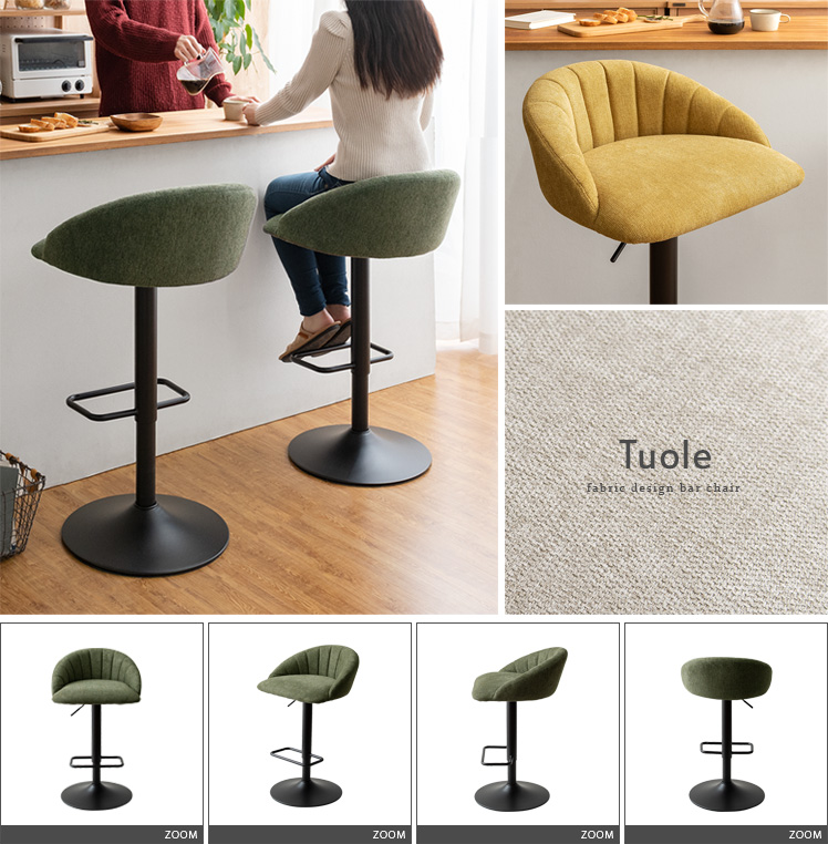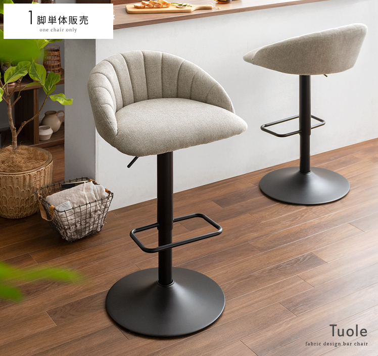 バーチェア Tuole〔テュオレ〕 1脚単体販売/コロンとまるみを帯びた、温もり漂うファブリック素材のバーチェア”Tuole(テュオレ)”温かみを感じるデザインがお部屋の雰囲気を高め、カフェのような素敵な空間を演出。座面幅は、幅約50cmとワイドなサイズで男性でもゆったりと快適に。さらに身体のラインにフィットする丸みを帯びた背もたれを採用し、優しく包み込まれるような座り心地を実現いたしました。また、高さ調節や360度回転座面も採用した、使い勝手の良いバーチェアとなっております。表情豊かなファブリック素材のバーチェアで、ゆったりとした時間が流れる空間をご自宅に。