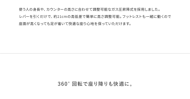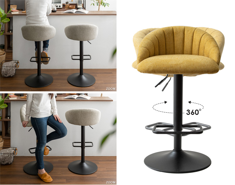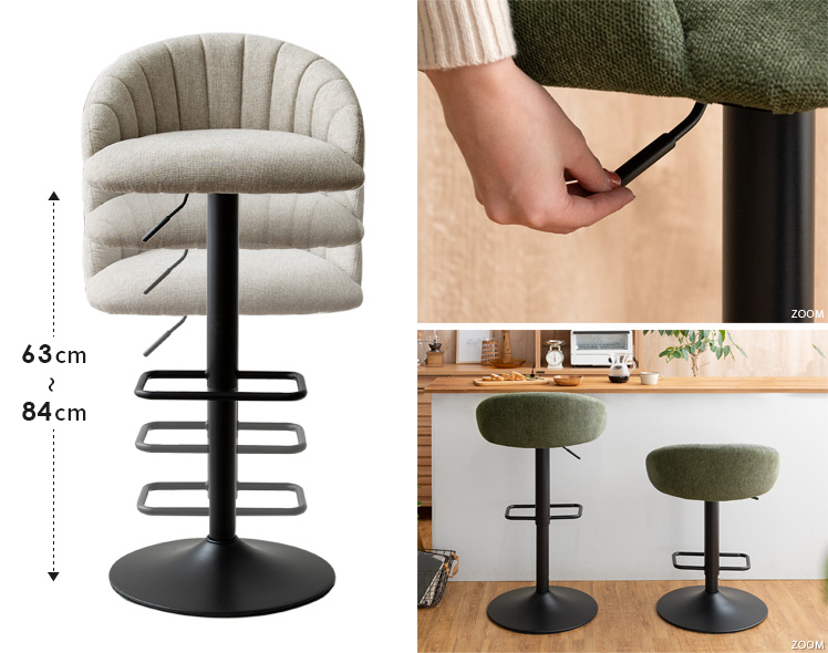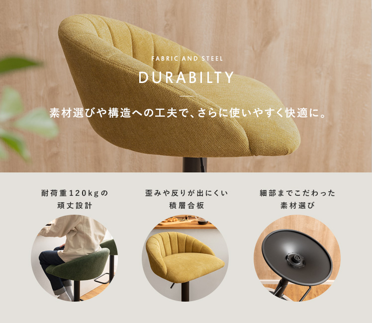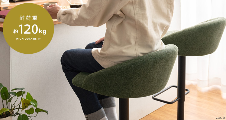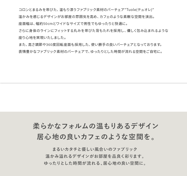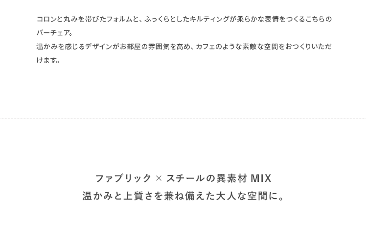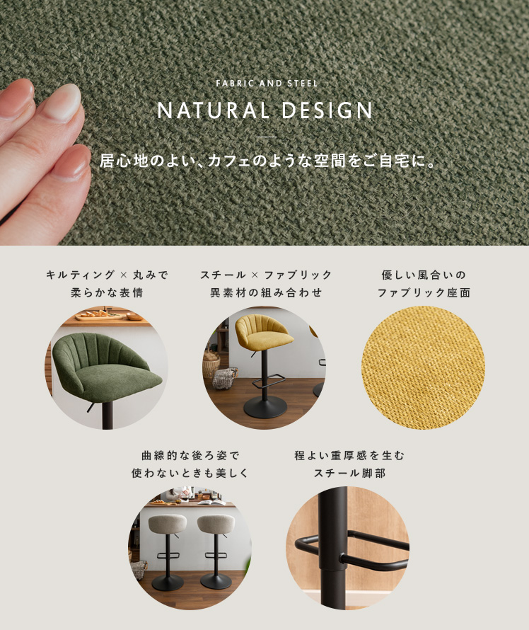 バーチェア Tuole〔テュオレ〕 1脚単体販売/コロンとまるみを帯びた、温もり漂うファブリック素材のバーチェア”Tuole(テュオレ)”温かみを感じるデザインがお部屋の雰囲気を高め、カフェのような素敵な空間を演出。座面幅は、幅約50cmとワイドなサイズで男性でもゆったりと快適に。さらに身体のラインにフィットする丸みを帯びた背もたれを採用し、優しく包み込まれるような座り心地を実現いたしました。また、高さ調節や360度回転座面も採用した、使い勝手の良いバーチェアとなっております。表情豊かなファブリック素材のバーチェアで、ゆったりとした時間が流れる空間をご自宅に。