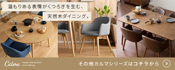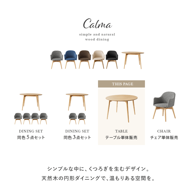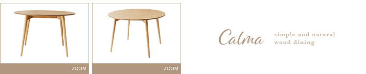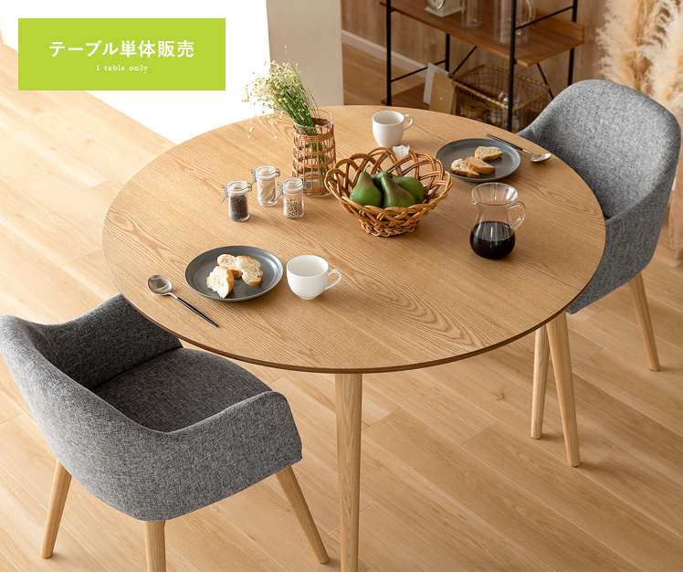 ウッドダイニング Calma〔カルマ〕円形テーブル単体販売/お部屋に上質な温もりを添える天然木ダイニングシリーズ”Calma(カルマ)”ウッドパーツには、きめ細やかな木目が美しいアッシュ材天然木を使用。シンプルな佇まいに上質さを感じる美しいデザインとなっております。また、毎日お使いいただくダイニングの、快適性にもこだわりました。チェアは美しい見栄えながら、360°回転式で、サッと立ち座り可能。円形テーブルは、直径110cmと4人でも食事をゆったりと取っていただける広々サイズに仕上げました。シンプルな中にくつろぎを生む天然木ダイニングで、日々の暮らしをより素敵なひとときに。