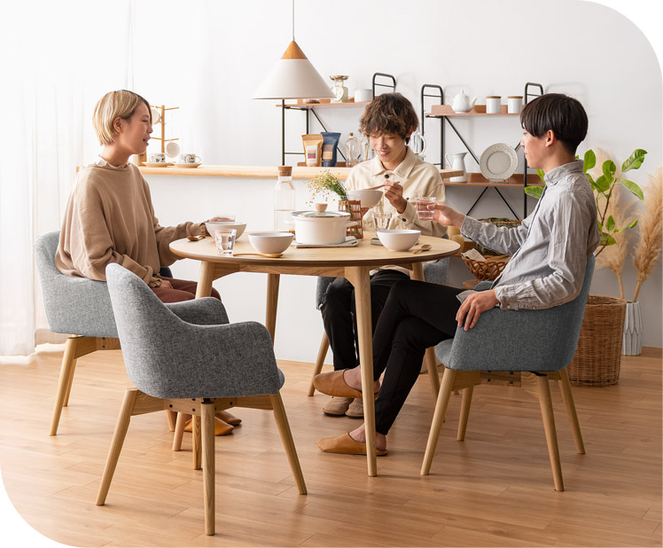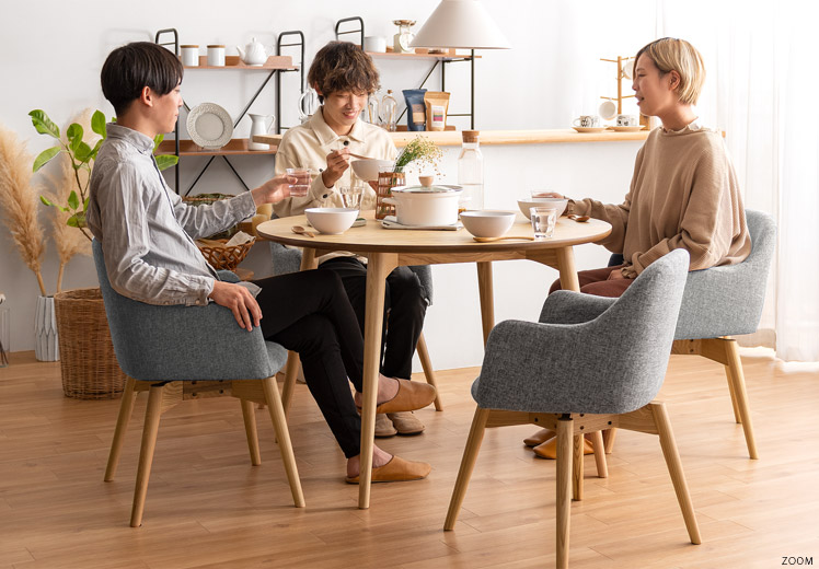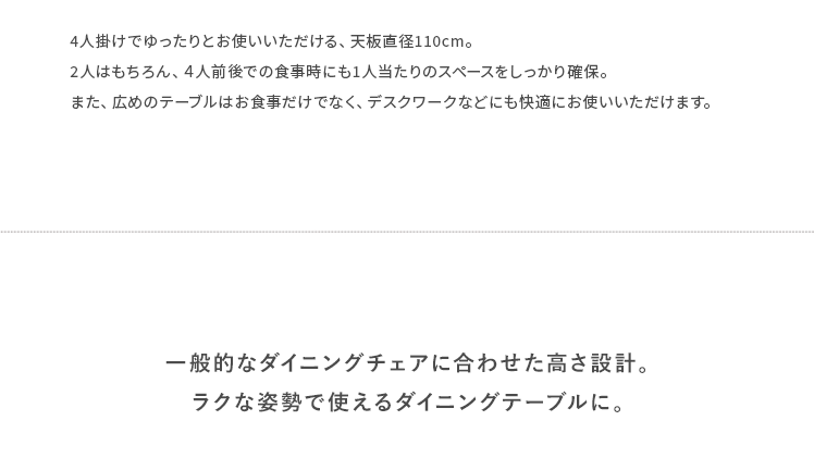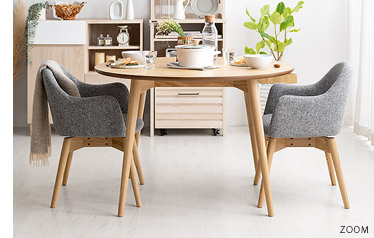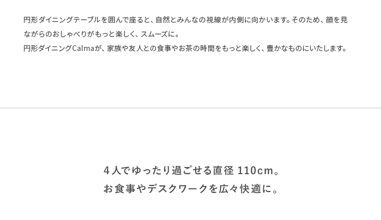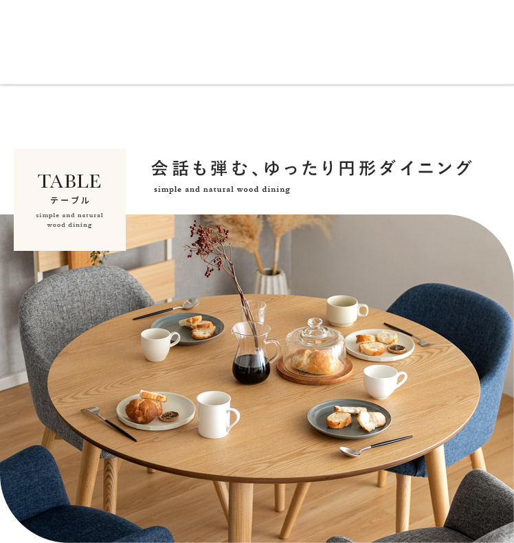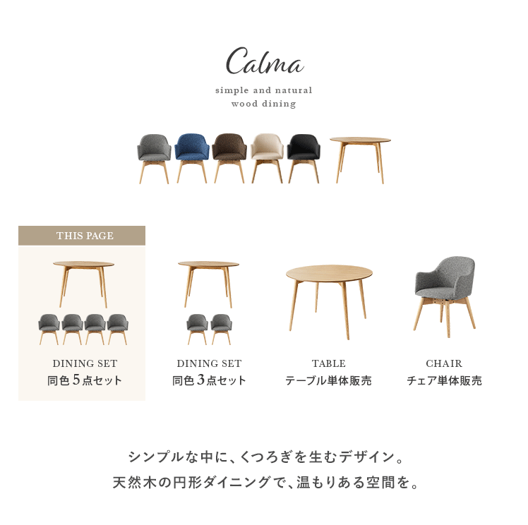 ウッドダイニング Calma〔カルマ〕円形テーブル&回転式チェア5点セット/お部屋に上質な温もりを添える天然木ダイニングシリーズ”Calma(カルマ)”ウッドパーツには、きめ細やかな木目が美しいアッシュ材天然木を使用。シンプルな佇まいに上質さを感じる美しいデザインとなっております。また、毎日お使いいただくダイニングの、快適性にもこだわりました。チェアは美しい見栄えながら、360°回転式で、サッと立ち座り可能。円形テーブルは、直径110cmと4人でも食事をゆったりと取っていただける広々サイズに仕上げました。シンプルな中にくつろぎを生む天然木ダイニングで、日々の暮らしをより素敵なひとときに。