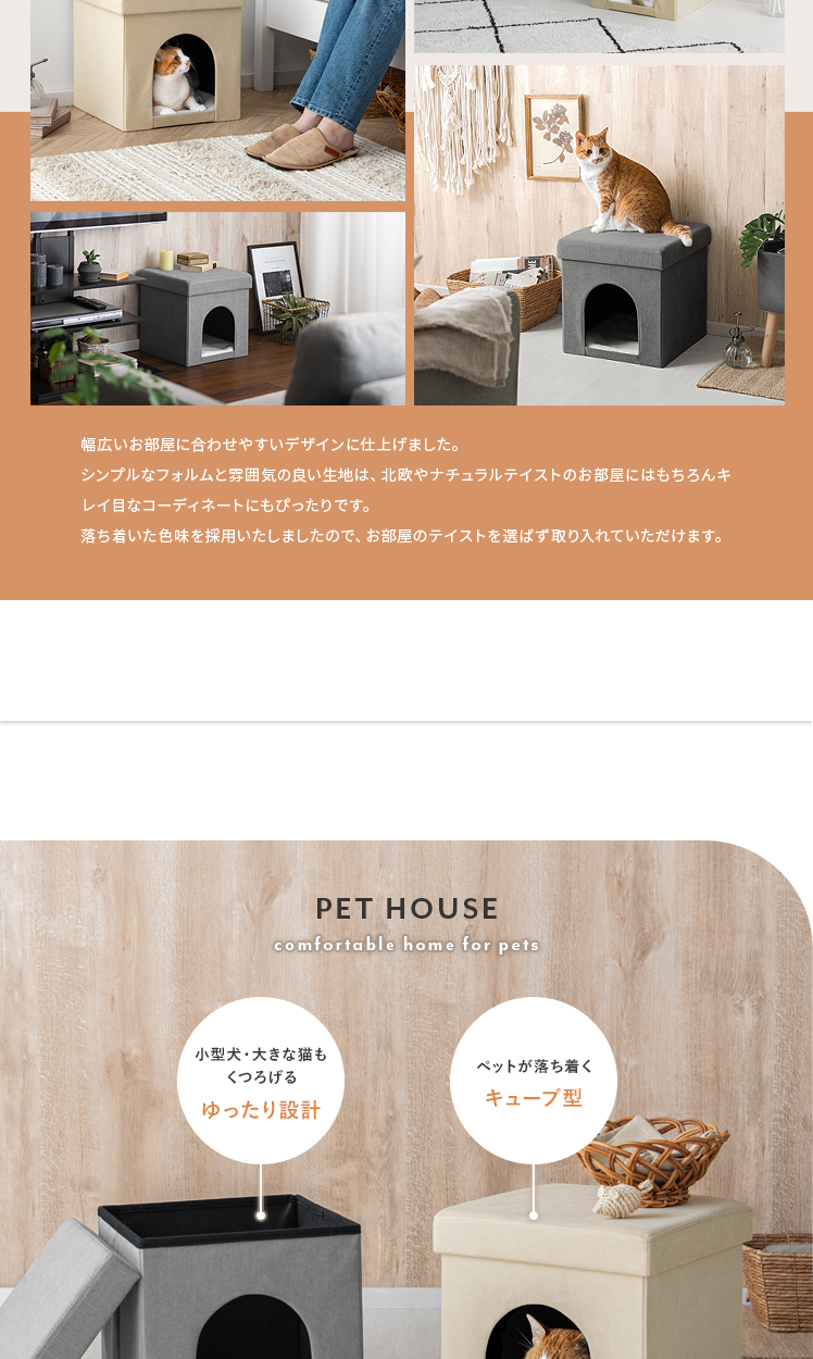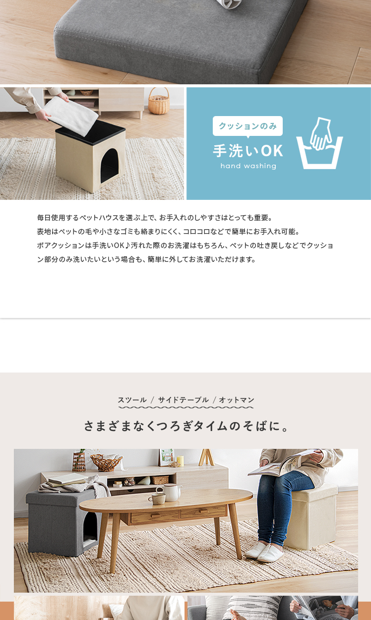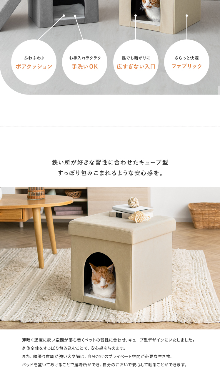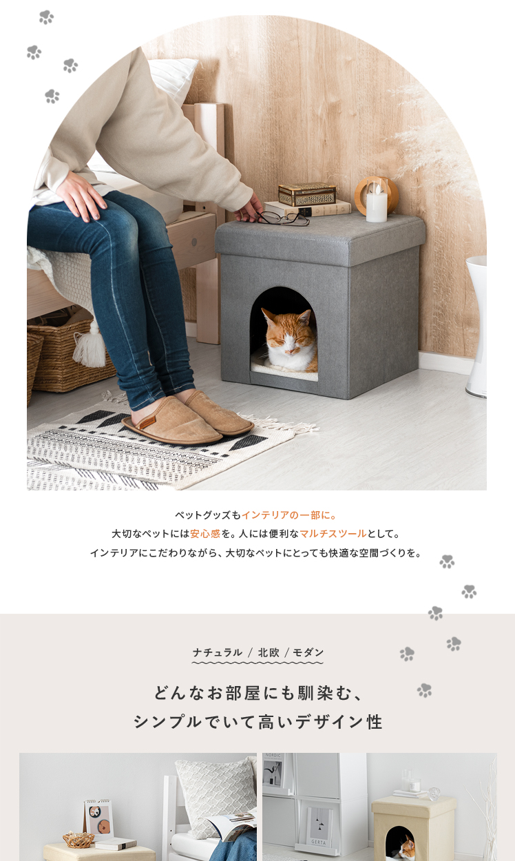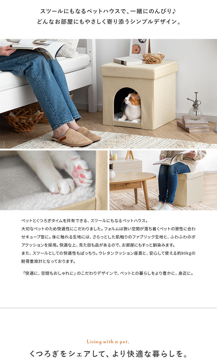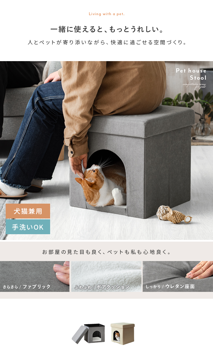 ペットハウススツール/ペットとくつろぎタイムを共有できる、スツールにもなるペットハウス。大切なペットのため快適性にこだわりました。フォルムは狭い空間が落ち着くペットの習性に合わせキューブ型に。体に触れる生地には、さらっとした肌触りのファブリック生地と、ふわふわのボアクッションを採用。快適な上、見た目も品があるので、お部屋にもすっと馴染みます。また、スツールとしての快適性もばっちり。ウレタンクッション座面と、安心して使える約80kgの高耐荷重設計となっております。「快適に、空間もおしゃれに」のこだわりデザインで、ペットとの暮らしをより豊かに、身近に。