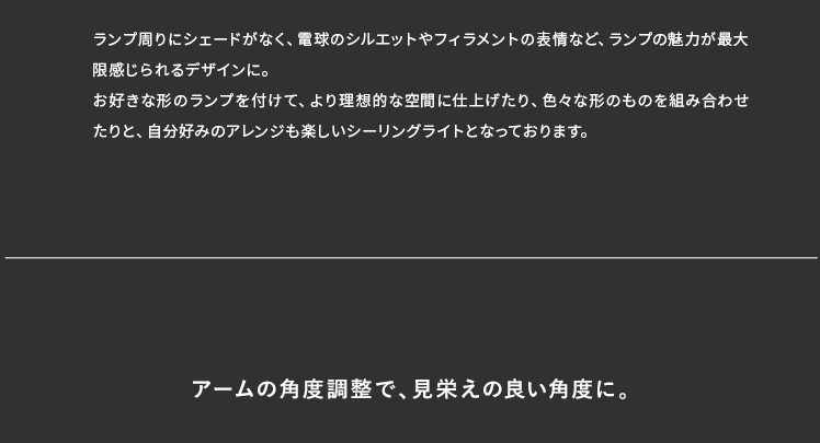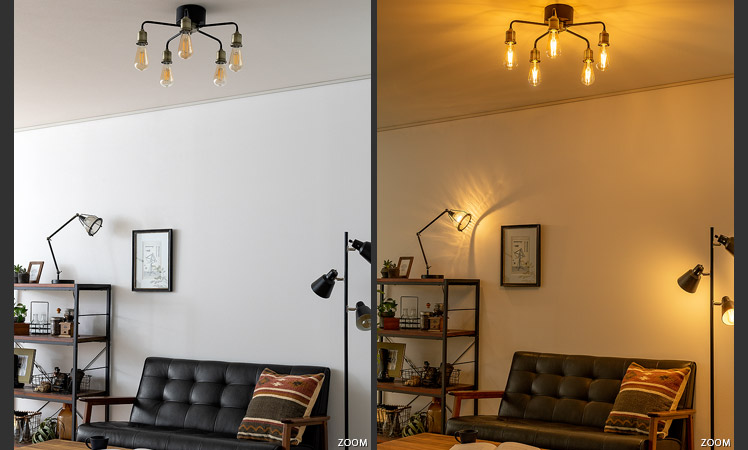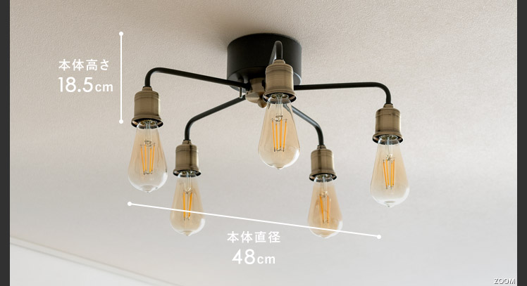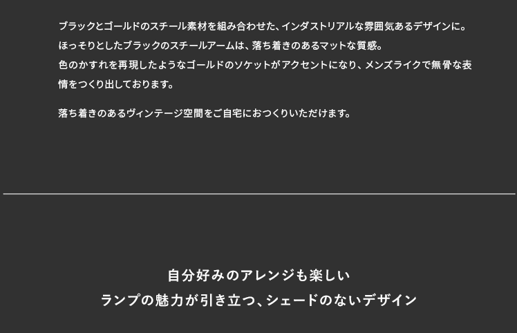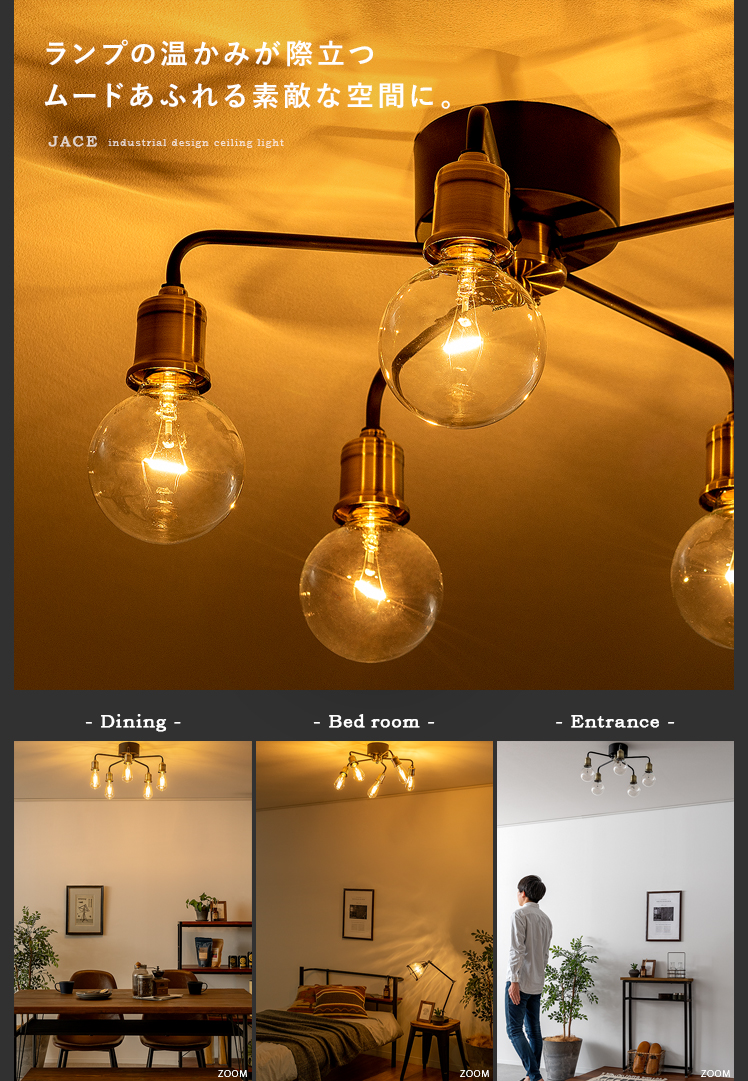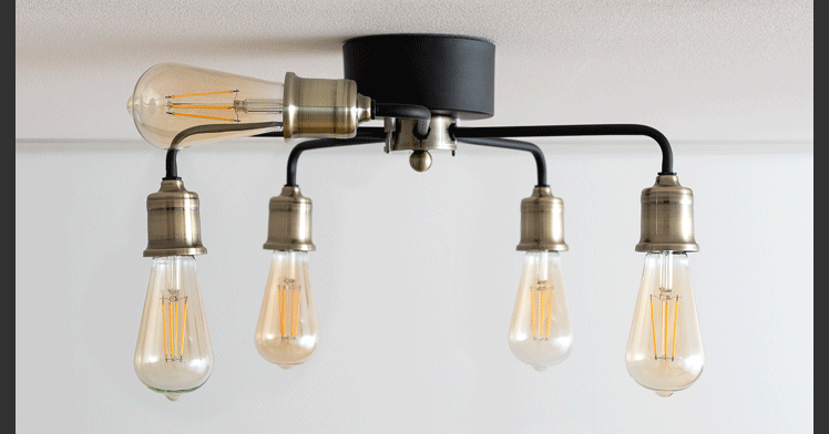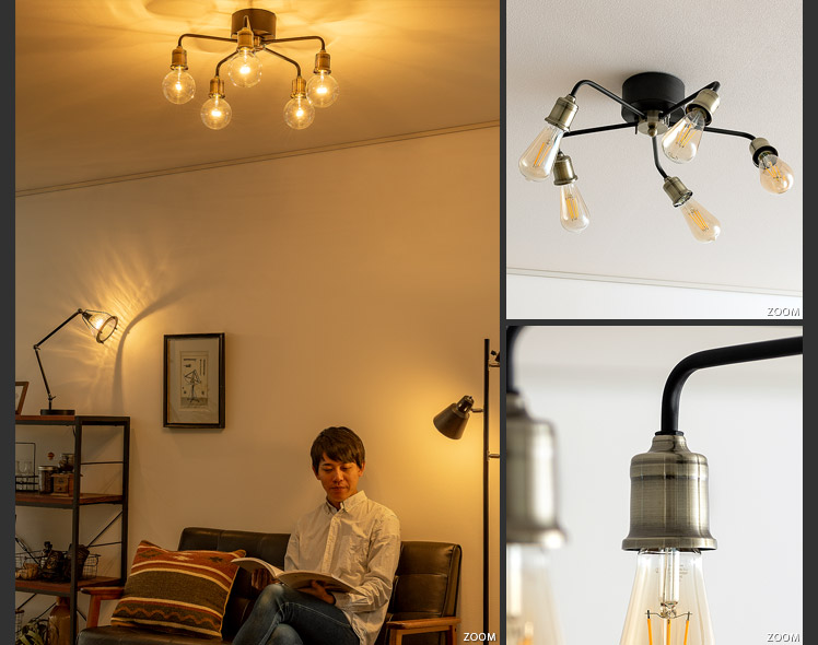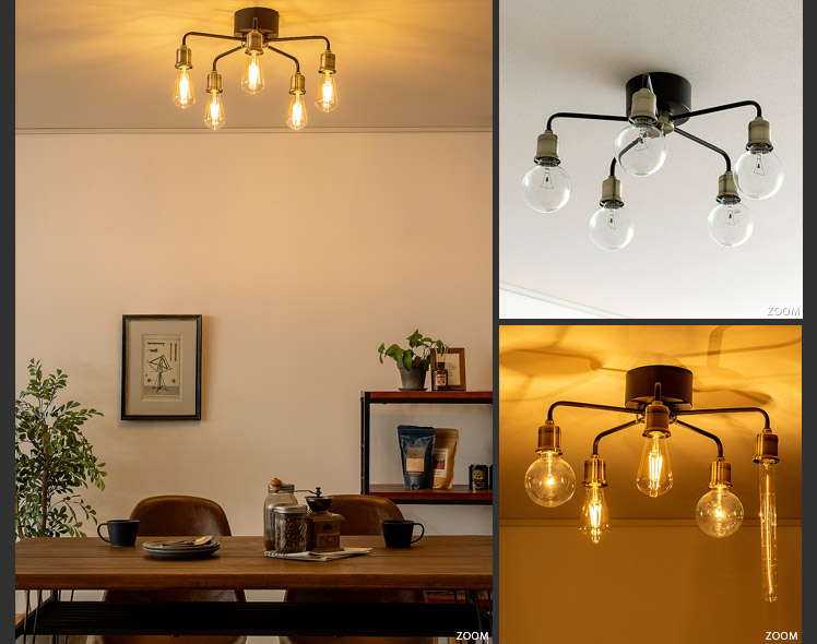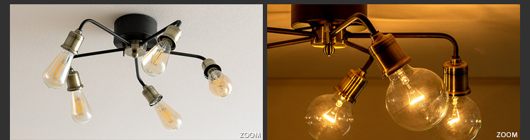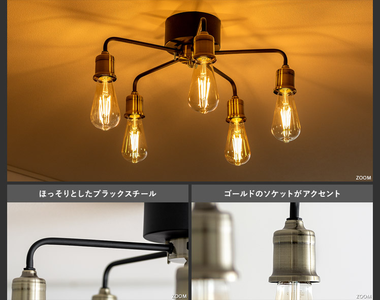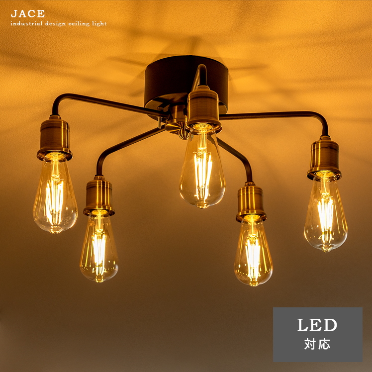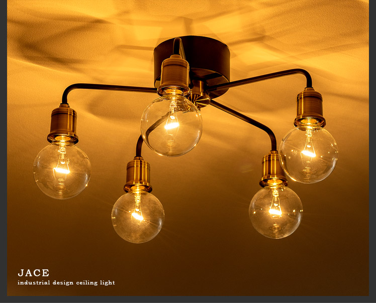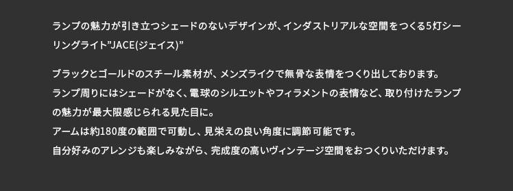 インダストリアルデザイン5灯シーリングライト JACE〔ジェイス〕/ランプの魅力が引き立つシェードのないデザインが、インダストリアルな空間をつくる5灯シーリングライト”JACE(ジェイス)”ブラックとゴールドのスチール素材が、メンズライクで無骨な表情をつくり出しております。ランプ周りにはシェードがなく、電球のシルエットやフィラメントの表情など、取り付けたランプの魅力が最大限感じられる見た目に。アームは約180度の範囲で可動し、見栄えの良い角度に調節可能です。自分好みのアレンジも楽しみながら、完成度の高いヴィンテージ空間をおつくりいただけます。