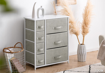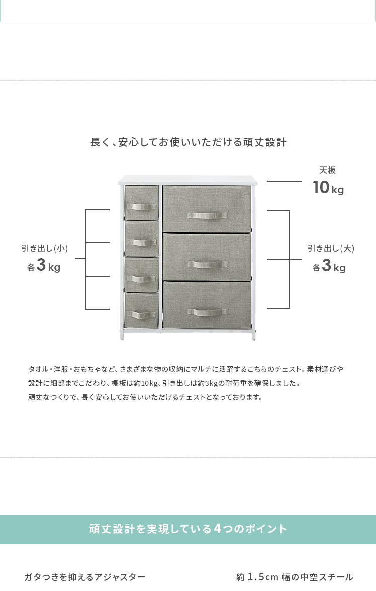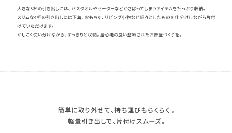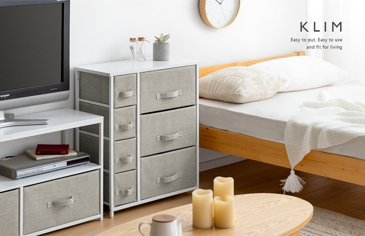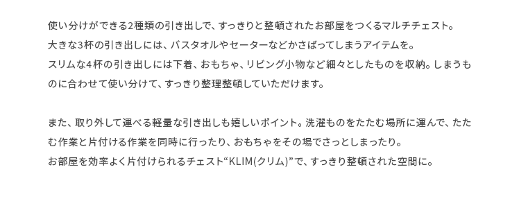 マルチチェスト KLIM〔クリム〕7杯タイプ [幅64]/使い分けができる2種類の引き出しで、すっきりと整頓されたお部屋をつくるマルチチェスト。大きな3杯の引き出しには、バスタオルやセーターなどかさばってしまうアイテムを。スリムな4杯の引き出しには下着、おもちゃ、リビング小物など細々としたものを収納。しまうものに合わせて使い分けて、すっきり整理整頓していただけます。また、取り外して運べる軽量な引き出しも嬉しいポイント。洗濯ものをたたむ場所に運んで、たたむ作業と片付ける作業を同時に行ったり、おもちゃをその場でさっとしまったり。お部屋を効率よく片付けられるチェスト“KLIM(クリム)”で、すっきり整頓された空間に。