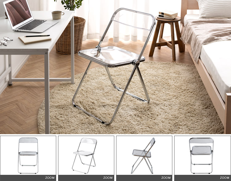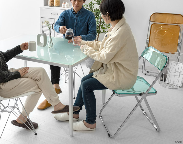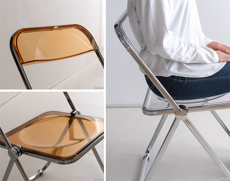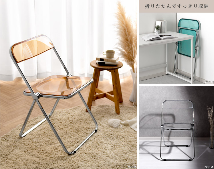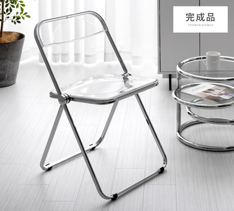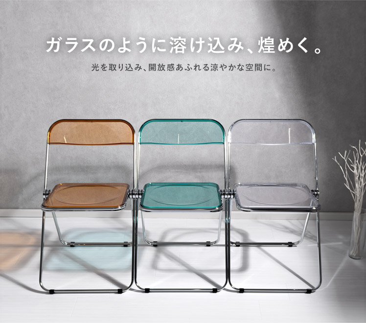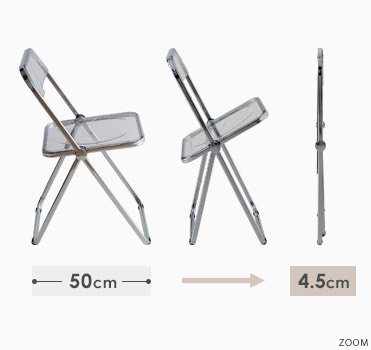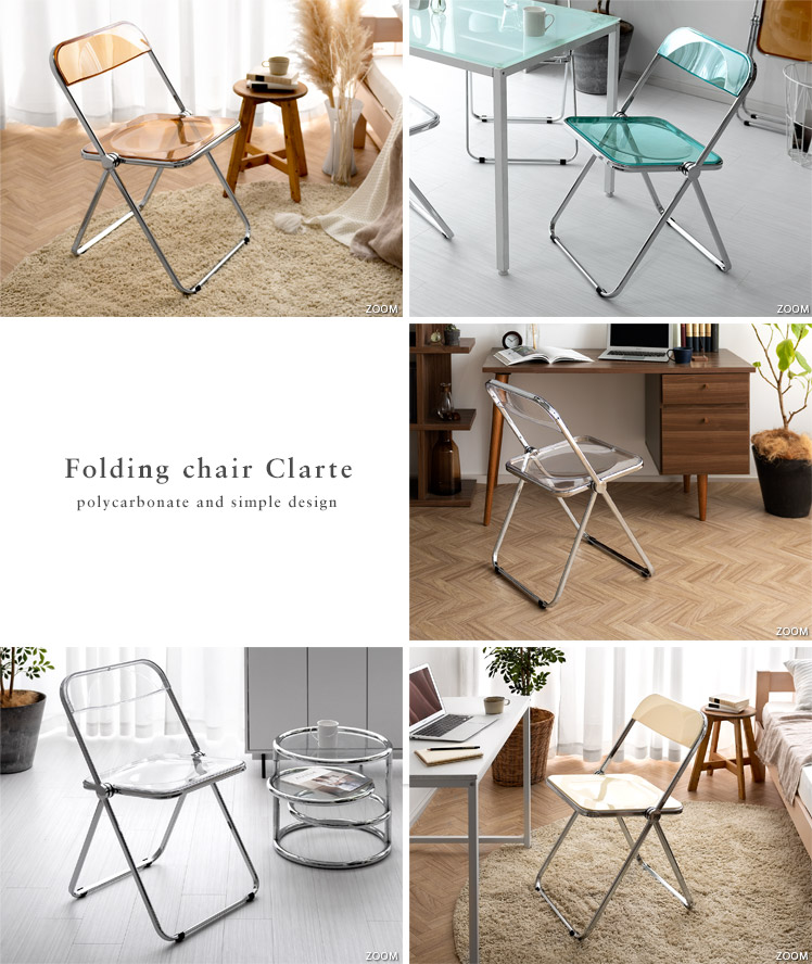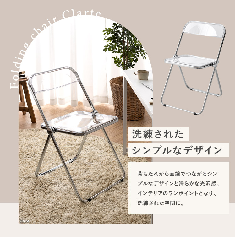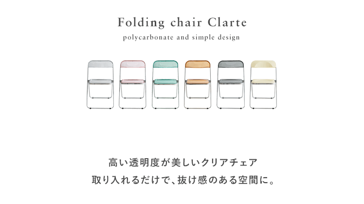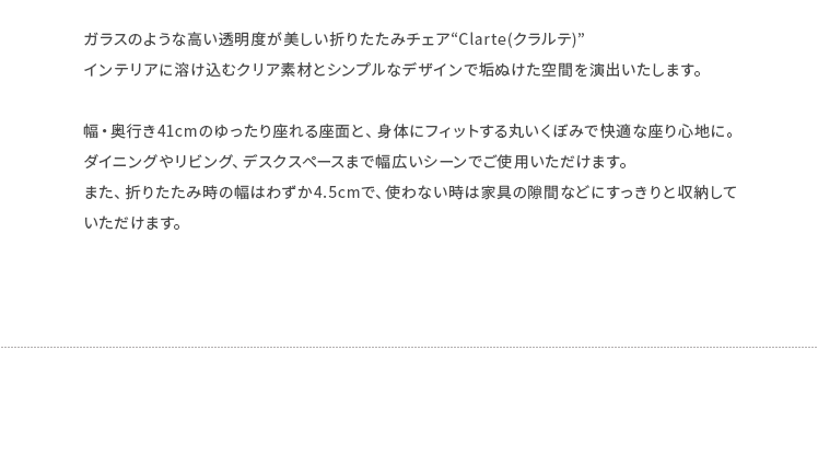 フォールディングチェア Clarte〔クラルテ〕 / ガラスのような高い透明度が美しい折りたたみチェア“Clarte(クラルテ)”インテリアに溶け込むクリア素材とシンプルなデザインで垢ぬけた空間を演出いたします。幅・奥行き41cmのゆったり座れる座面と、身体にフィットする丸いくぼみで快適な座り心地に。ダイニングやリビング、デスクスペースまで幅広いシーンでご使用いただけます。また、折りたたみ時の幅はわずか4.5cmで、使わない時は家具の隙間などにすっきりと収納していただけます。