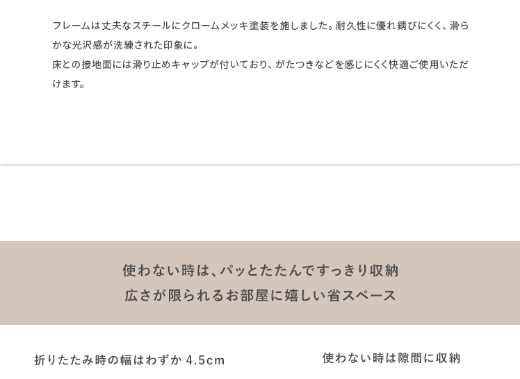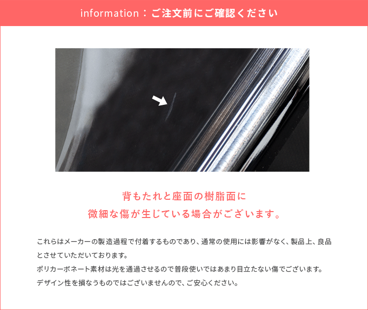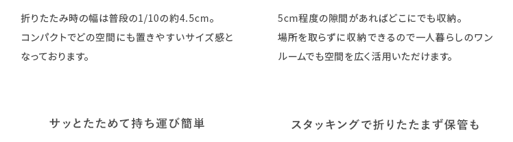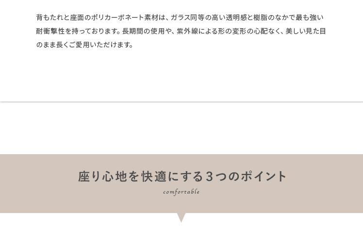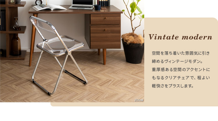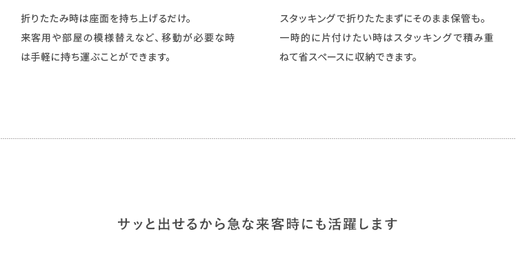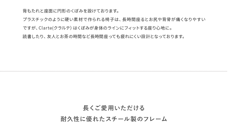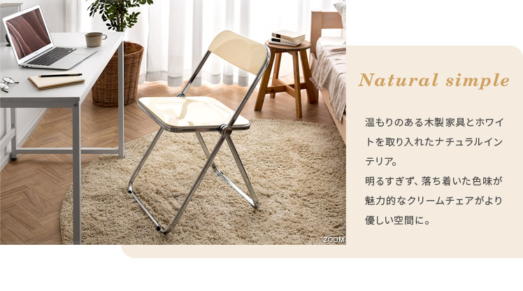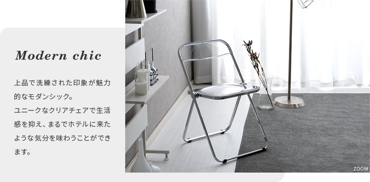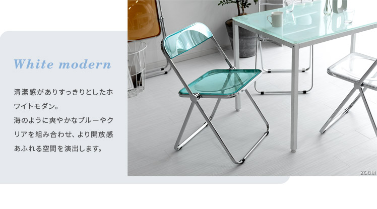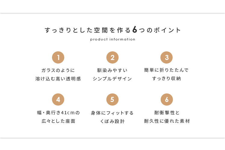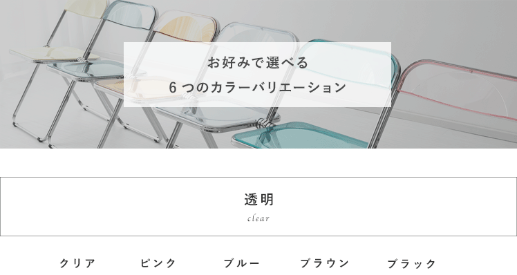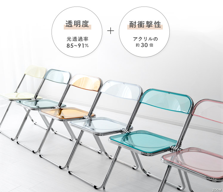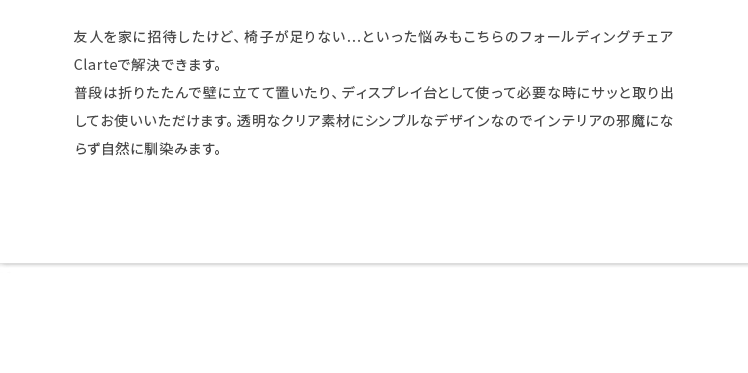 フォールディングチェア Clarte〔クラルテ〕 / ガラスのような高い透明度が美しい折りたたみチェア“Clarte(クラルテ)”インテリアに溶け込むクリア素材とシンプルなデザインで垢ぬけた空間を演出いたします。幅・奥行き41cmのゆったり座れる座面と、身体にフィットする丸いくぼみで快適な座り心地に。ダイニングやリビング、デスクスペースまで幅広いシーンでご使用いただけます。また、折りたたみ時の幅はわずか4.5cmで、使わない時は家具の隙間などにすっきりと収納していただけます。