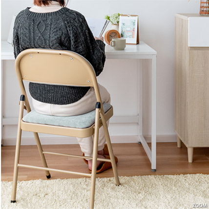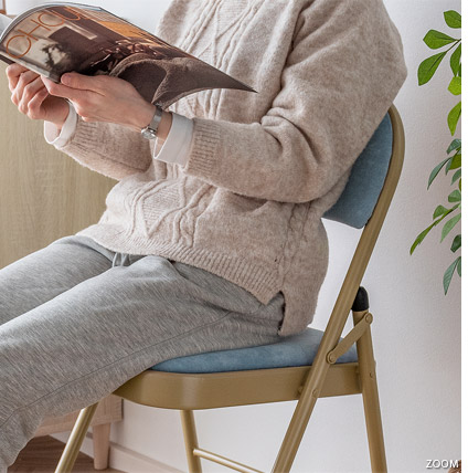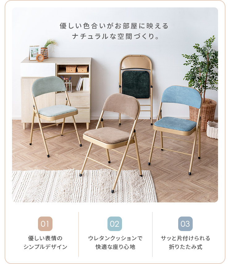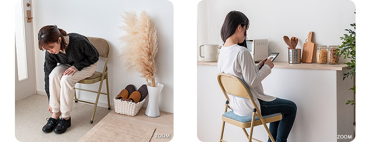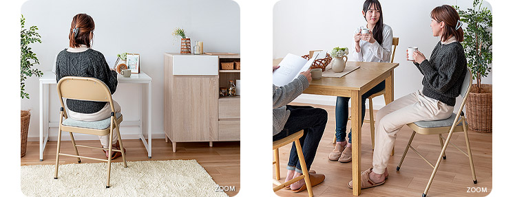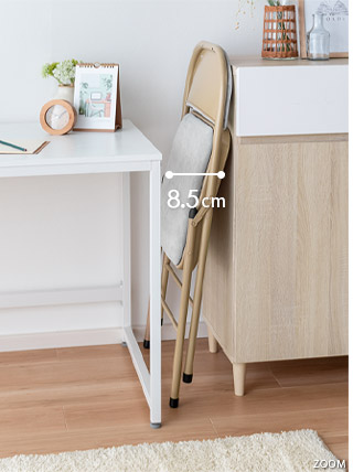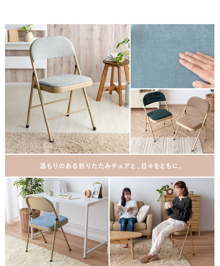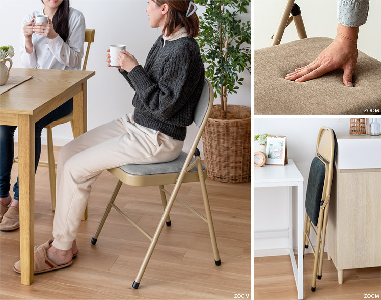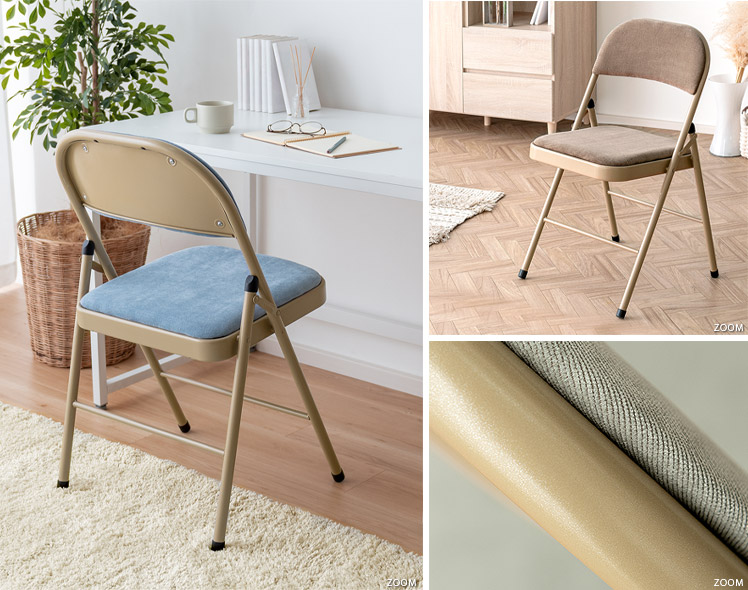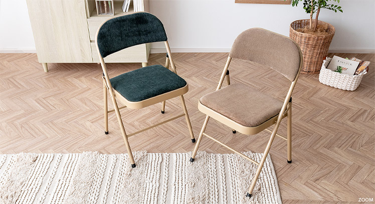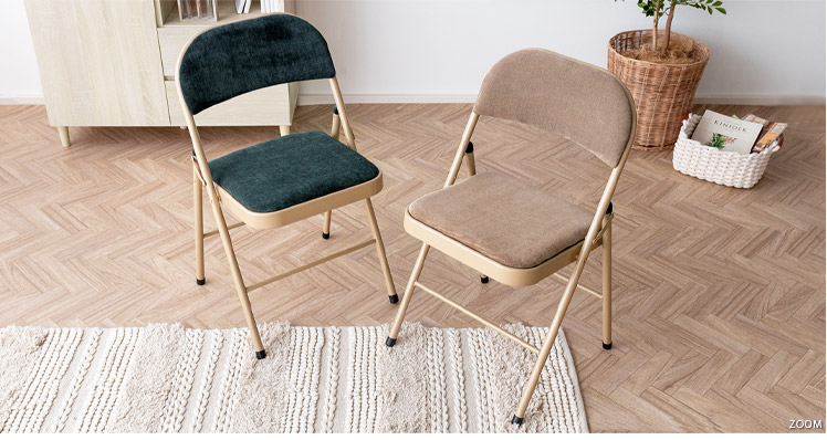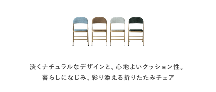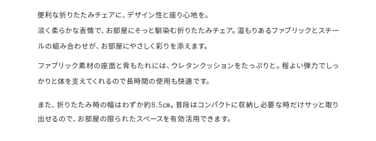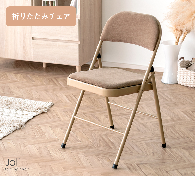 折りたたみチェア Joli〔ジョリ〕/便利な折りたたみチェアに、デザイン性と座り心地を。淡く柔らかな表情で、お部屋にそっと馴染む折りたたみチェア。温もりあるファブリックとスチールの組み合わせが、お部屋にやさしく彩りを添えます。ファブリック素材の座面と背もたれには、ウレタンクッションをたっぷりと。程よい弾力でしっかりと体を支えてくれるので長時間の使用も快適です。また、折りたたみ時の幅はわずか約8.5cm。普段はコンパクトに収納し必要な時だけサッと取り出せるので、お部屋の限られたスペースを有効活用できます。デスクワークや来客時、玄関やキッチンなど、幅広いシーンで活躍♪