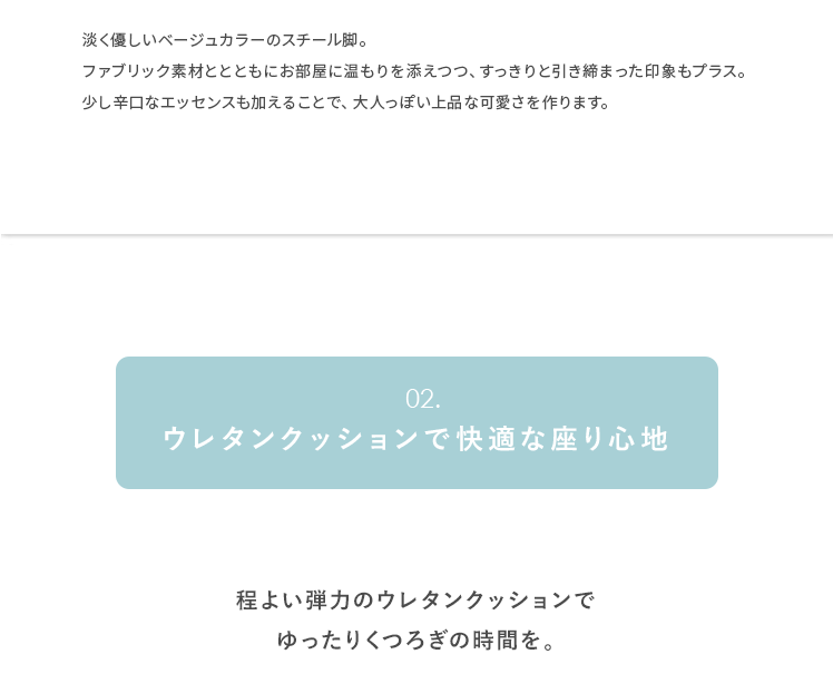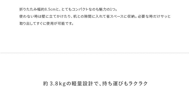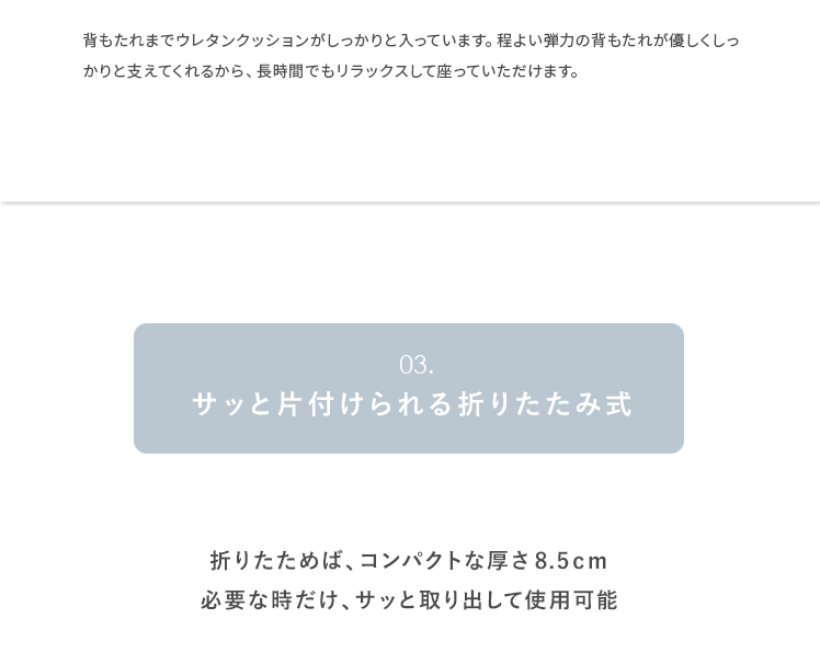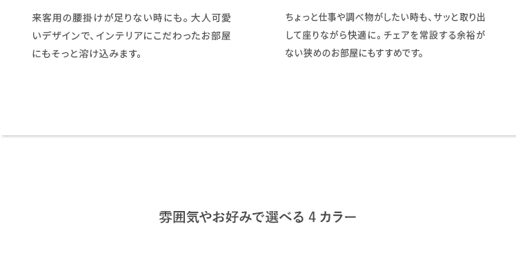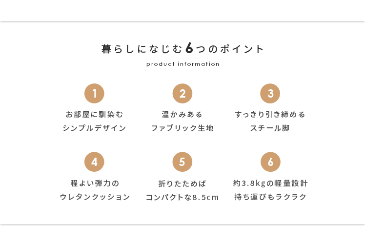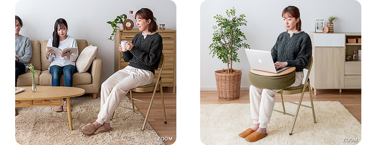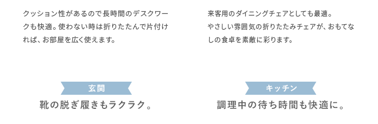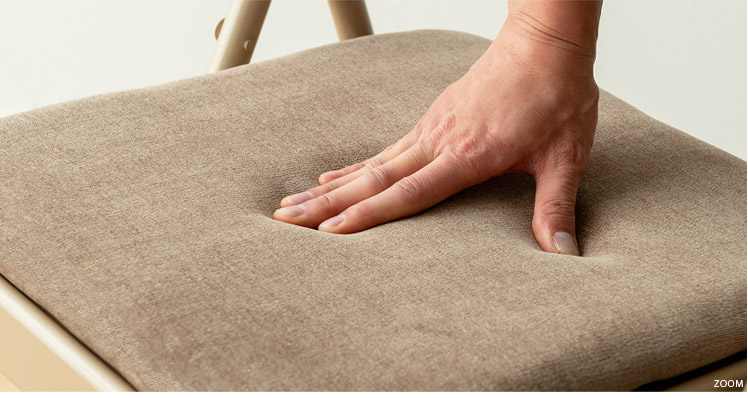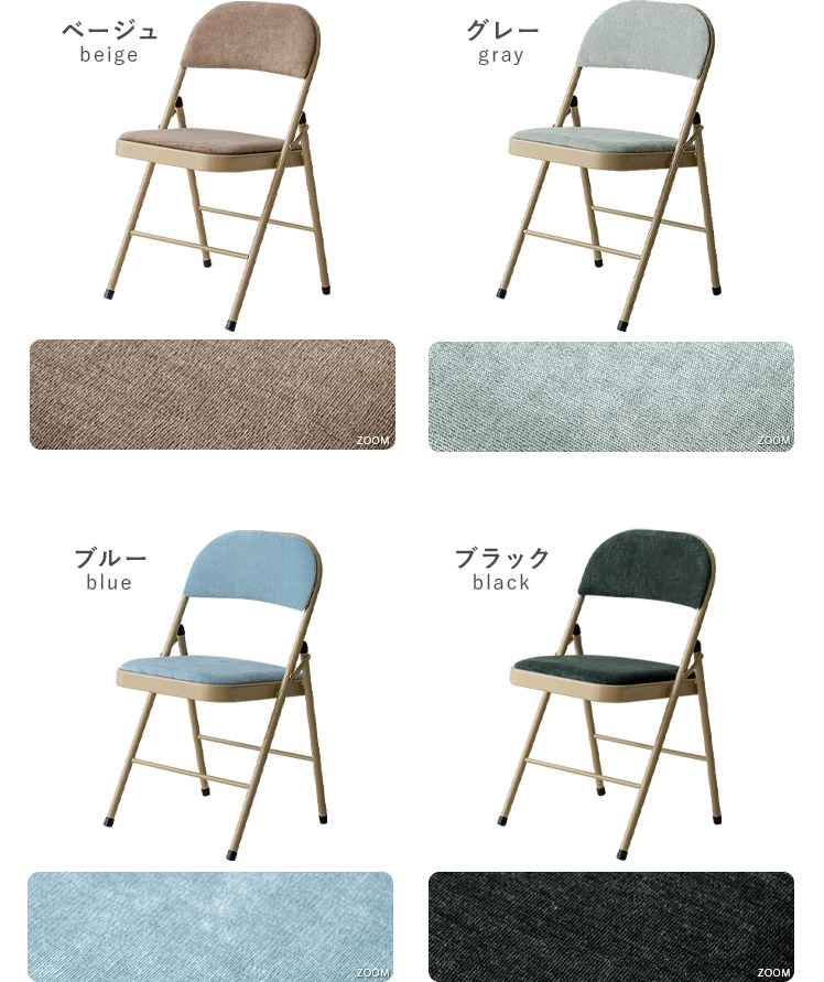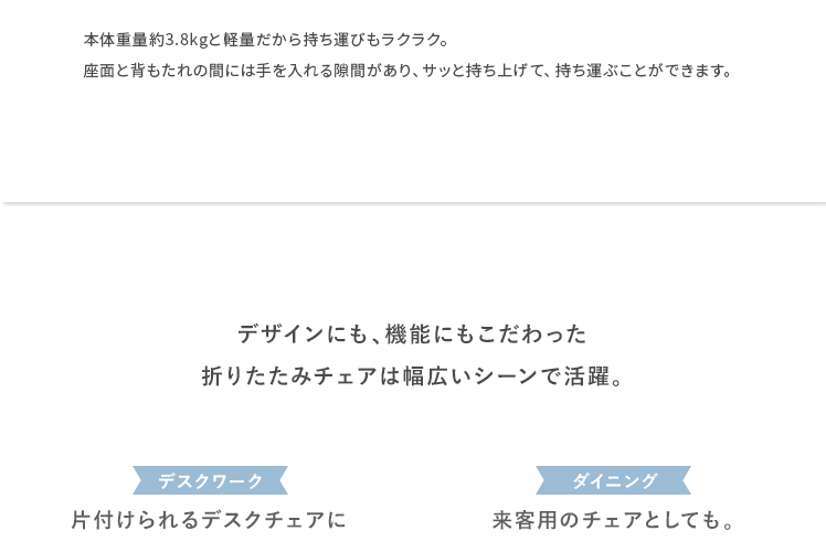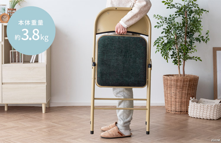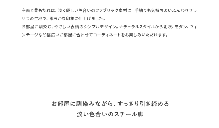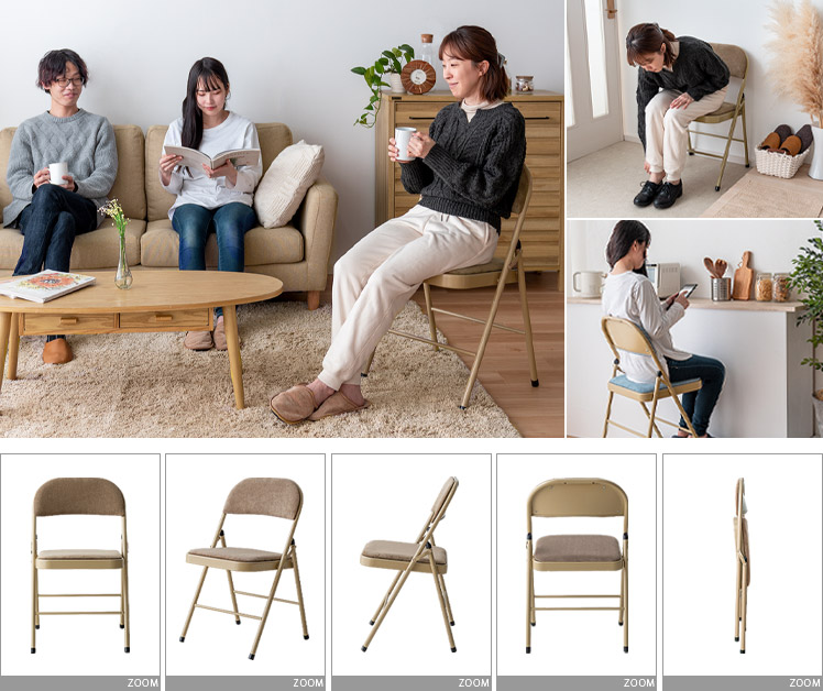 折りたたみチェア Joli〔ジョリ〕/便利な折りたたみチェアに、デザイン性と座り心地を。淡く柔らかな表情で、お部屋にそっと馴染む折りたたみチェア。温もりあるファブリックとスチールの組み合わせが、お部屋にやさしく彩りを添えます。ファブリック素材の座面と背もたれには、ウレタンクッションをたっぷりと。程よい弾力でしっかりと体を支えてくれるので長時間の使用も快適です。また、折りたたみ時の幅はわずか約8.5cm。普段はコンパクトに収納し必要な時だけサッと取り出せるので、お部屋の限られたスペースを有効活用できます。デスクワークや来客時、玄関やキッチンなど、幅広いシーンで活躍♪