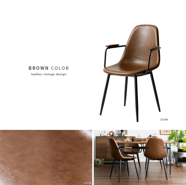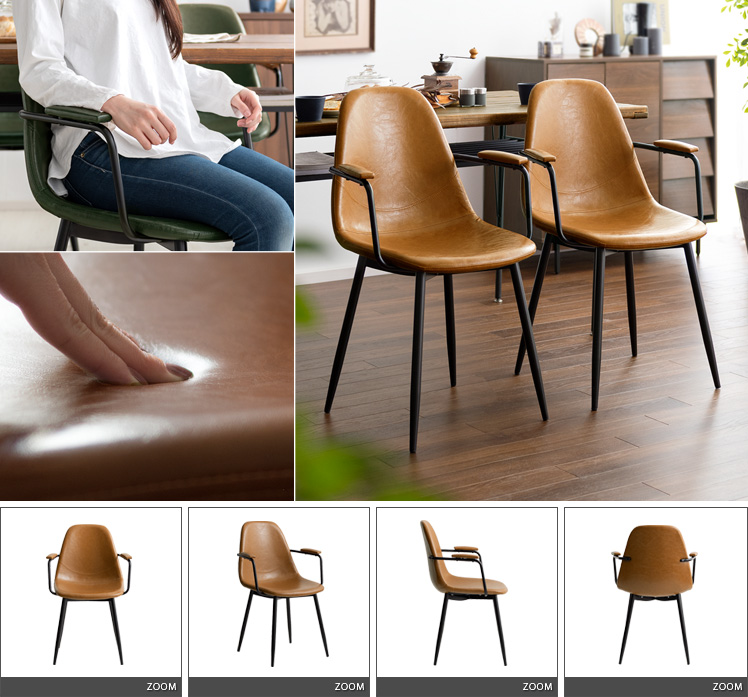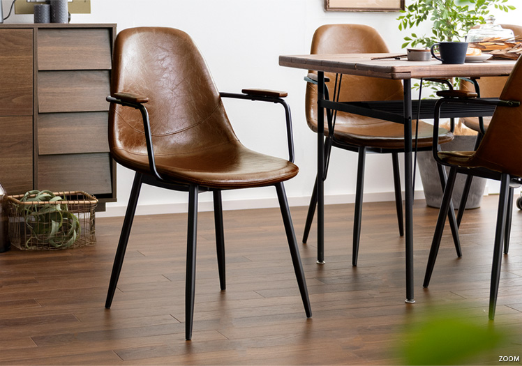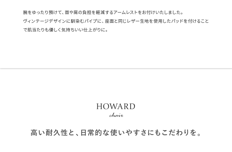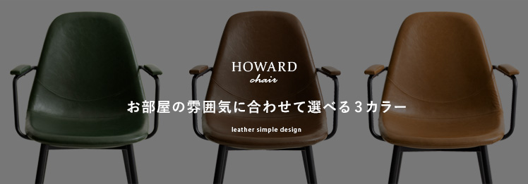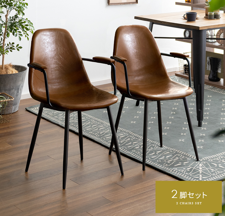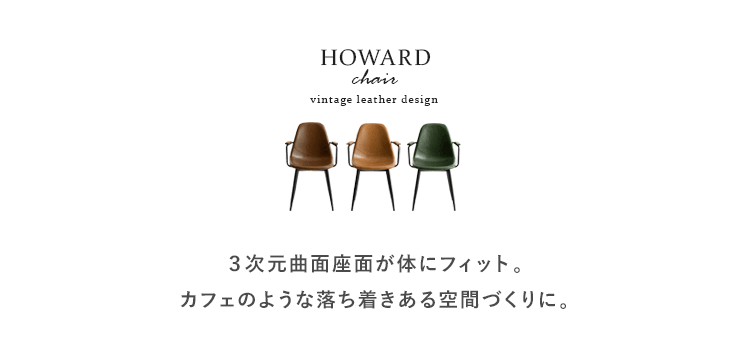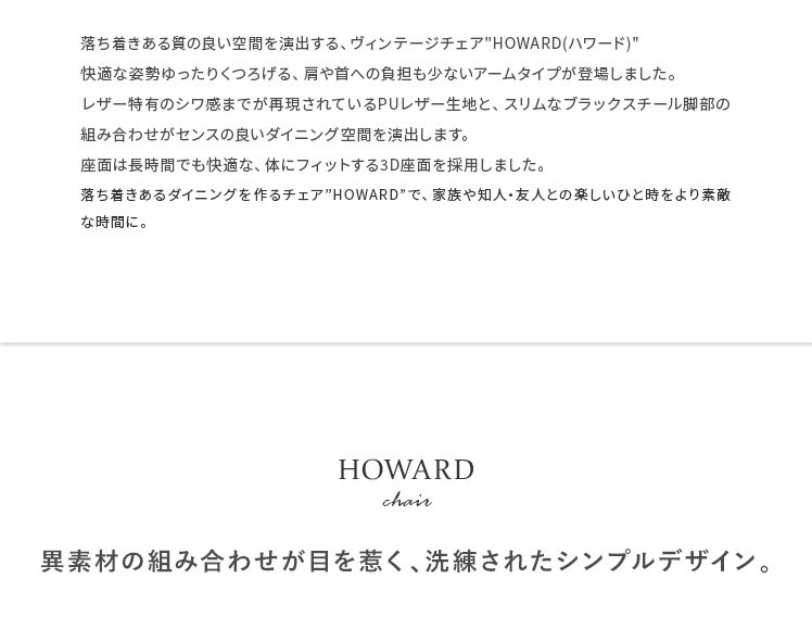 HOWARD CHAIR〔ハワードチェア〕 アーム付きタイプ 2脚セット販売/落ち着きある質の良い空間を演出する、ヴィンテージチェア"HOWARD(ハワード)"快適な姿勢ゆったりくつろげる、肩や首への負担も少ないアームタイプが登場しました。レザー特有のシワ感までが再現されているPUレザー生地と、スリムなブラックスチール脚部の組み合わせがセンスの良いダイニング空間を演出します。座面は長時間でも快適な、体にフィットする3D座面を採用しました。落ち着きあるダイニングを作るチェア”HOWARD”で、家族や知人・友人との楽しいひと時をより素敵な時間に。
