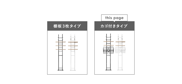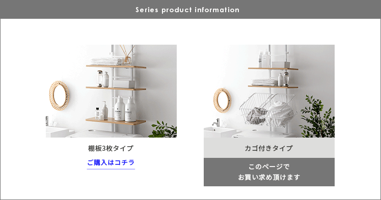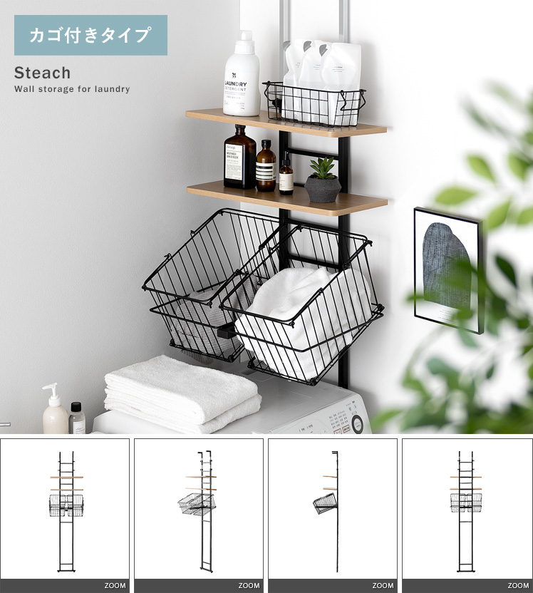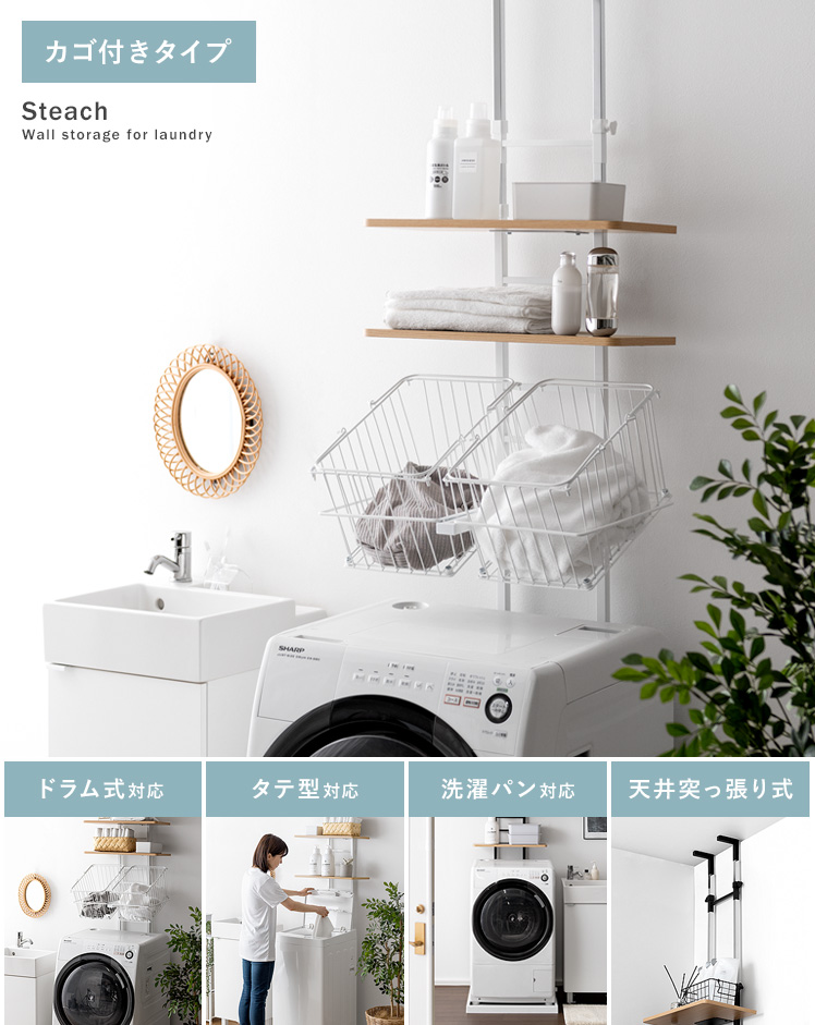 突っ張り式ランドリーラック Steach〔スティーチ〕カゴ付きタイプ/工事不要で、わずかな隙間に付けられる突っ張り式ランドリーラック “Steach(スティーチ)”洗濯パンがあってもそのまま設置可能。洗濯機の後ろや横のわずかなスペースを利用して、散らかりがちなランドリーに豊富な収納スペースをお作りいただけます。また、天井と床で固定する突っ張り式を採用。壁に穴をあける必要がなく手軽にご使用いただけるので、賃貸にお住まいの方や壁に穴を開けたくない方にもおすすめです。デッドスペースを賢く使って、すっきり整頓された空間を。