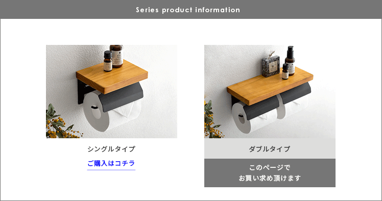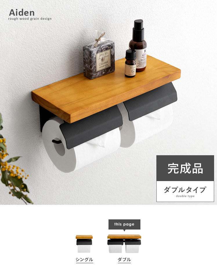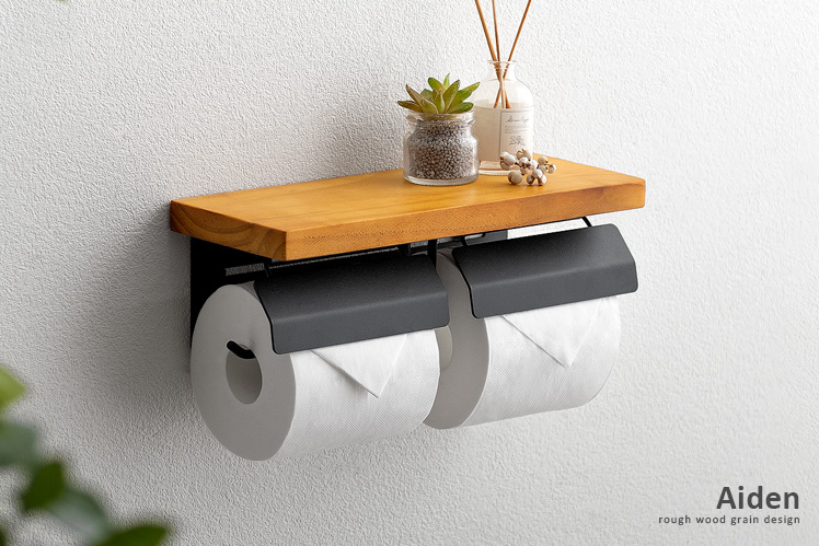 トイレットペーパーホルダー Aiden〔エイデン〕 ダブルタイプ/天然木パイン集成材の天板に、マットなブラックスチールを組み合わせたトイレットペーパーホルダー “Aiden(エイデン)”どこか温かみを感じる本物の木の質感と、ザラつきのあるスチールの組み合わせが、無骨な雰囲気漂うインテリア性の高いトイレ空間を演出いたします。また、天板スペースはスマホを置いたり、ディフューザーや植物を飾ったりと、ちょい置きスペースとしても便利にご使用いただけます。程よいラフな表情が作る、カフェのお手洗いのような上質なトイレ空間をご自宅に。