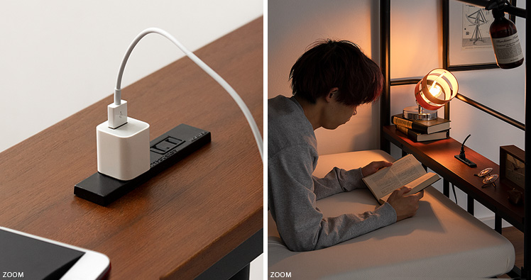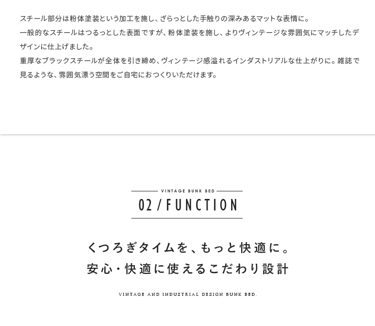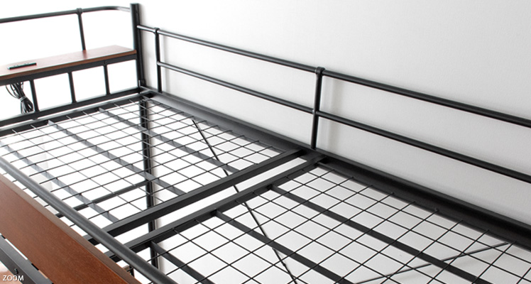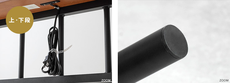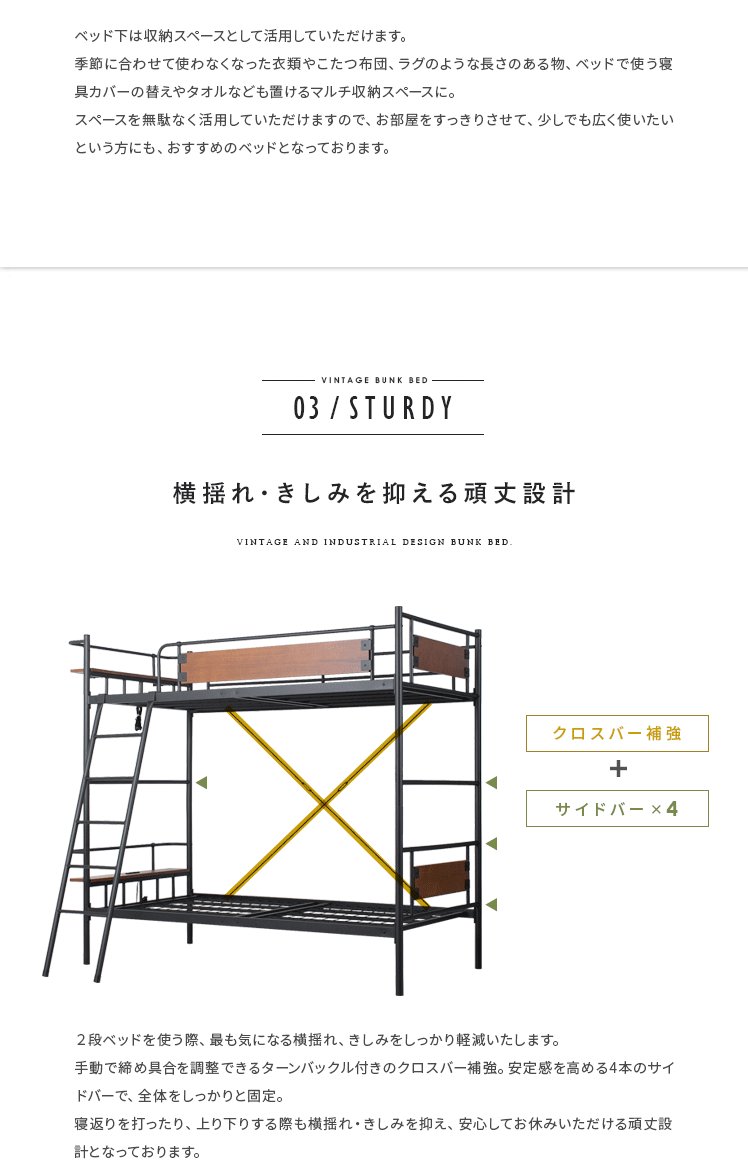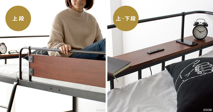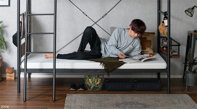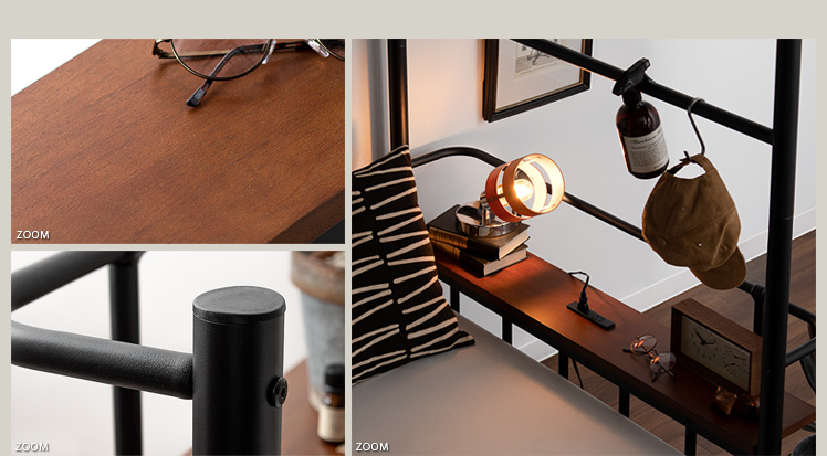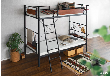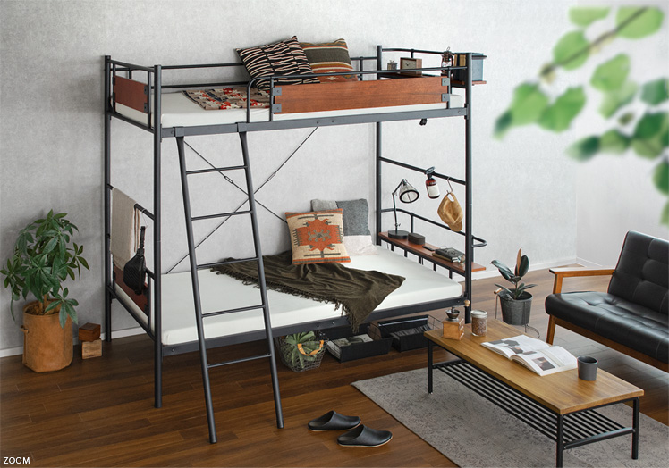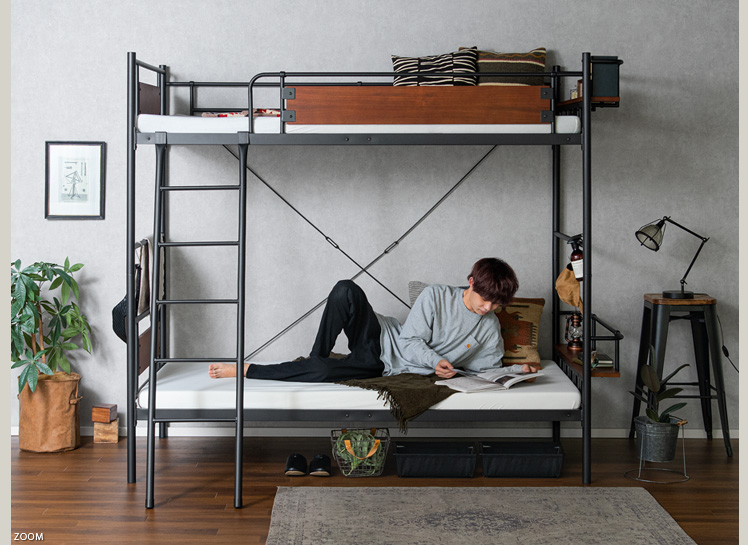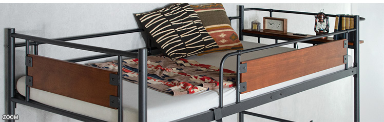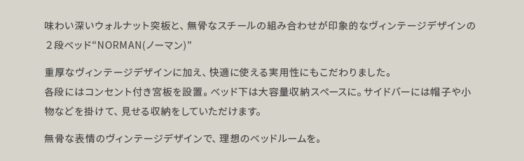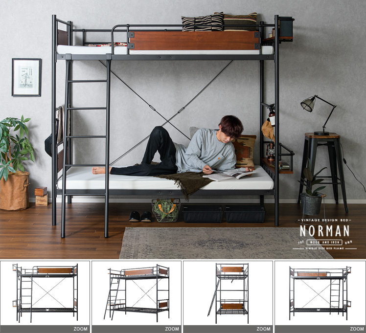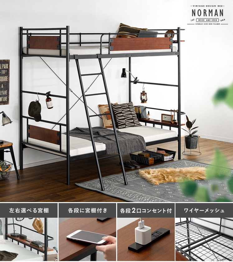 ヴィンテージデザイン2段ベッド NORMAN〔ノーマン〕 シングル フレーム単体/味わい深いウォルナット突板と、無骨なスチールの組み合わせが印象的なヴィンテージデザインの2段ベッド“NORMAN(ノーマン)”重厚なヴィンテージデザインに加え、快適に使える実用性にもこだわりました。各段にはコンセント付き宮板を設置。ベッド下は大容量収納スペースに。サイドバーには帽子や小物などを掛けて、見せる収納をしていただけます。無骨な表情のヴィンテージデザインで、理想のベッドルームを。