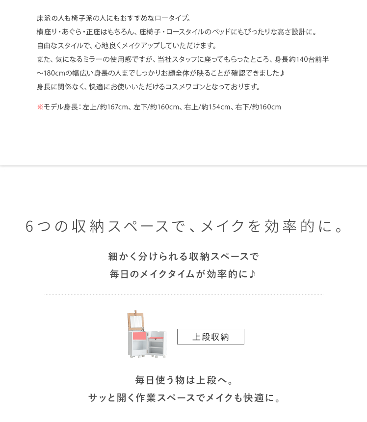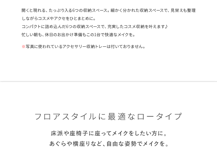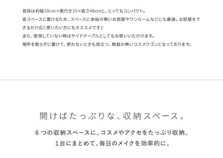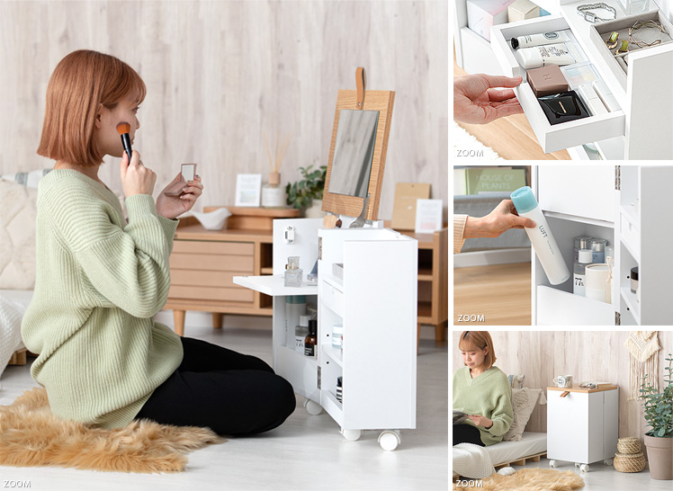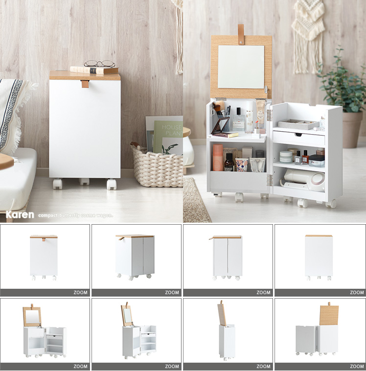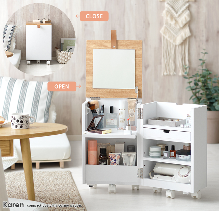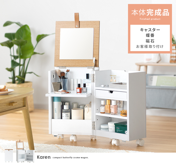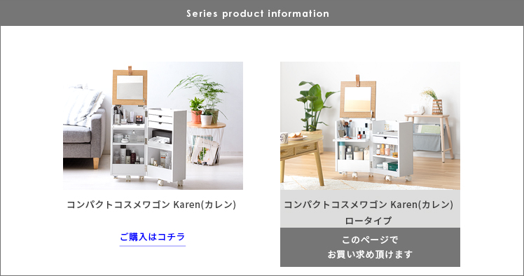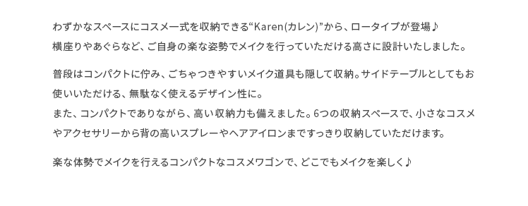 コンパクトコスメワゴン Karen(カレン) ロータイプ [本体完成品]/わずかなスペースにコスメ一式を収納できる“Karen(カレン)”から、ロータイプが登場♪横座りやあぐらなど、ご自身の楽な姿勢でメイクを行っていただける高さに設計いたしました。普段はコンパクトに佇み、ごちゃつきやすいメイク道具も隠して収納。サイドテーブルとしてもお使いいただける、無駄なく使えるデザイン性に。また、コンパクトでありながら、高い収納力も備えました。6つの収納スペースで、小さなコスメやアクセサリーから背の高いスプレーやヘアアイロンまですっきり収納していただけます。楽な体勢で快適なメイクを行えるコンパクトなコスメワゴンで、どこでも快適なメイクを♪