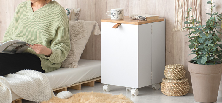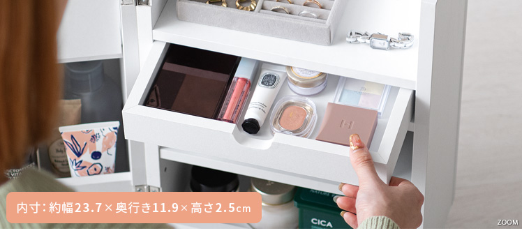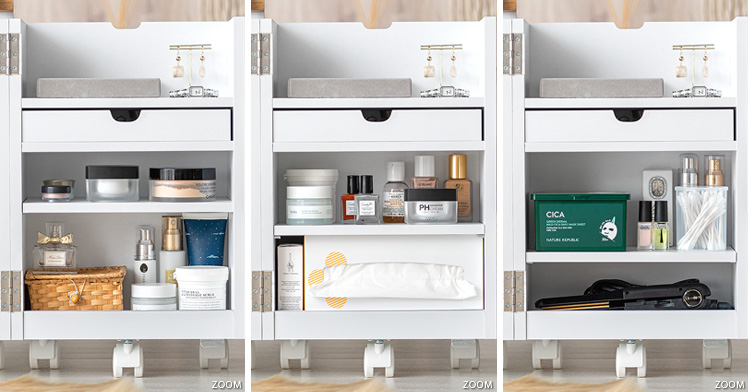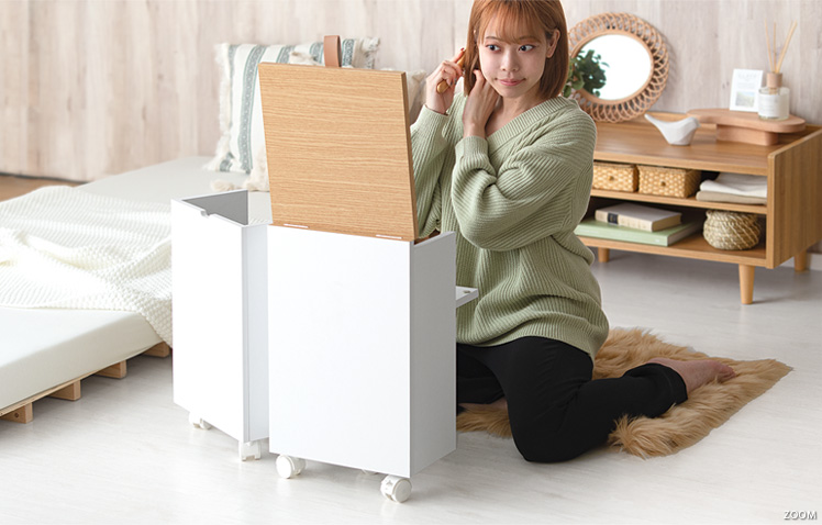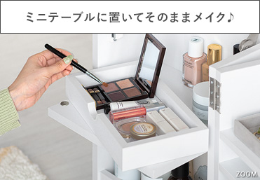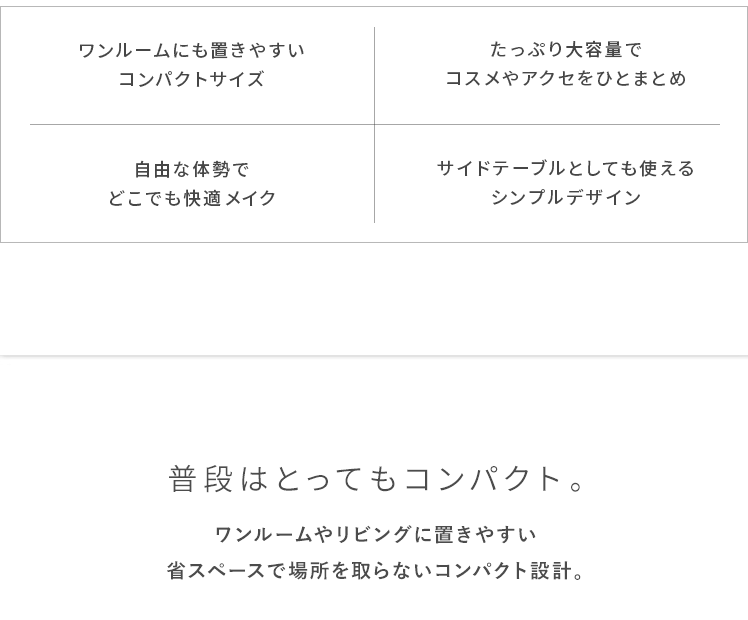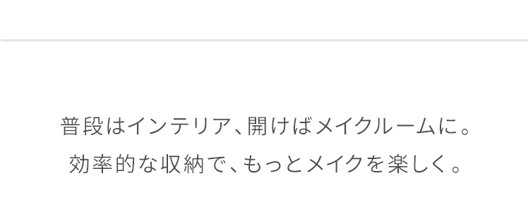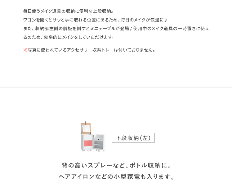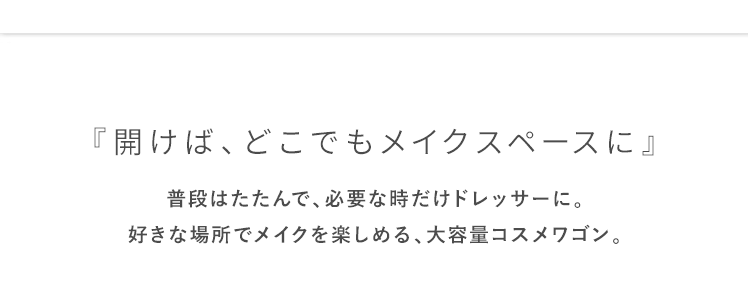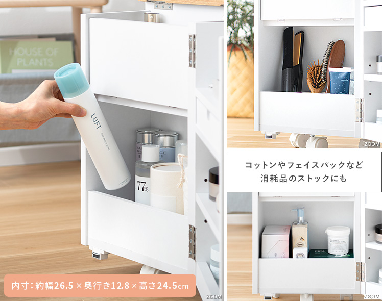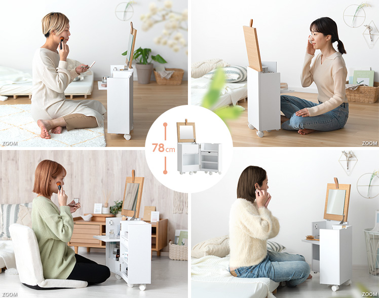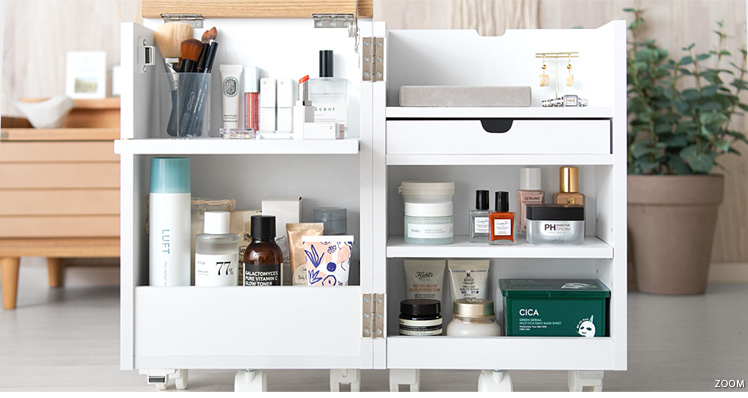 コンパクトコスメワゴン Karen(カレン) ロータイプ [本体完成品]/わずかなスペースにコスメ一式を収納できる“Karen(カレン)”から、ロータイプが登場♪横座りやあぐらなど、ご自身の楽な姿勢でメイクを行っていただける高さに設計いたしました。普段はコンパクトに佇み、ごちゃつきやすいメイク道具も隠して収納。サイドテーブルとしてもお使いいただける、無駄なく使えるデザイン性に。また、コンパクトでありながら、高い収納力も備えました。6つの収納スペースで、小さなコスメやアクセサリーから背の高いスプレーやヘアアイロンまですっきり収納していただけます。楽な体勢で快適なメイクを行えるコンパクトなコスメワゴンで、どこでも快適なメイクを♪