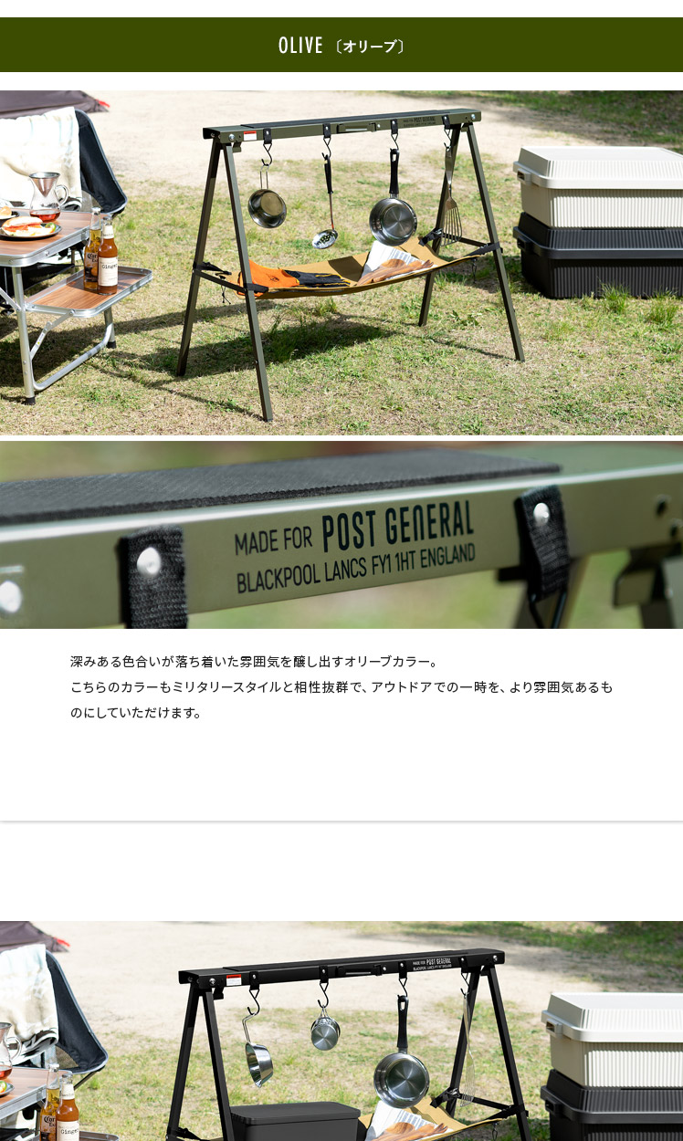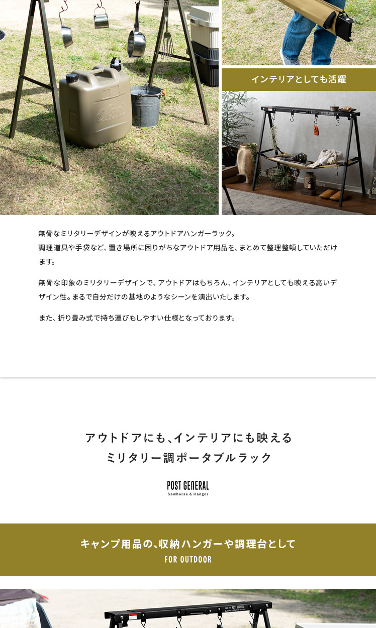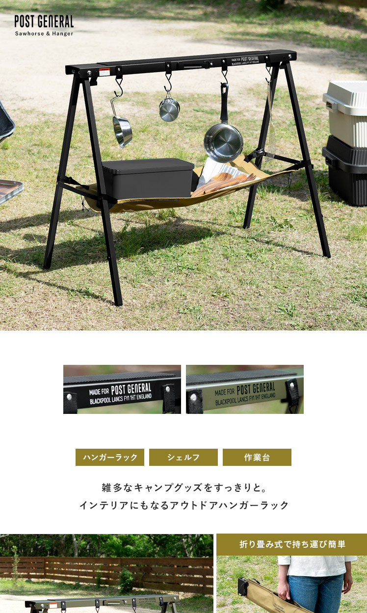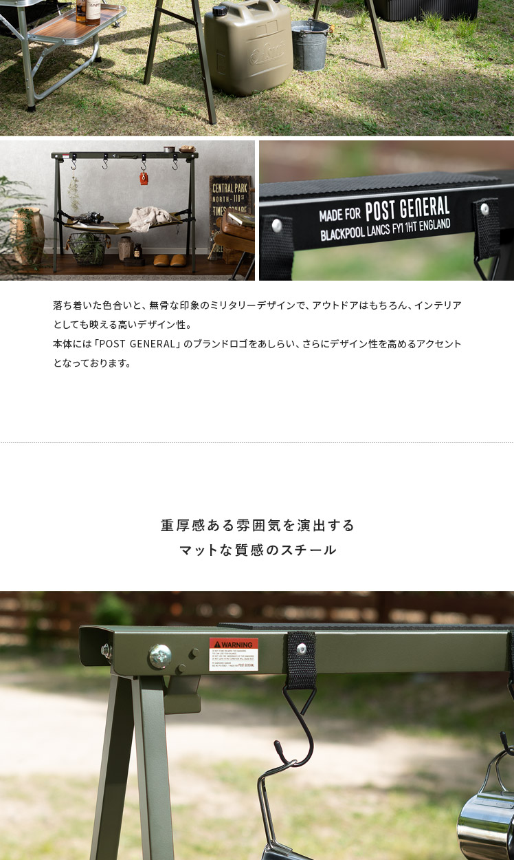 POST GENERAL〔ポストジェネラル〕ソーホース アンド ハンガー/無骨なミリタリーデザインが映えるアウトドアハンガーラック。調理道具や手袋など、置き場所に困りがちなアウトドア用品を、まとめて整理整頓していただけます。無骨な印象のミリタリーデザインで、アウトドアはもちろん、インテリアとしても映える高いデザイン性。まるで自分だけの基地のようなシーンを演出いたします。また、折り畳み式で持ち運びもしやすい仕様となっております。