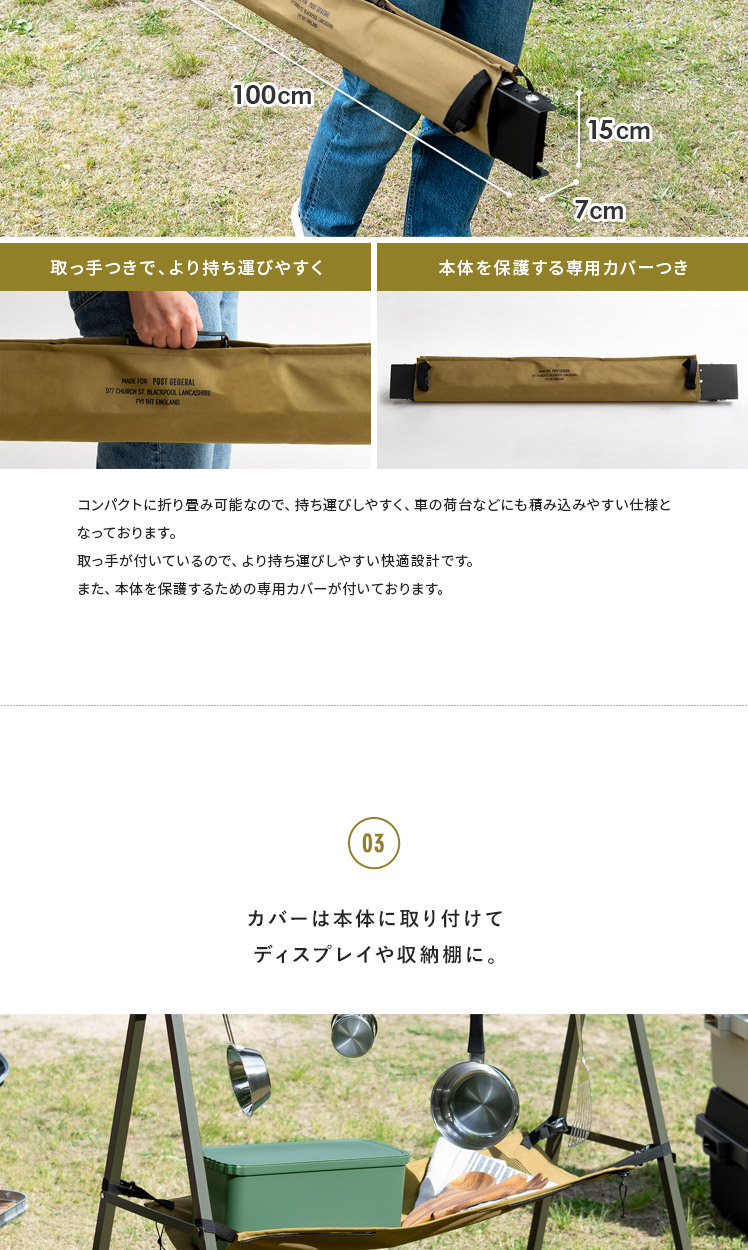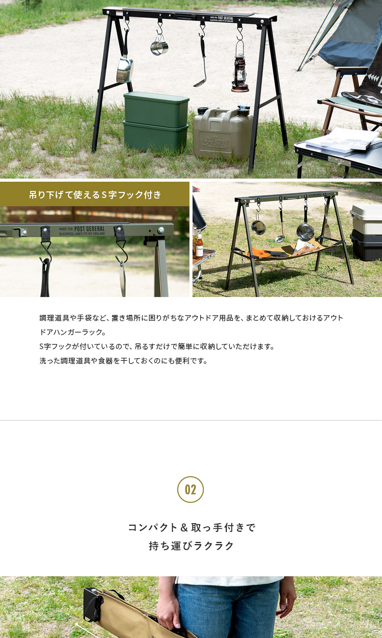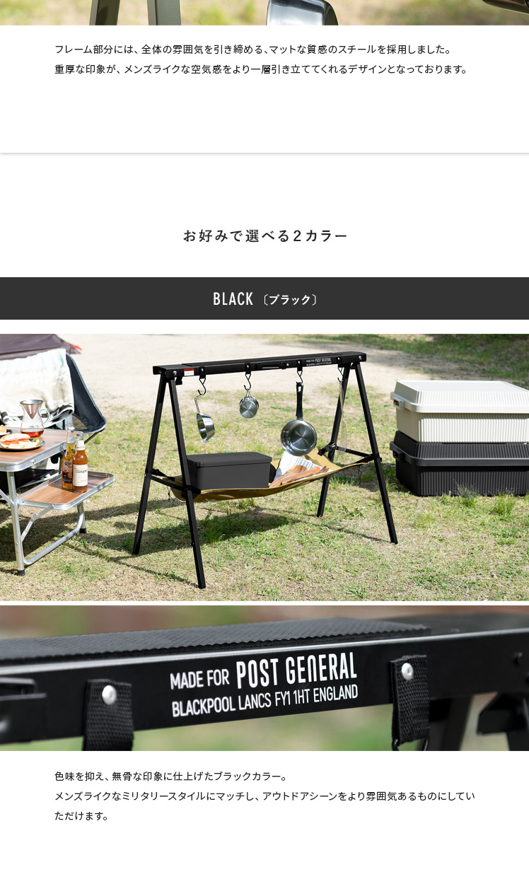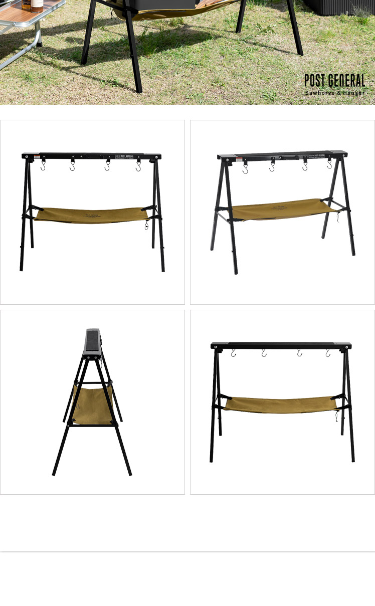 POST GENERAL〔ポストジェネラル〕ソーホース アンド ハンガー/無骨なミリタリーデザインが映えるアウトドアハンガーラック。調理道具や手袋など、置き場所に困りがちなアウトドア用品を、まとめて整理整頓していただけます。無骨な印象のミリタリーデザインで、アウトドアはもちろん、インテリアとしても映える高いデザイン性。まるで自分だけの基地のようなシーンを演出いたします。また、折り畳み式で持ち運びもしやすい仕様となっております。