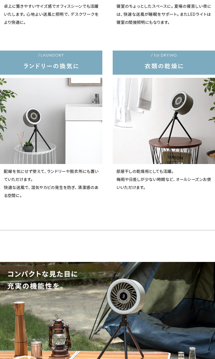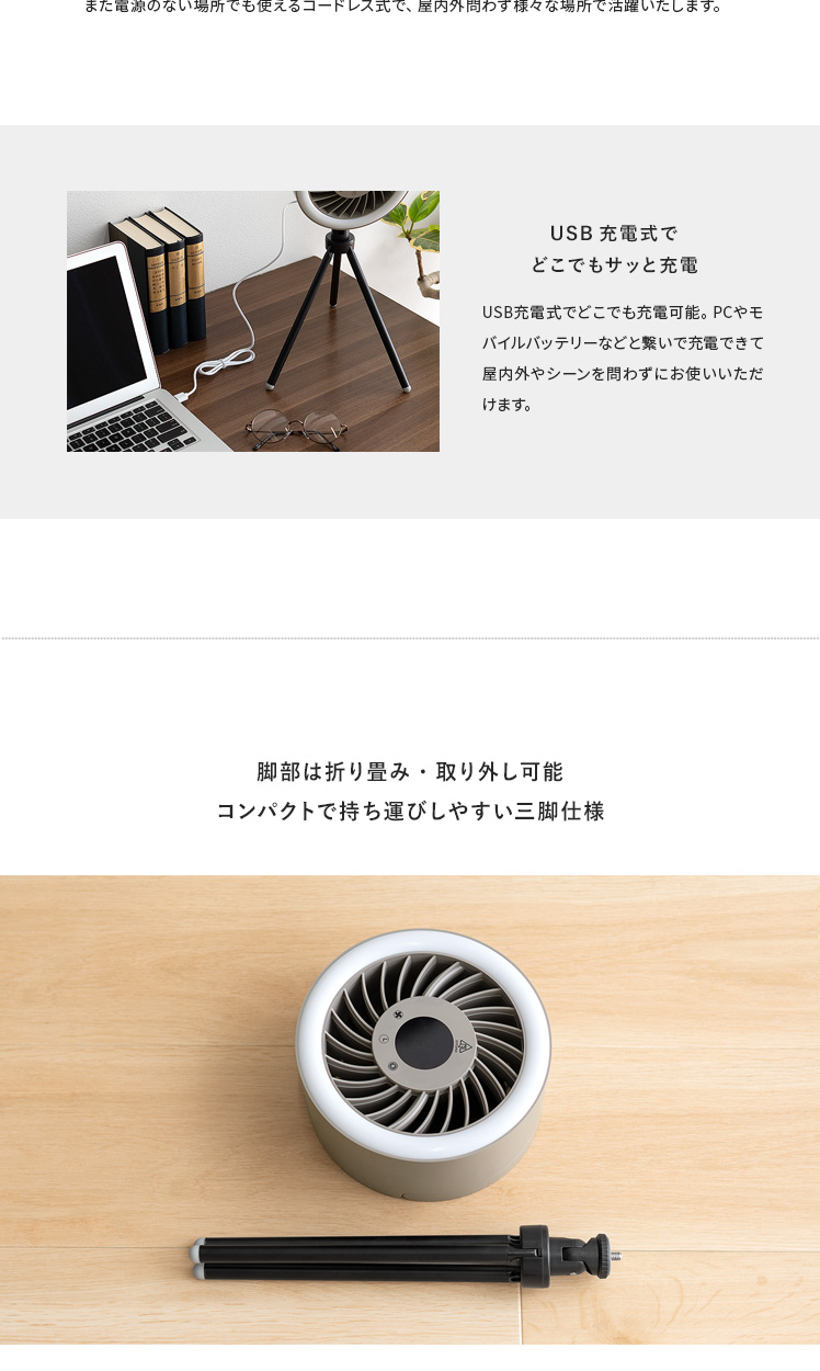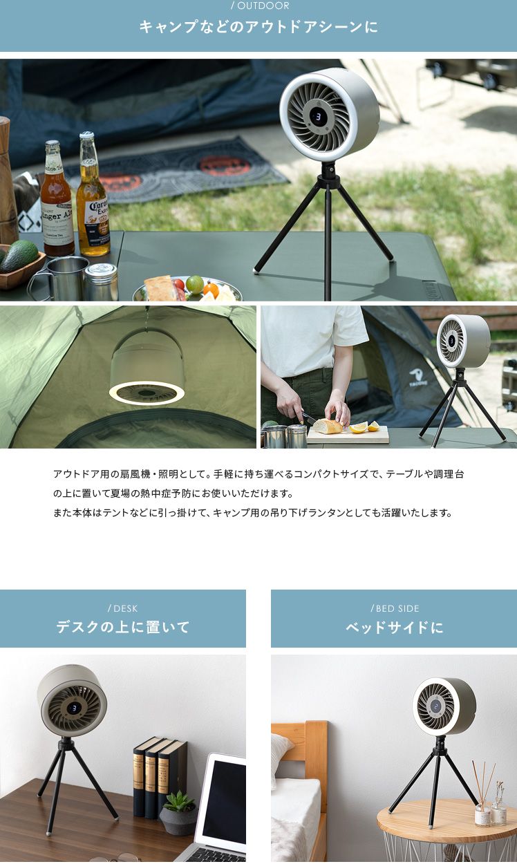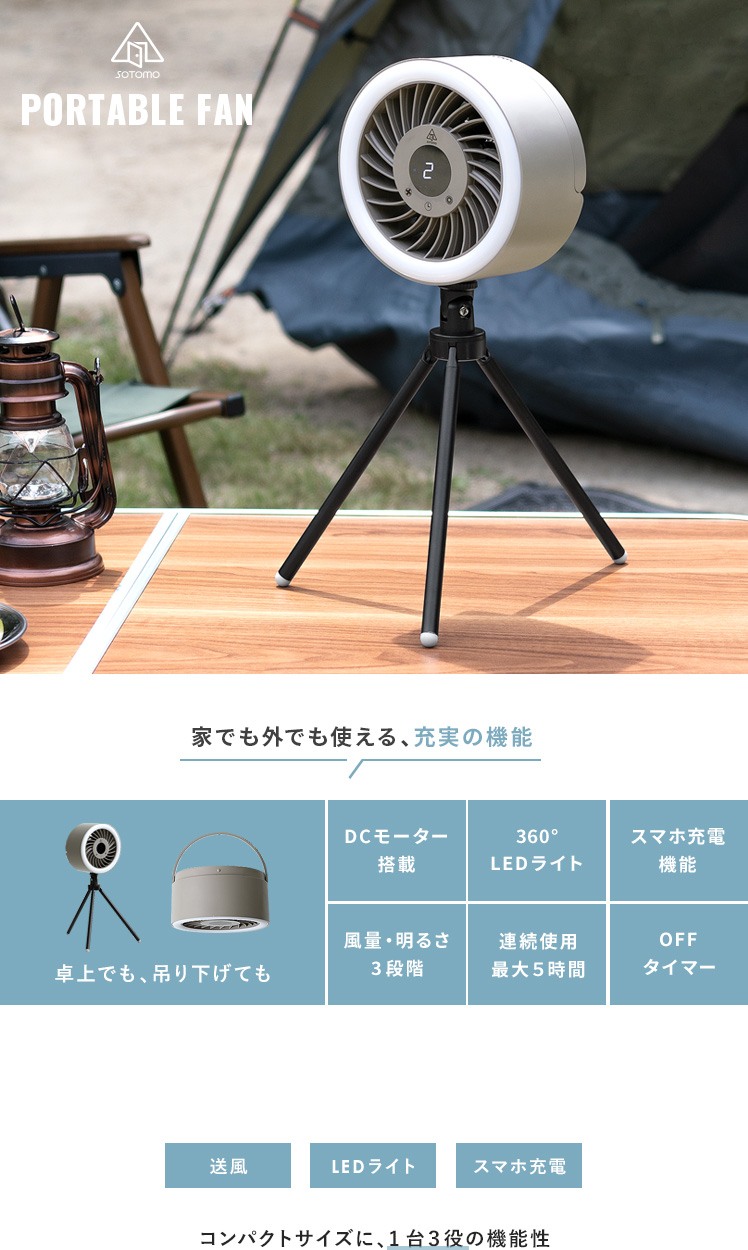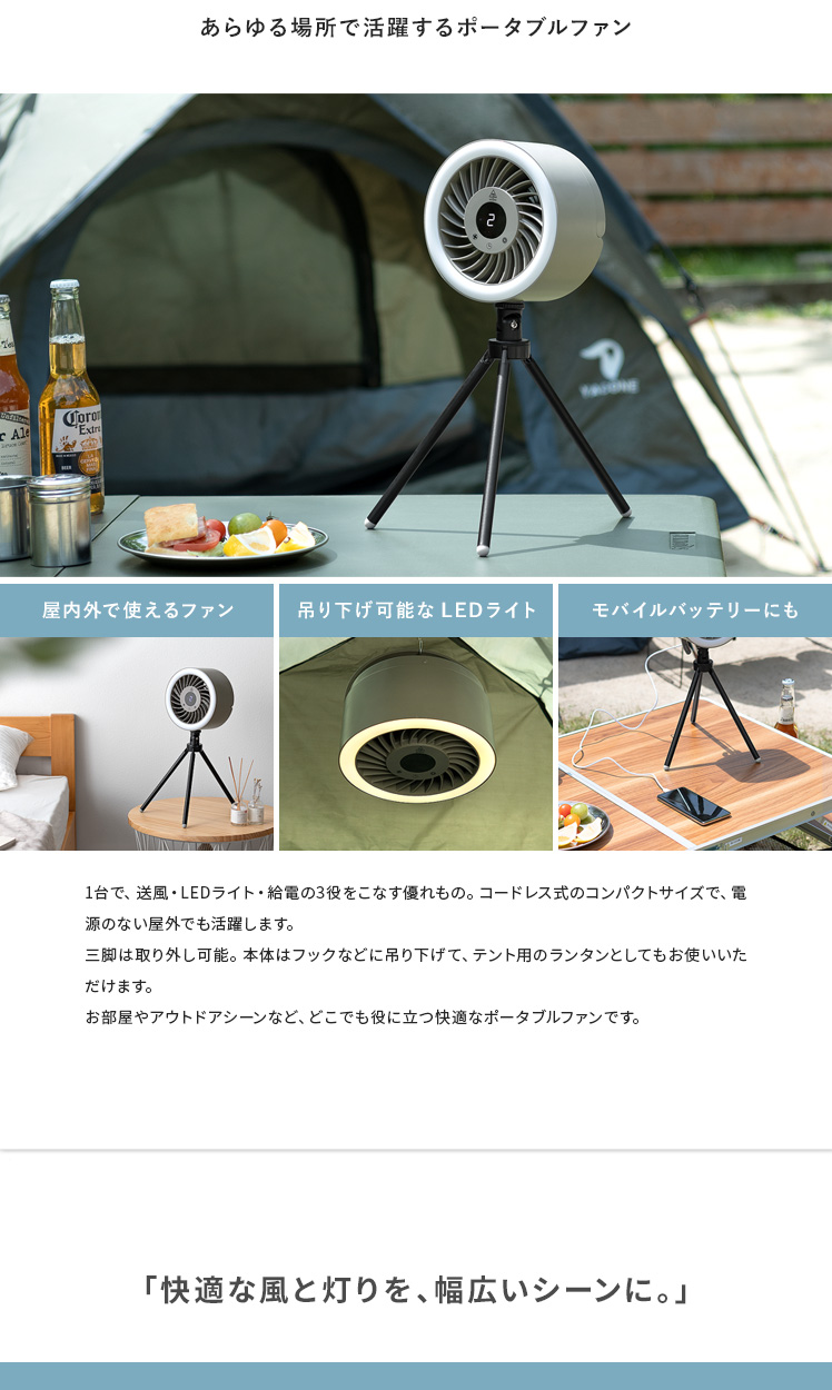 LEDライト付きポータブルファン/1台で、送風・LEDライト・給電の3役をこなす優れもの。コードレス式のコンパクトサイズで、電源のない屋外でも活躍します。三脚は取り外し可能。本体はフックなどに吊り下げて、テント用のランタンとしてもお使いいただけます。お部屋やアウトドアシーンなど、どこでも役に立つ快適なポータブルファンです。