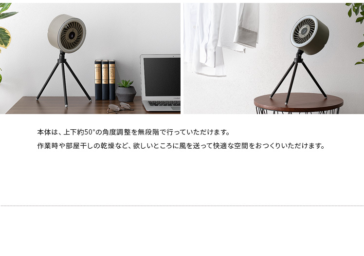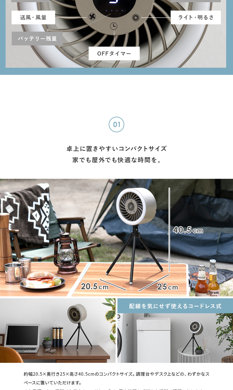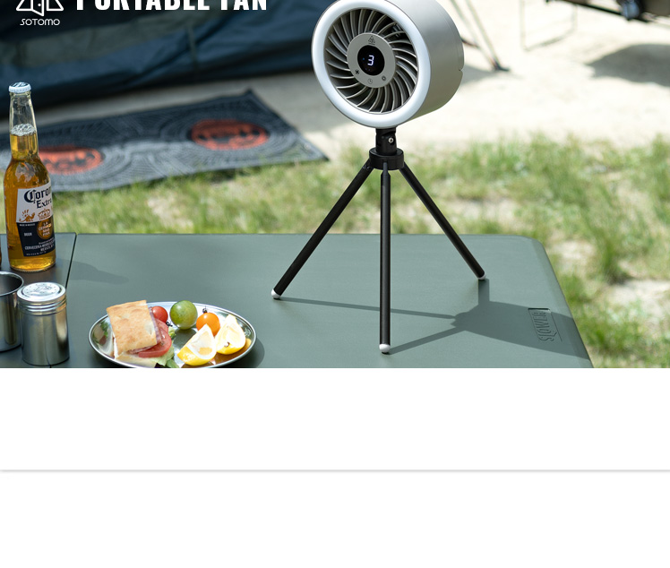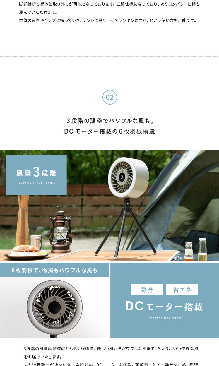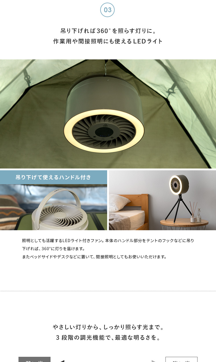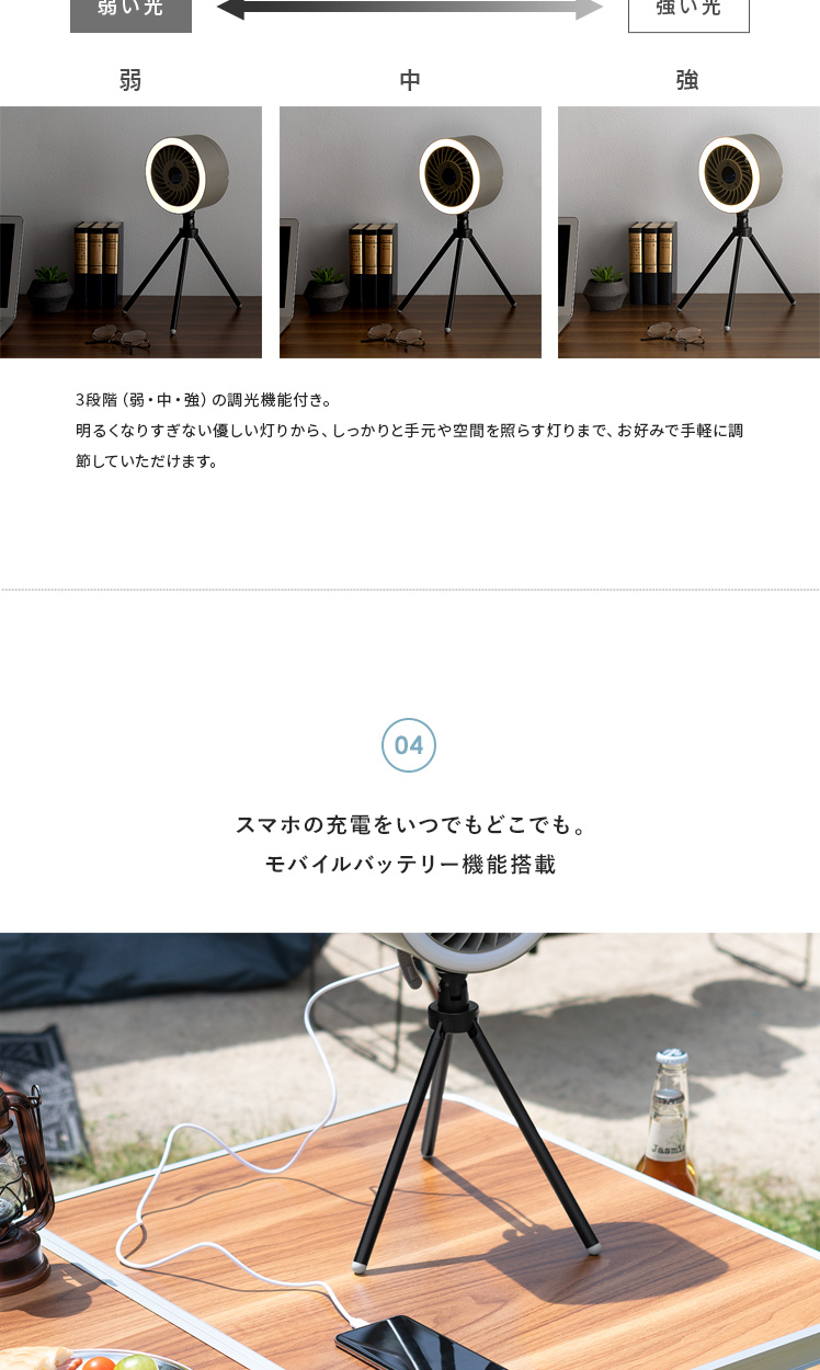 LEDライト付きポータブルファン/1台で、送風・LEDライト・給電の3役をこなす優れもの。コードレス式のコンパクトサイズで、電源のない屋外でも活躍します。三脚は取り外し可能。本体はフックなどに吊り下げて、テント用のランタンとしてもお使いいただけます。お部屋やアウトドアシーンなど、どこでも役に立つ快適なポータブルファンです。