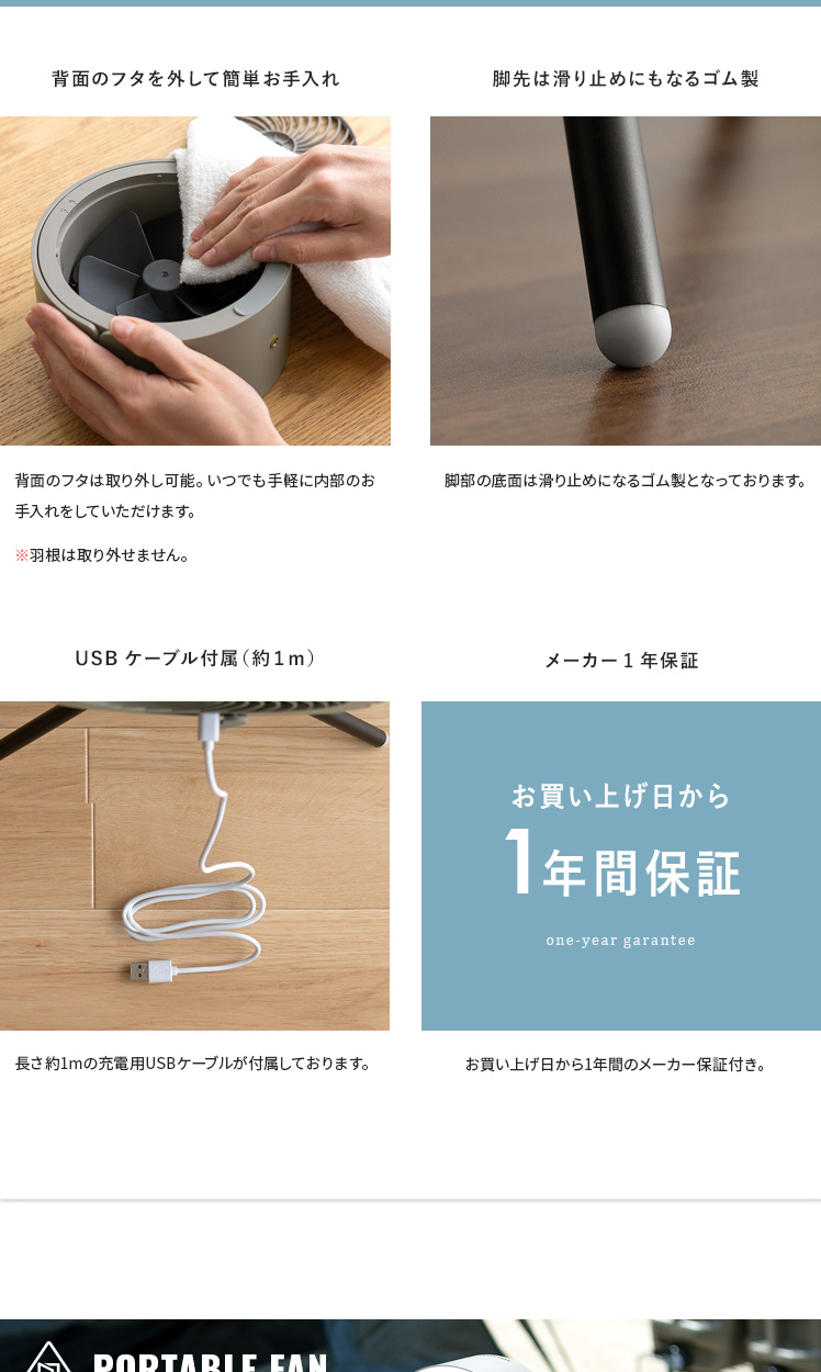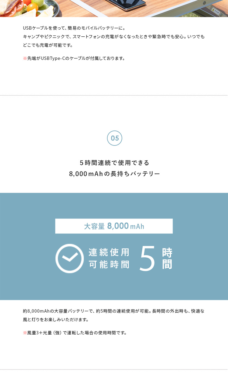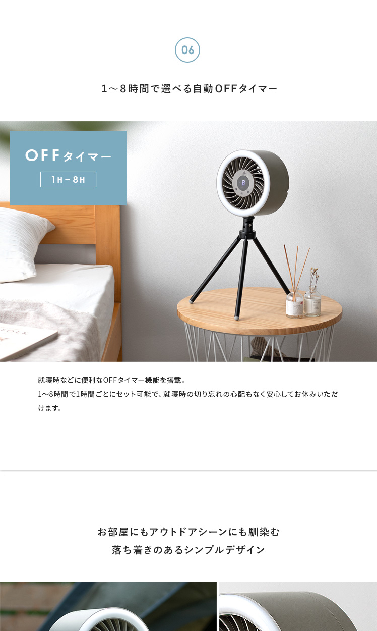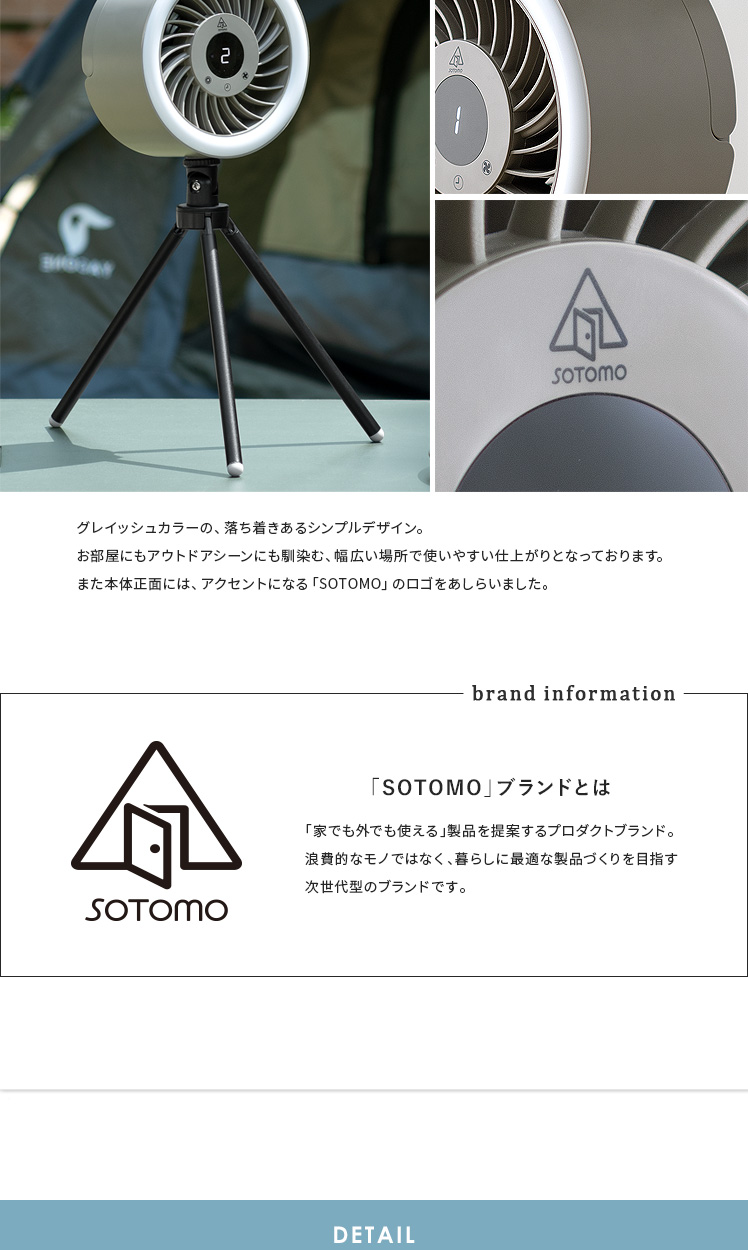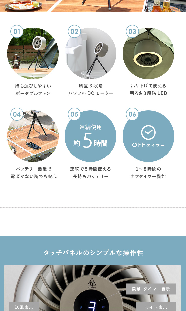 LEDライト付きポータブルファン/1台で、送風・LEDライト・給電の3役をこなす優れもの。コードレス式のコンパクトサイズで、電源のない屋外でも活躍します。三脚は取り外し可能。本体はフックなどに吊り下げて、テント用のランタンとしてもお使いいただけます。お部屋やアウトドアシーンなど、どこでも役に立つ快適なポータブルファンです。