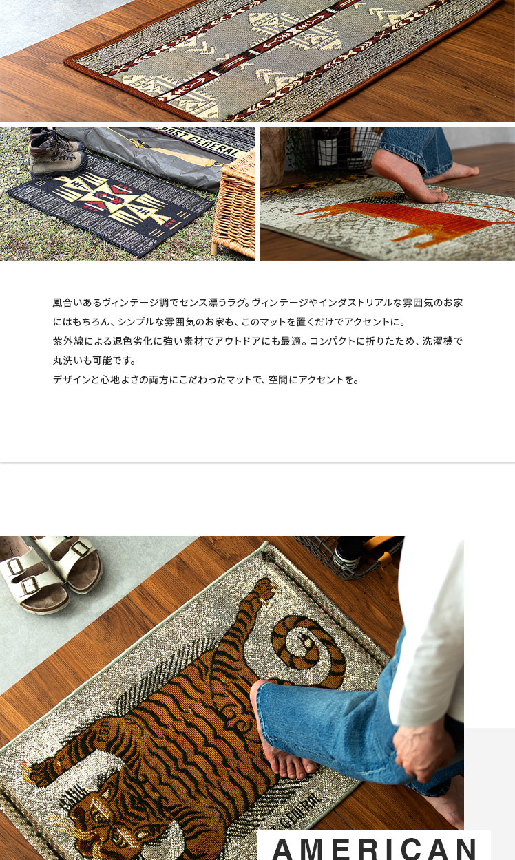 POST GENERAL TO-GO MAT〔ポストジェネラル トゥーゴー マット〕80×50cm/風合いあるヴィンテージ調でセンス漂うラグ。ヴィンテージやインダストリアルな雰囲気のお家にはもちろん、シンプルな雰囲気のお家も、このマットを置くだけでアクセントに。紫外線による退色劣化に強い素材でアウトドアにも最適。コンパクトに折りたため、洗濯機で丸洗いも可能です。デザインと心地よさの両方にこだわったマットで、空間にアクセントを。