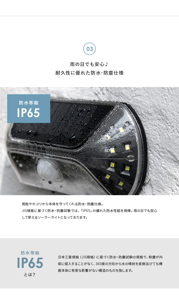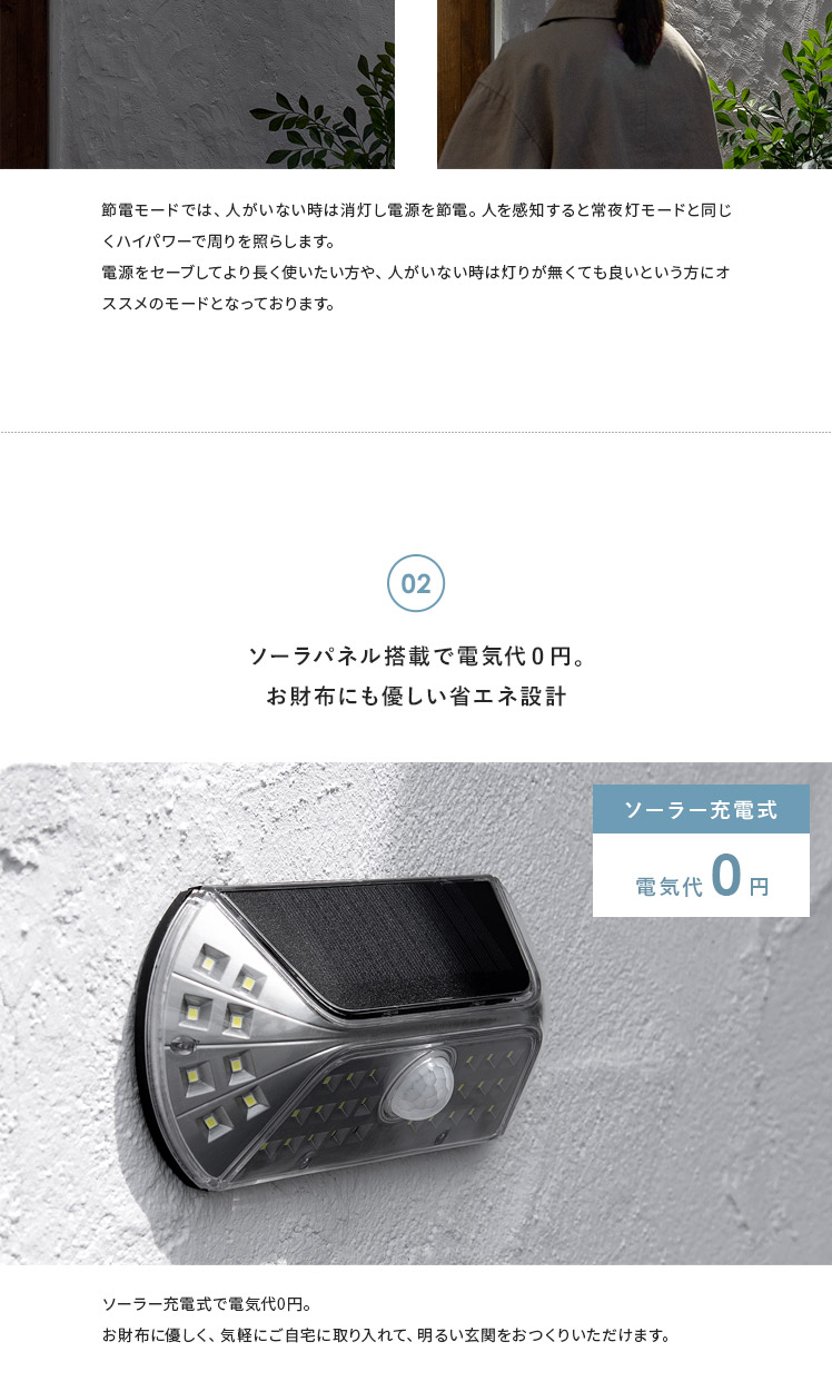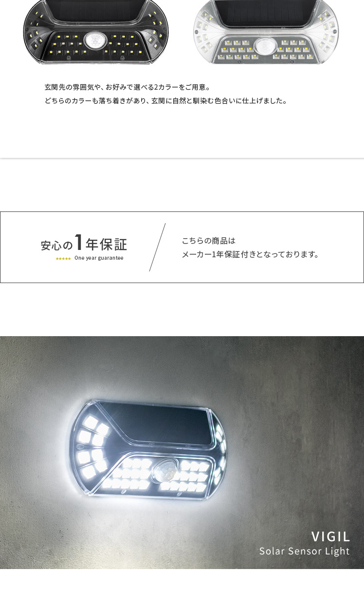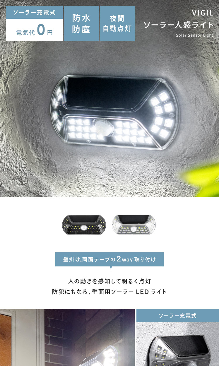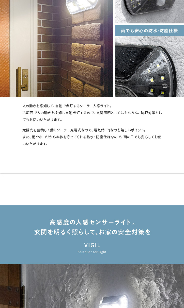 ソーラー人感センサーライト VIGIL〔ビジル〕/人の動きを感知して、自動で点灯するソーラー人感ライト。広範囲で人の動きを検知し自動点灯するので、玄関照明としてはもちろん、防犯対策としてもお使いいただけます。太陽光を蓄積して動くソーラー充電式なので、電気代0円なのも嬉しいポイント。また、雨やホコリから本体を守ってくれる防水・防塵仕様なので、雨の日でも安心してお使いいただけます。