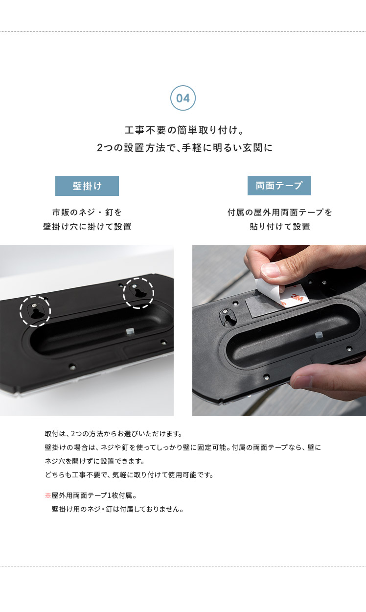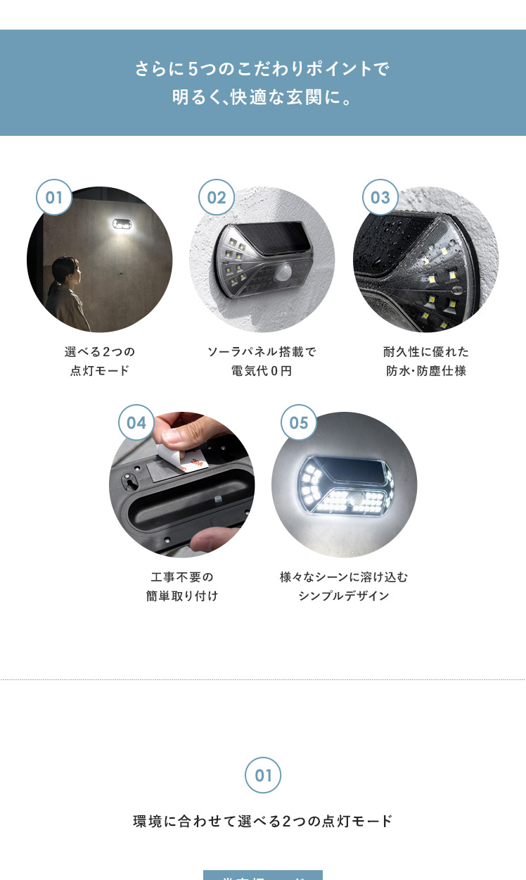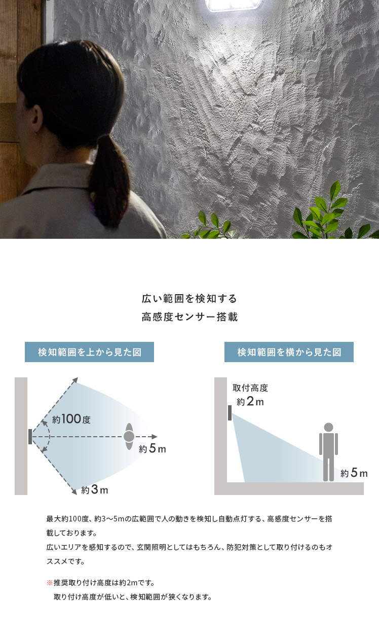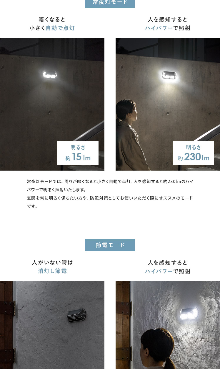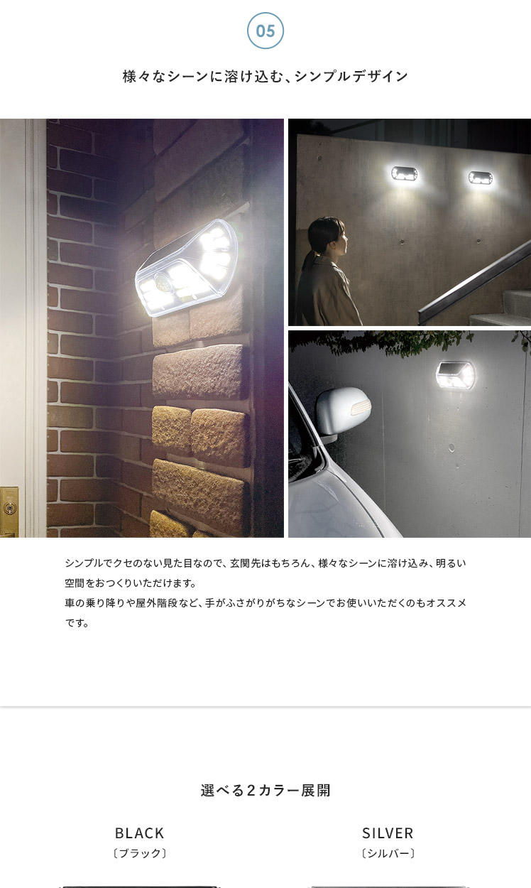 ソーラー人感センサーライト VIGIL〔ビジル〕/人の動きを感知して、自動で点灯するソーラー人感ライト。広範囲で人の動きを検知し自動点灯するので、玄関照明としてはもちろん、防犯対策としてもお使いいただけます。太陽光を蓄積して動くソーラー充電式なので、電気代0円なのも嬉しいポイント。また、雨やホコリから本体を守ってくれる防水・防塵仕様なので、雨の日でも安心してお使いいただけます。