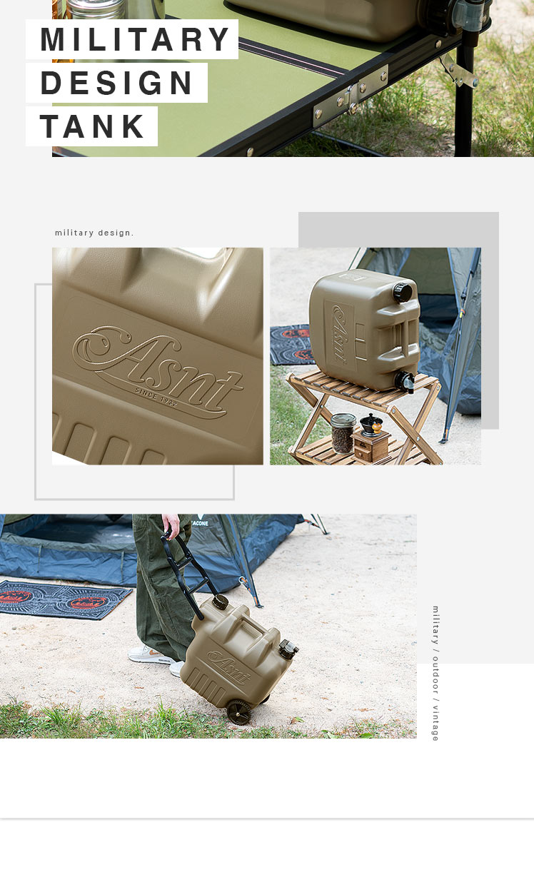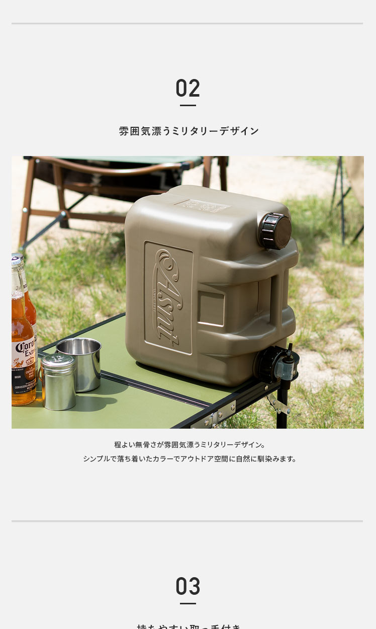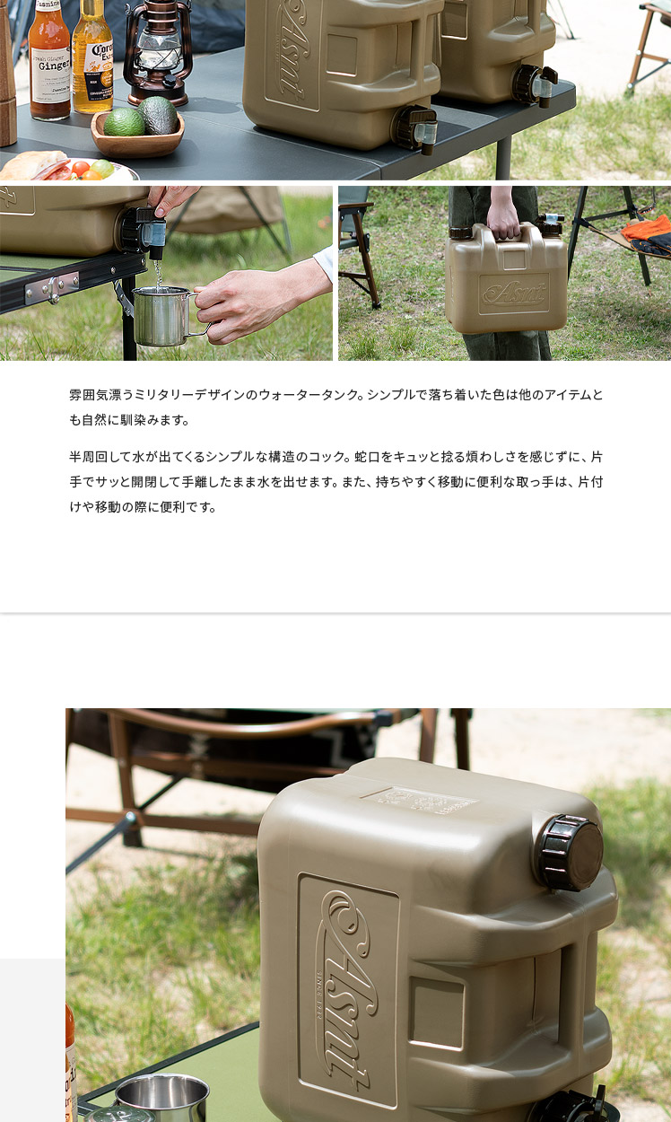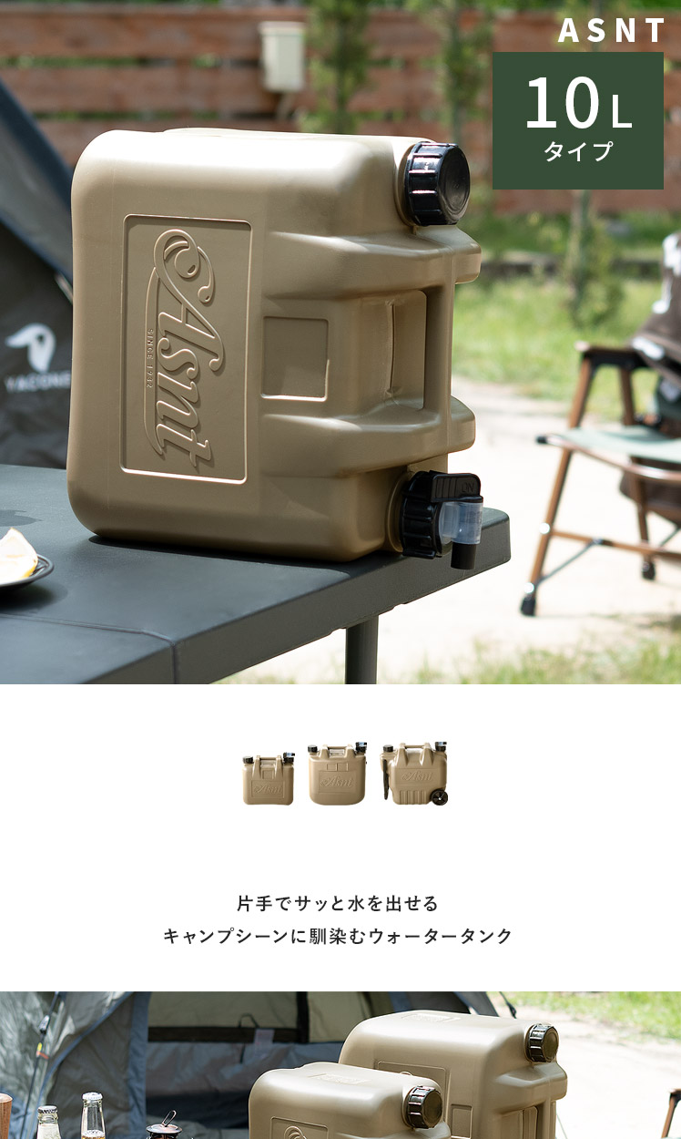 ASNT〔アズント〕 ウォータータンク 10Lタイプ/雰囲気漂うミリタリーデザインのウォータータンク。シンプルで落ち着いた色は他のアイテムとも自然に馴染みます。半周回して水が出てくるシンプルな構造のコック。蛇口をキュッと捻る煩わしさを感じずに、片手でサッと開閉して手離したまま水を出せます。また、持ちやすく移動に便利な取っ手は、片付けや移動の際に便利です。