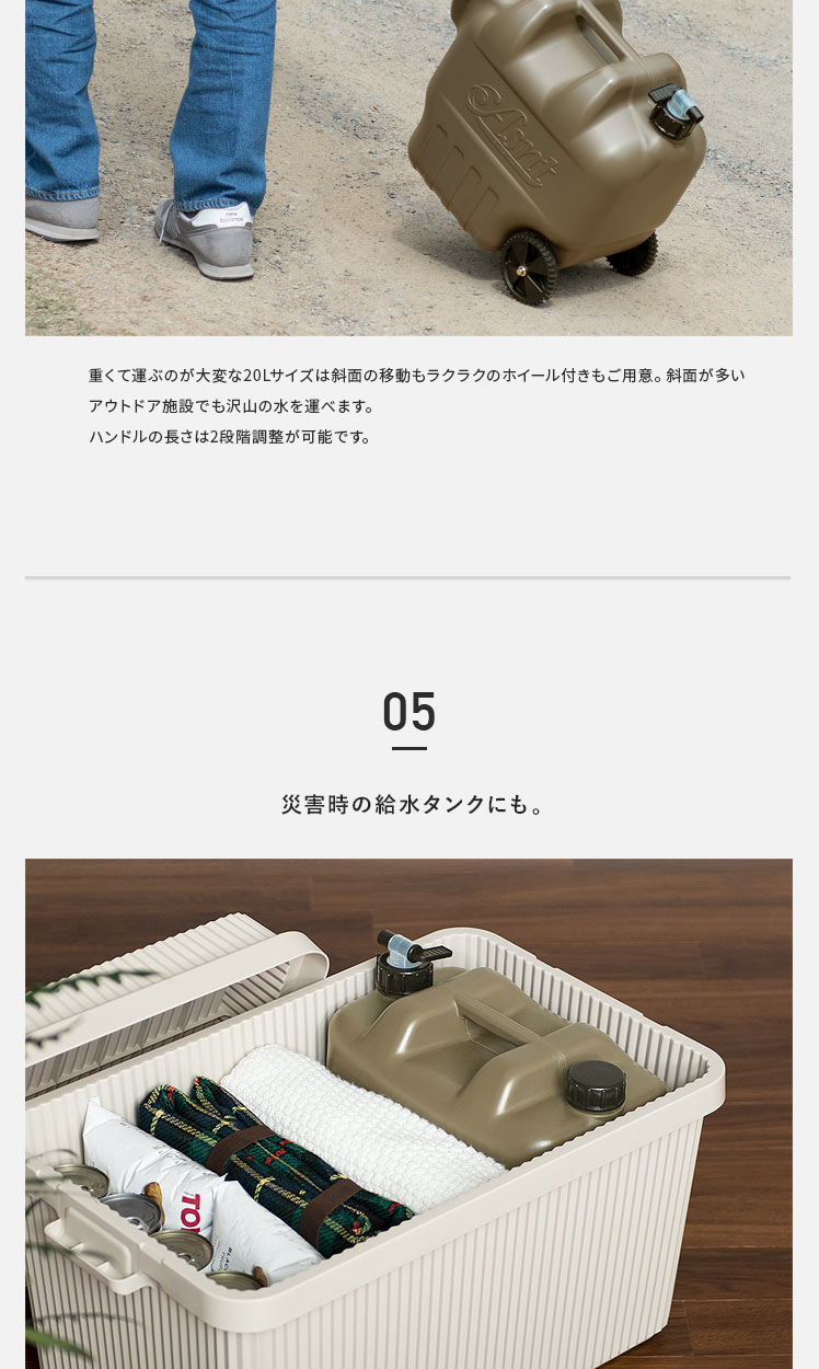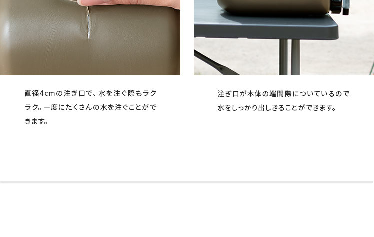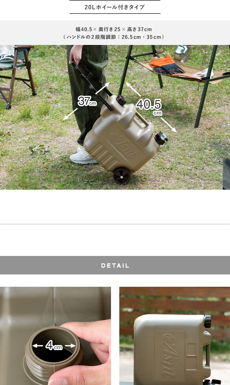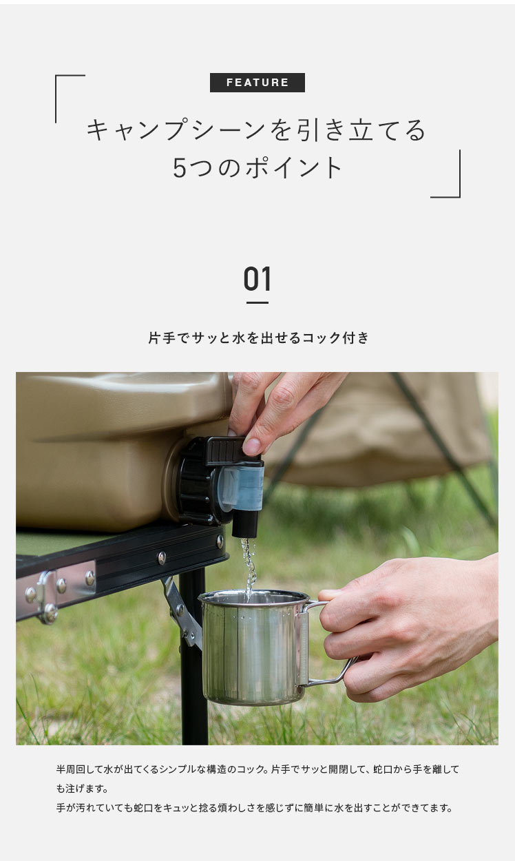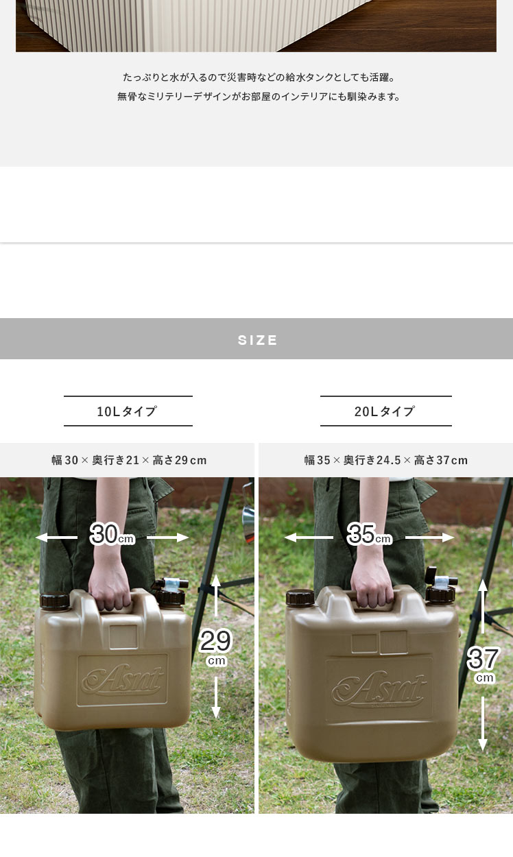 ASNT〔アズント〕 ウォータータンク 10Lタイプ/雰囲気漂うミリタリーデザインのウォータータンク。シンプルで落ち着いた色は他のアイテムとも自然に馴染みます。半周回して水が出てくるシンプルな構造のコック。蛇口をキュッと捻る煩わしさを感じずに、片手でサッと開閉して手離したまま水を出せます。また、持ちやすく移動に便利な取っ手は、片付けや移動の際に便利です。