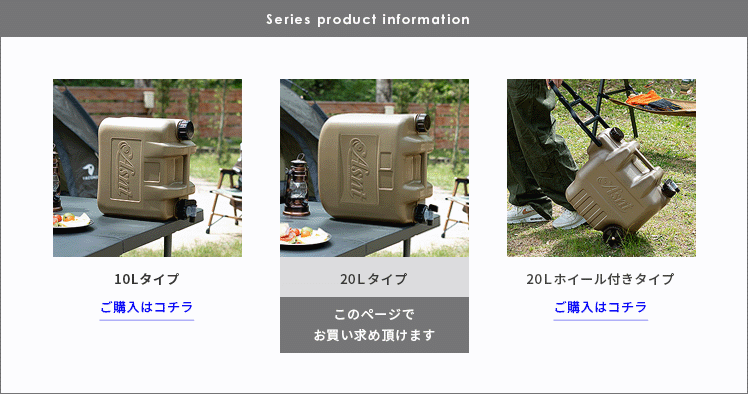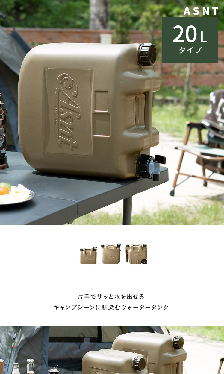 ASNT〔アズント〕 ウォータータンク 20Lタイプ/雰囲気漂うミリタリーデザインのウォータータンク。シンプルで落ち着いた色は他のアイテムとも自然に馴染みます。半周回して水が出てくるシンプルな構造のコック。蛇口をキュッと捻る煩わしさを感じずに、片手でサッと開閉して手離したまま水を出せます。また、持ちやすく移動に便利な取っ手は、片付けや移動の際に便利です。