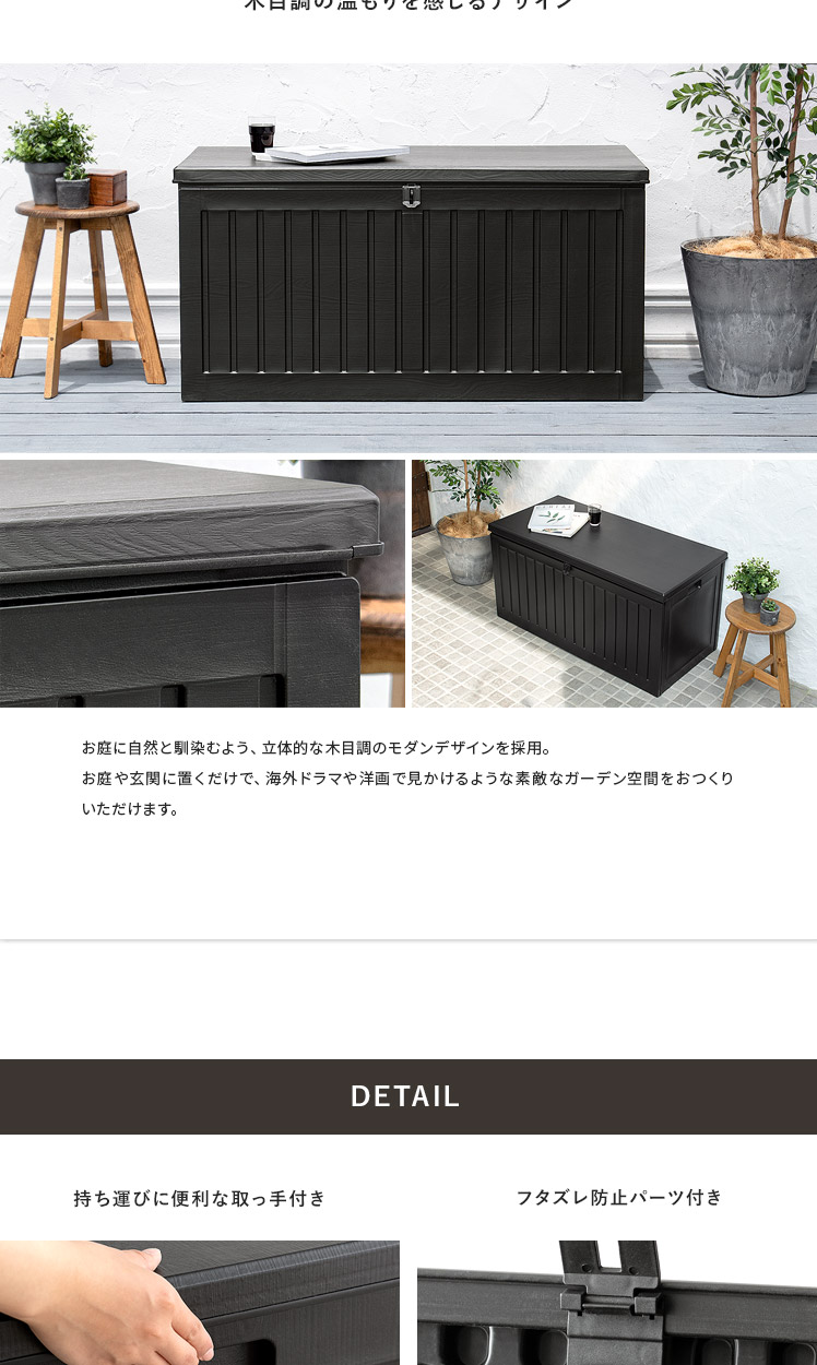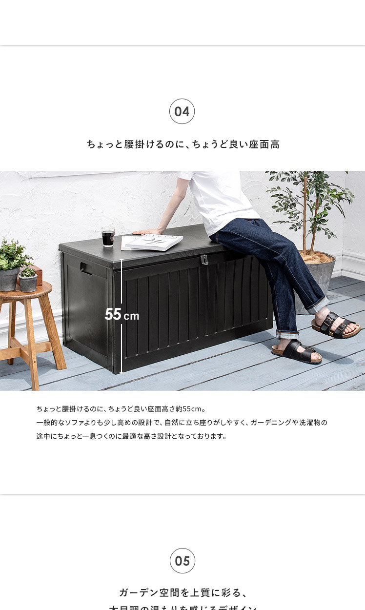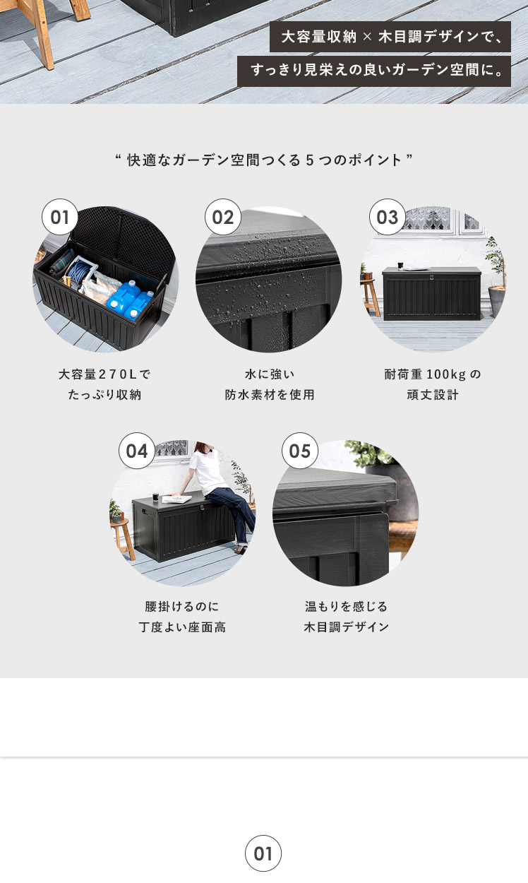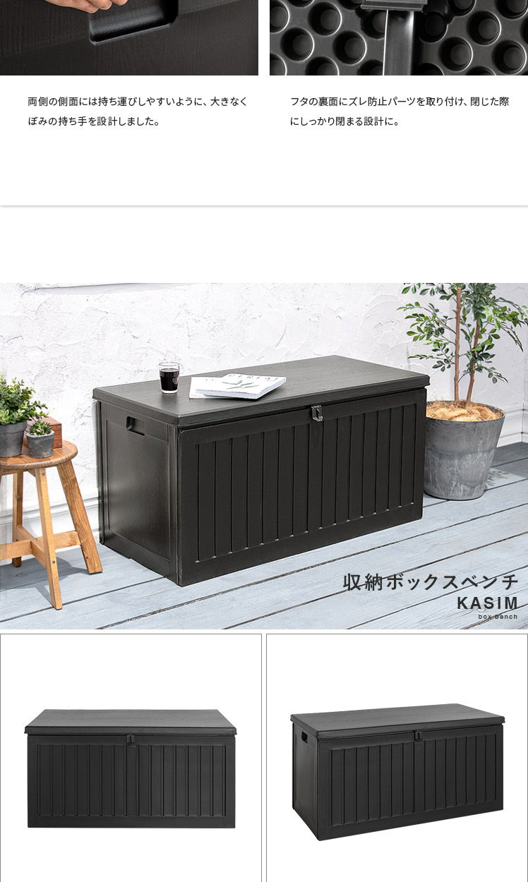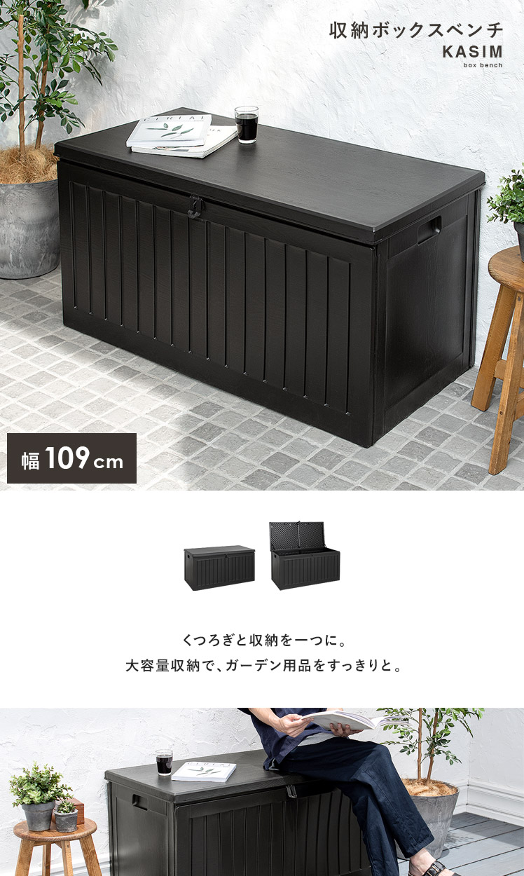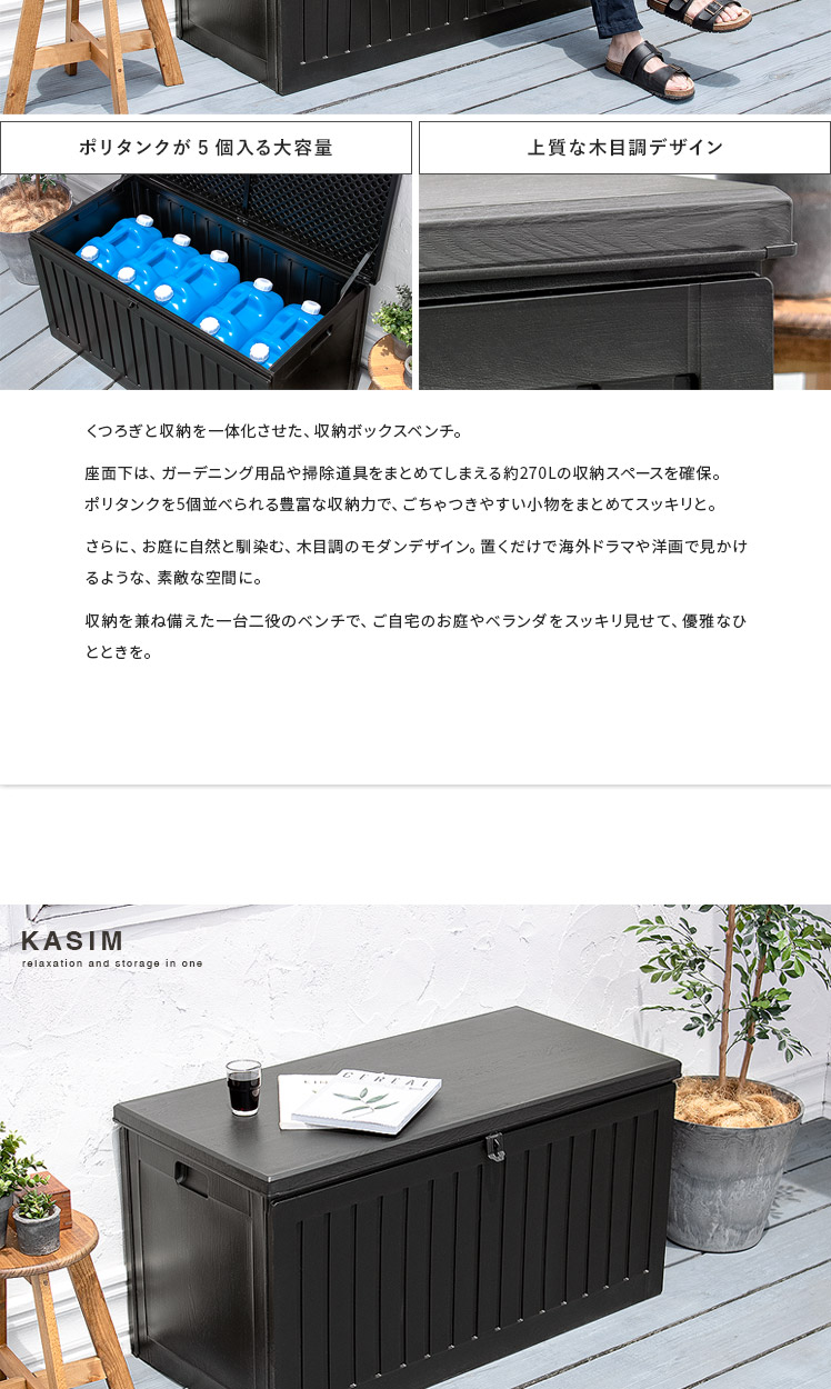 収納ボックスベンチ KASIM〔カシム〕/くつろぎと収納を一体化させた、収納ボックスベンチ。座面下は、ガーデニング用品や掃除道具をまとめてしまえる約270Lの収納スペースを確保。ポリタンクを5個並べられる豊富な収納力で、ごちゃつきやすい小物をまとめてスッキリと。さらに、お庭に自然と馴染む、木目調のモダンデザイン。置くだけで海外ドラマや洋画で見かけるような、素敵な空間に。収納を兼ね備えた一台二役のベンチで、ご自宅のお庭やベランダをスッキリ見せて、優雅なひとときを。
