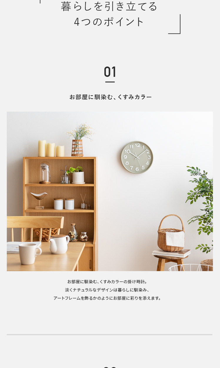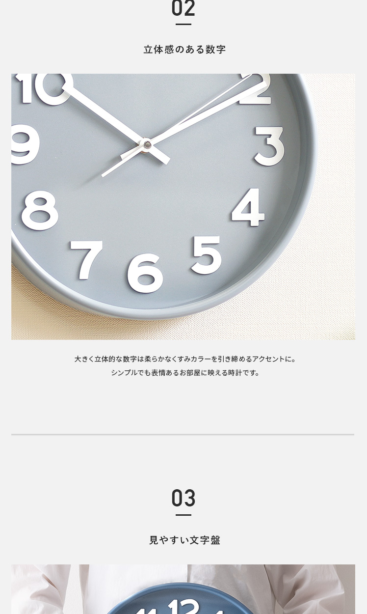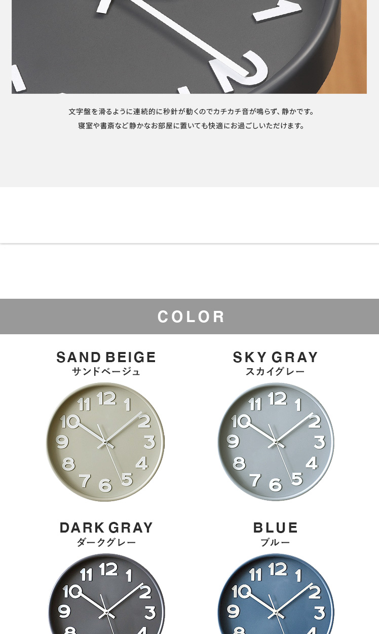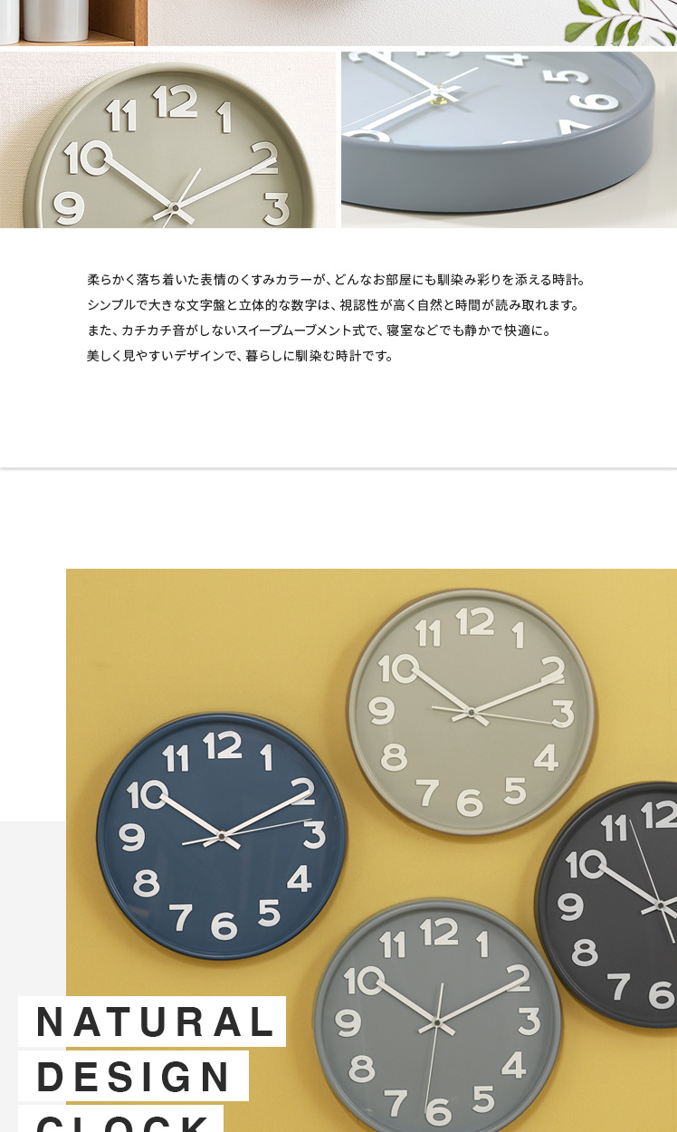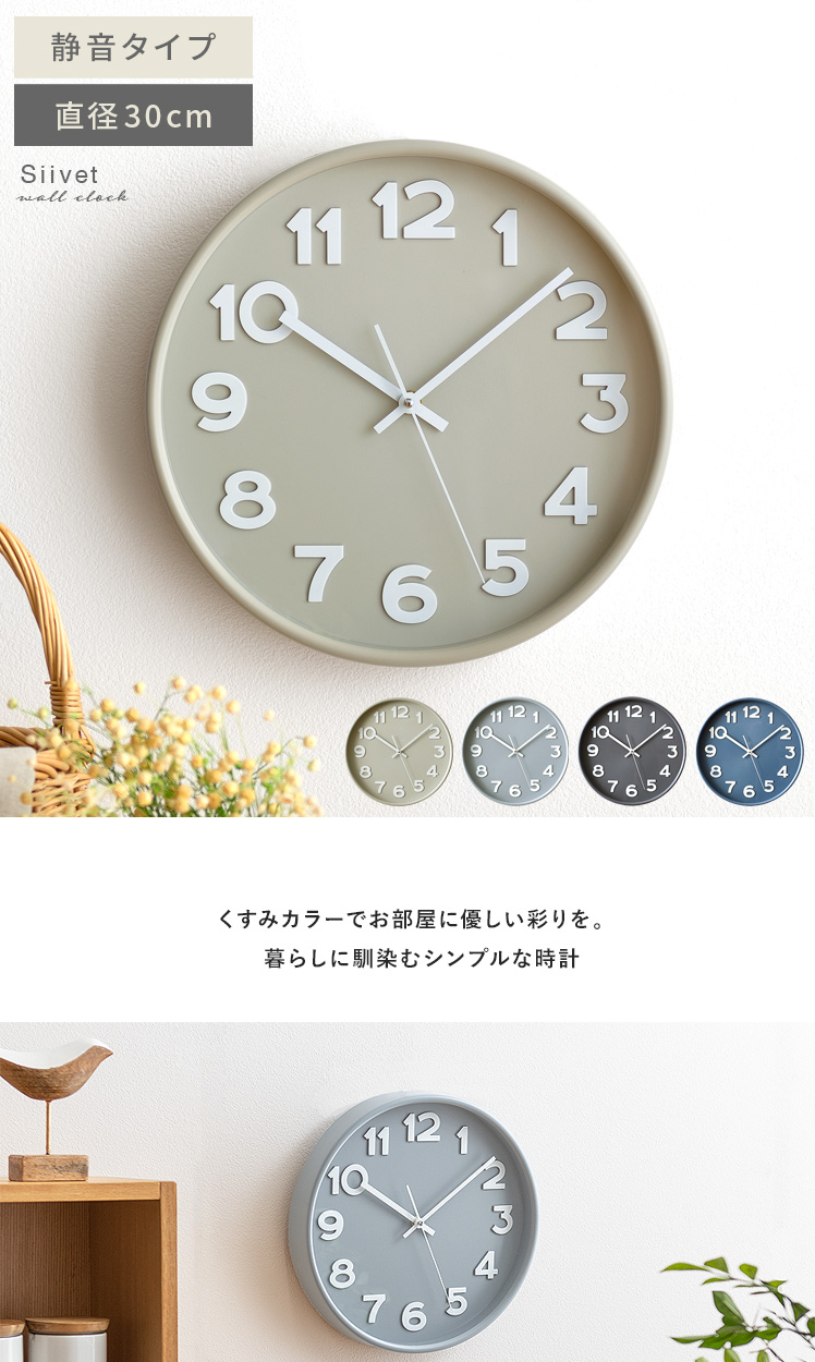 掛け時計 Siivet〔シーベット〕/柔らかく落ち着いた表情のくすみカラーが、どんなお部屋にも馴染み彩りを添える時計。シンプルで大きな文字盤と立体的な数字は、視認性が高く自然と時間が読み取れます。また、カカチカチ音がしないスイープムーブメント式で、寝室などでも静かで快適に。美しく見やすいデザインで、暮らしに馴染む時計です。