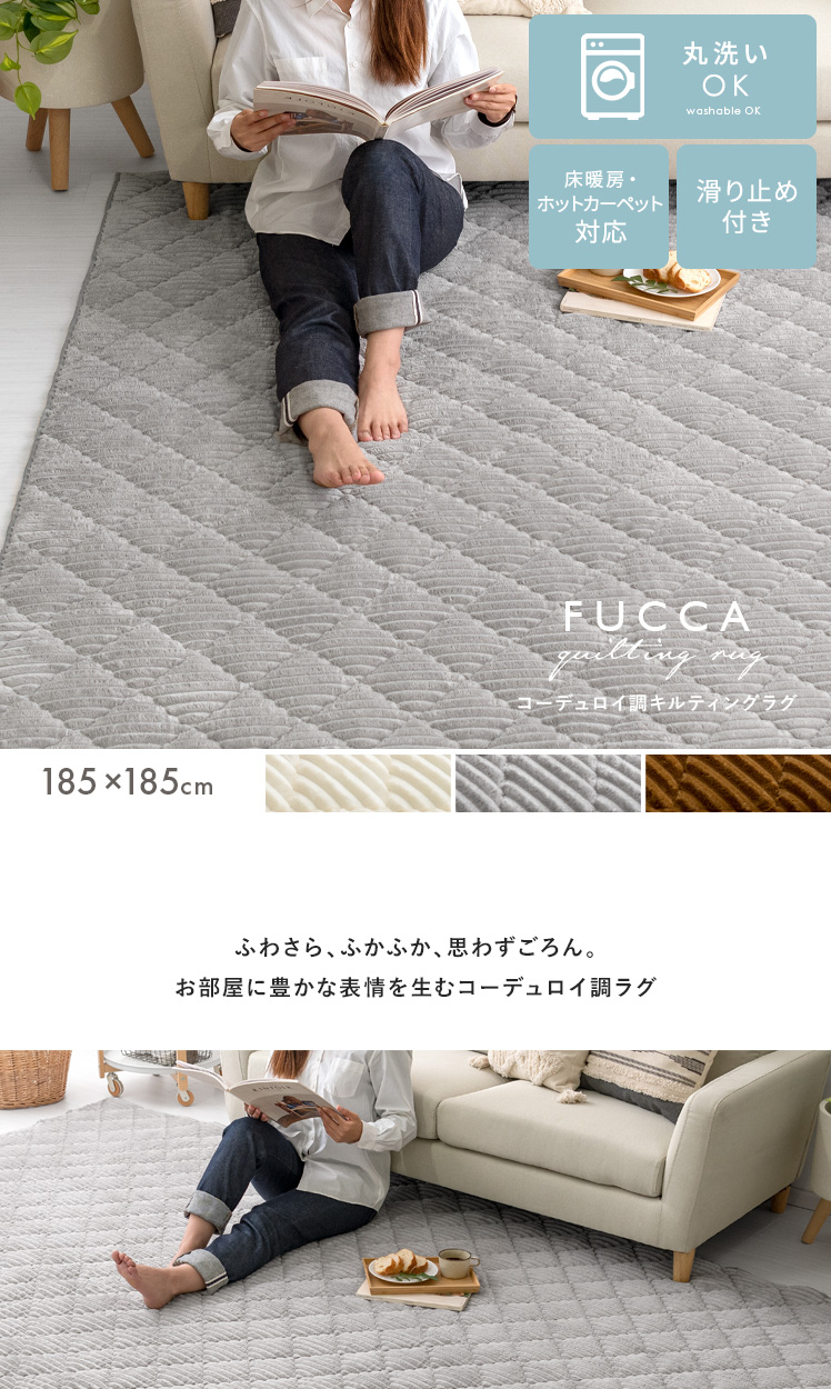 洗えるコーデュロイ調キルティングラグ FUCCA〔フッカ〕 185×185cm/とろける肌ざわりのフランネルをコーデュロイ調に仕上げ、さらにキルティング加工で仕立てたこちらのラグ。ふかふか中綿とウレタンフォームの2層クッションで、寝転んでも座っても気持ちいいボリューム感となっております。また、洗濯機で丸洗い可能でいつでも清潔に。ふわさら、ふかふか。思わずうとうとしてしまうほどの気持ちよさで、リビングに極上のくつろぎと温もりを。
