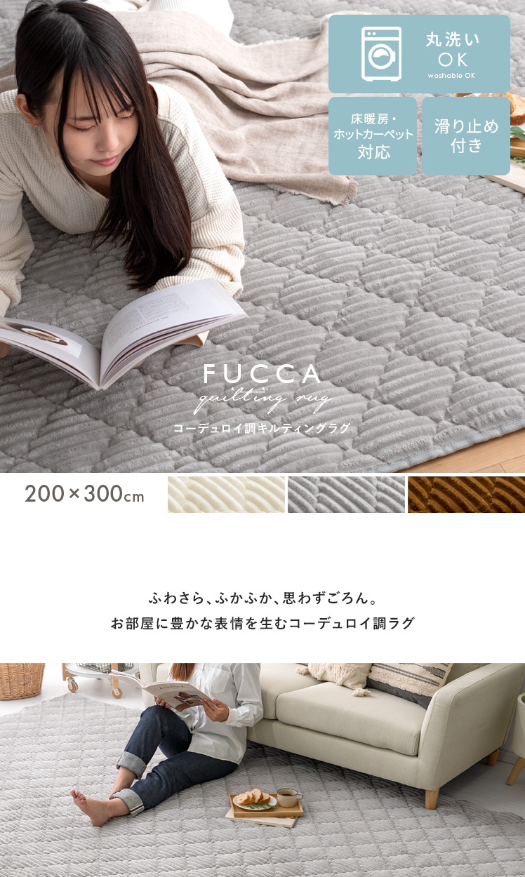 洗えるコーデュロイ調キルティングラグ FUCCA〔フッカ〕 200×300cm/とろける肌ざわりのフランネルをコーデュロイ調に仕上げ、さらにキルティング加工で仕立てたこちらのラグ。ふかふか中綿とウレタンフォームの2層クッションで、寝転んでも座っても気持ちいいボリューム感となっております。また、洗濯機で丸洗い可能でいつでも清潔に。ふわさら、ふかふか。思わずうとうとしてしまうほどの気持ちよさで、リビングに極上のくつろぎと温もりを。