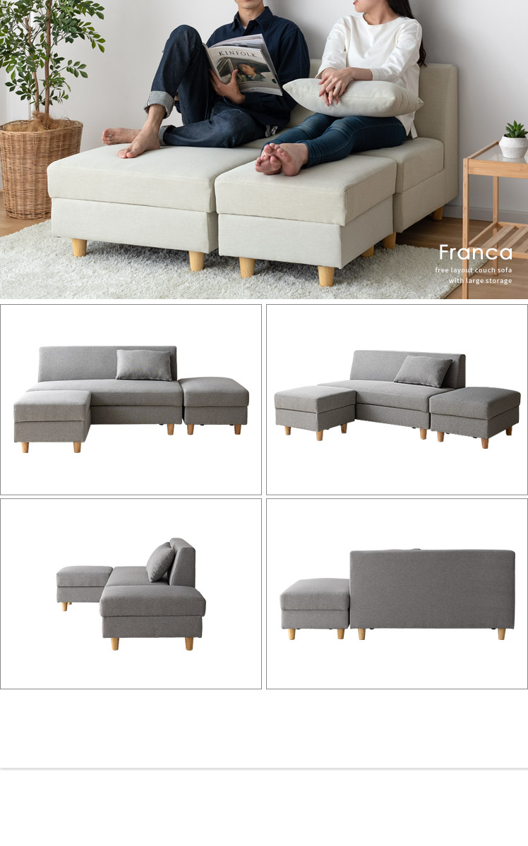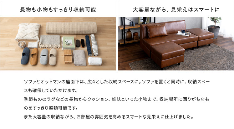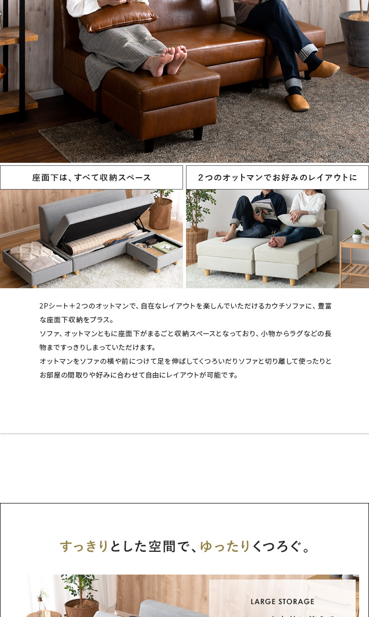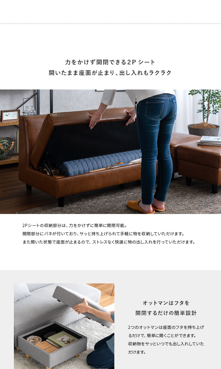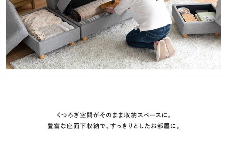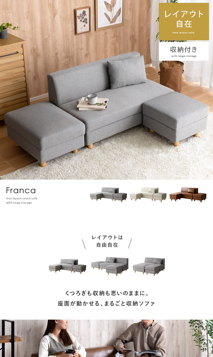 収納付きカウチソファ Franca〔フランカ〕2Pシート+2つのオットマンで、自在なレイアウトを楽しんでいただけるカウチソファに、豊富な座面下収納をプラス。座面下がまるごと収納スペースとなっており、小物から長物まですっきりしまっていただけます。オットマンをソファの横や前につけて足を伸ばしてくつろいだりソファと切り離して使ったりと、お部屋の間取りや好みに合わせて自由にレイアウトが可能です。