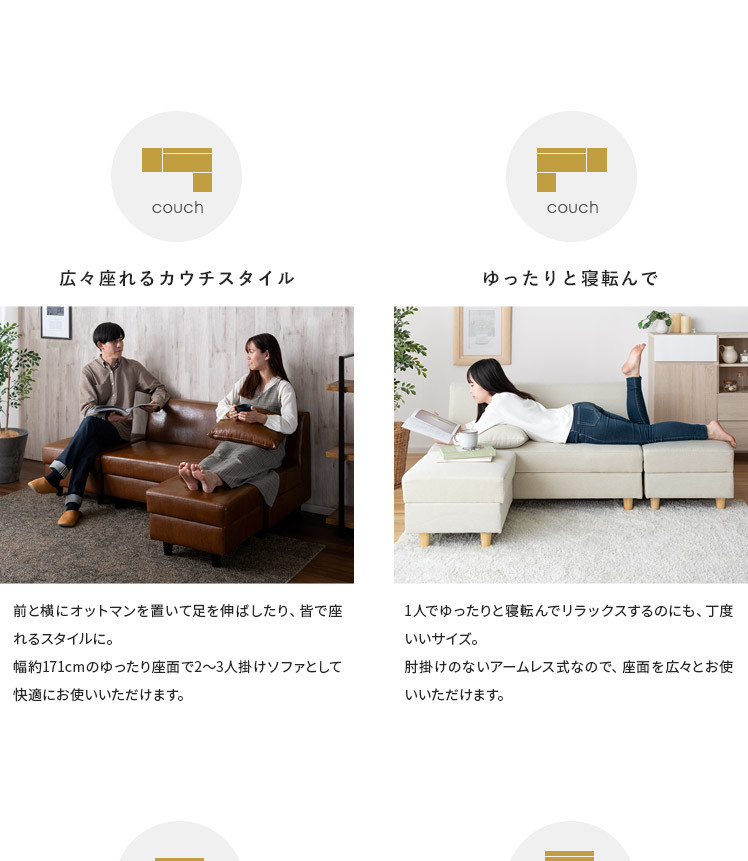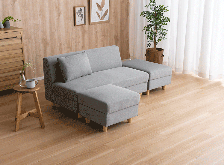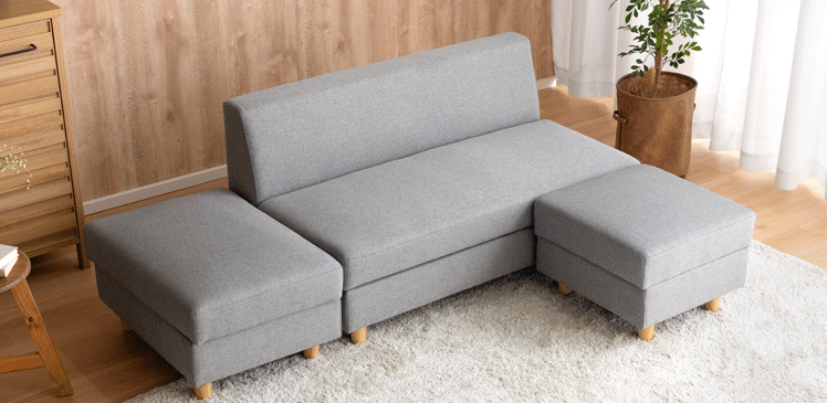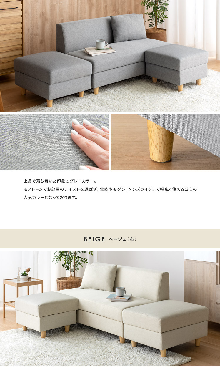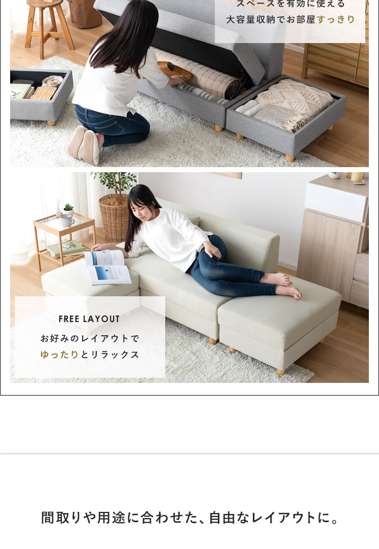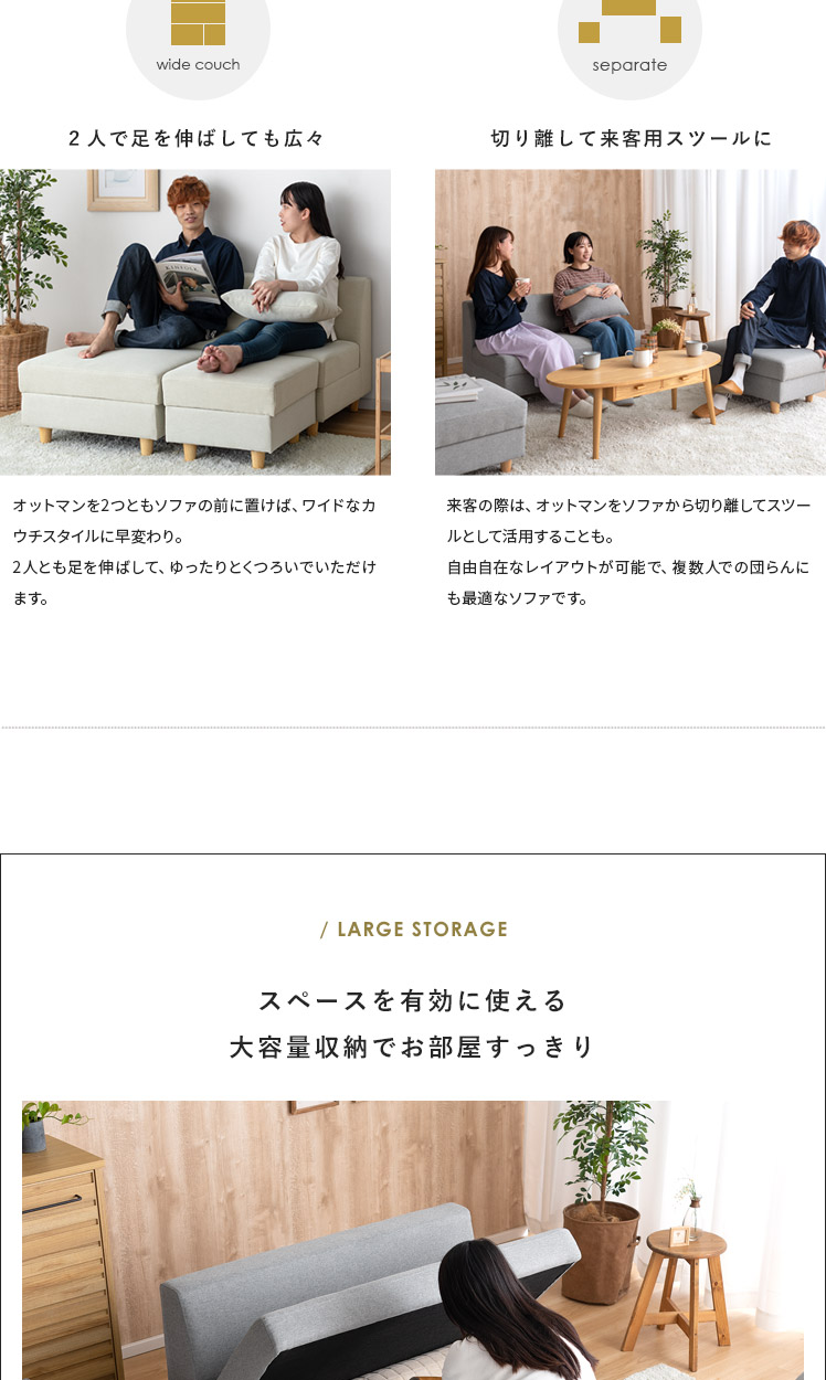 収納付きカウチソファ Franca〔フランカ〕2Pシート+2つのオットマンで、自在なレイアウトを楽しんでいただけるカウチソファに、豊富な座面下収納をプラス。座面下がまるごと収納スペースとなっており、小物から長物まですっきりしまっていただけます。オットマンをソファの横や前につけて足を伸ばしてくつろいだりソファと切り離して使ったりと、お部屋の間取りや好みに合わせて自由にレイアウトが可能です。
