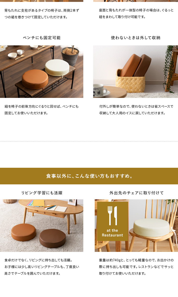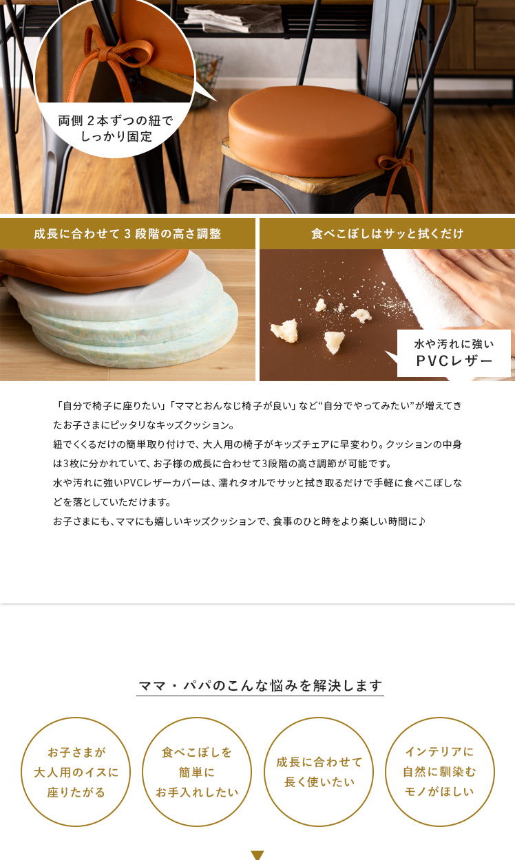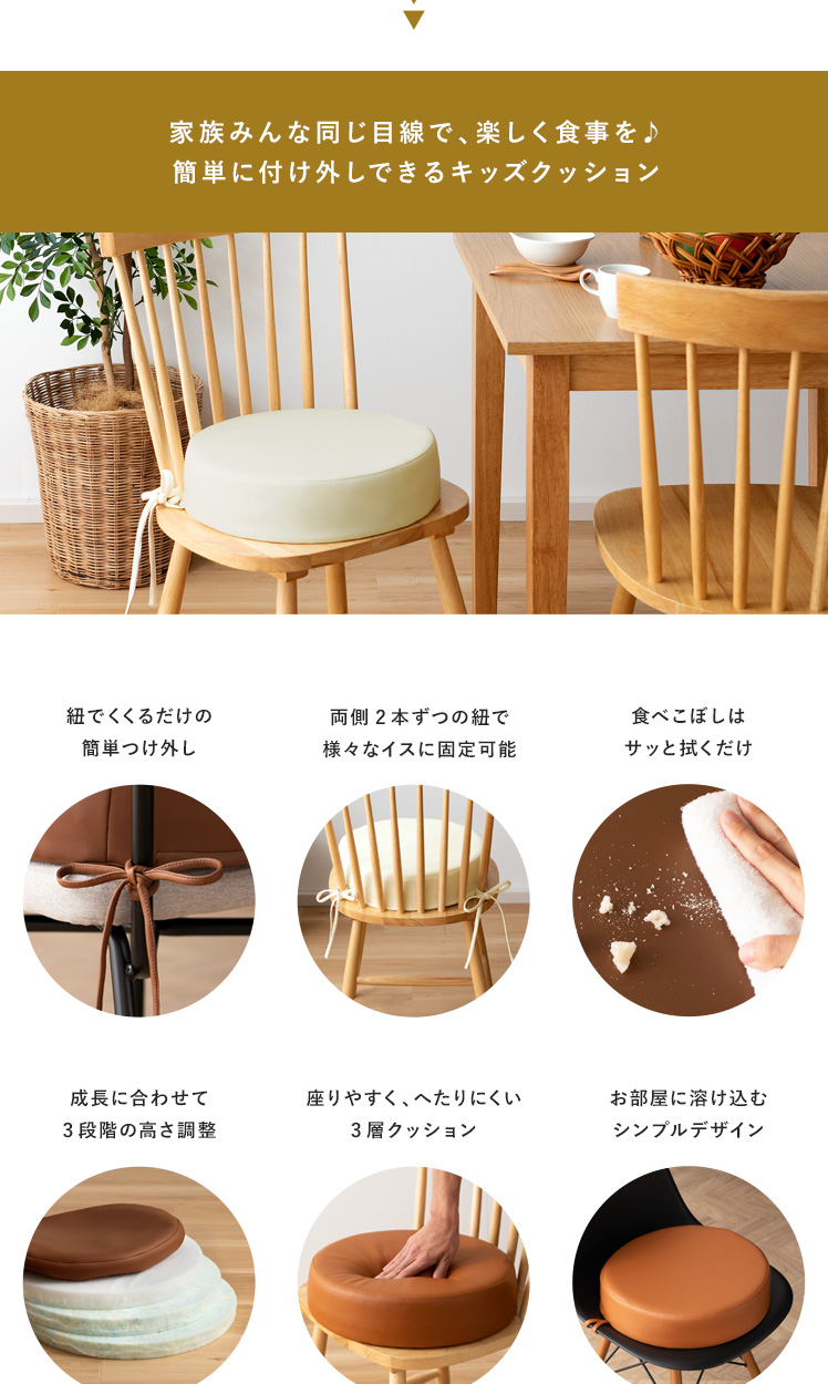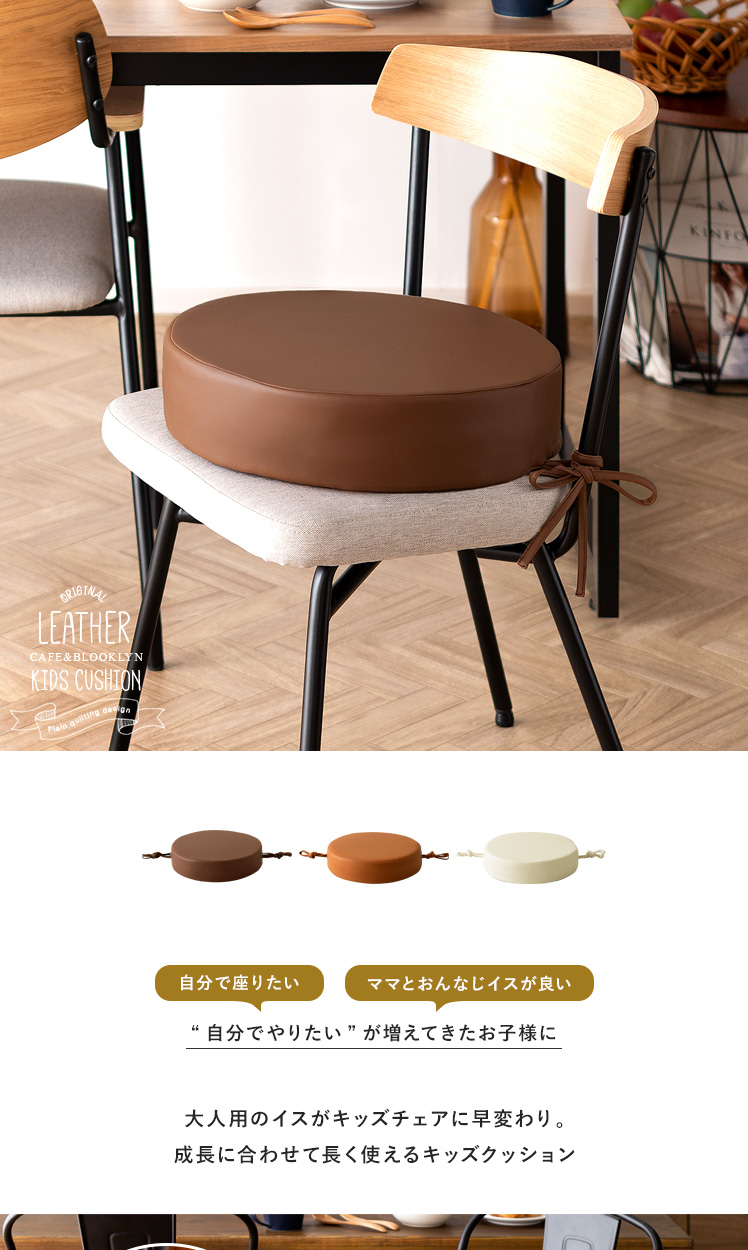 キッズクッション レザータイプ/「自分で椅子に座りたい」「ママとおんなじ椅子が良い」など“自分でやってみたい”が増えてきたお子さまにピッタリなキッズクッション。紐でくくるだけの簡単取り付けで、大人用の椅子がキッズチェアに早変わり。クッションの中身は3枚に分かれていて、お子様の成長に合わせて3段階の高さ調節が可能です。水や汚れに強いPVCレザーカバーは、濡れタオルでサッと拭き取るだけで手軽に食べこぼしなどを落としていただけます。お子さまにも、ママにも嬉しいキッズクッションで、食事のひと時をより楽しい時間に♪