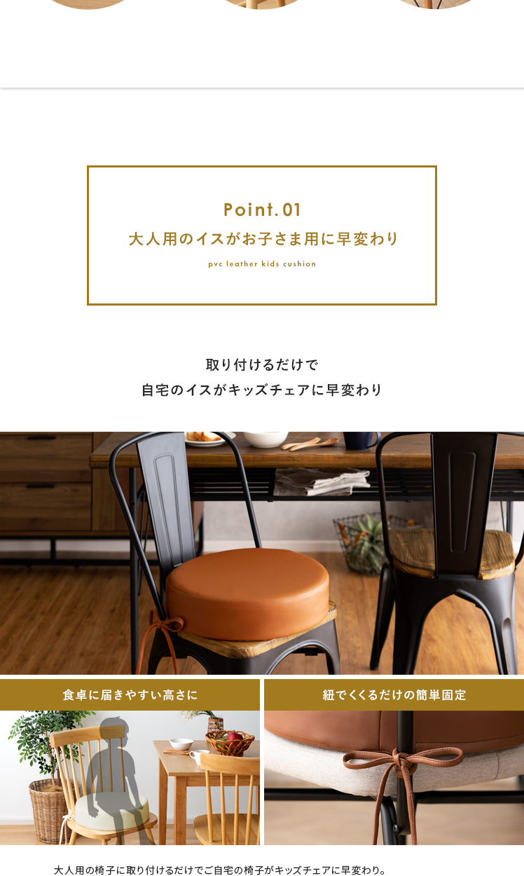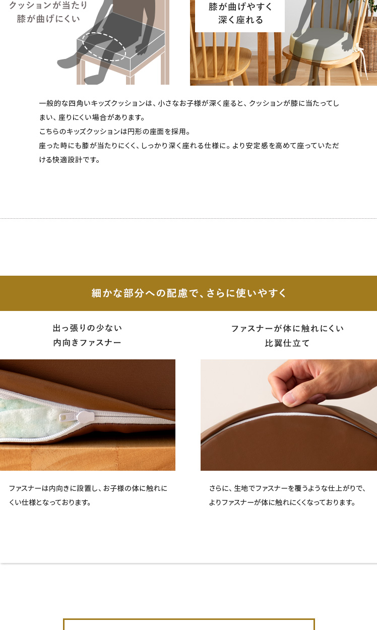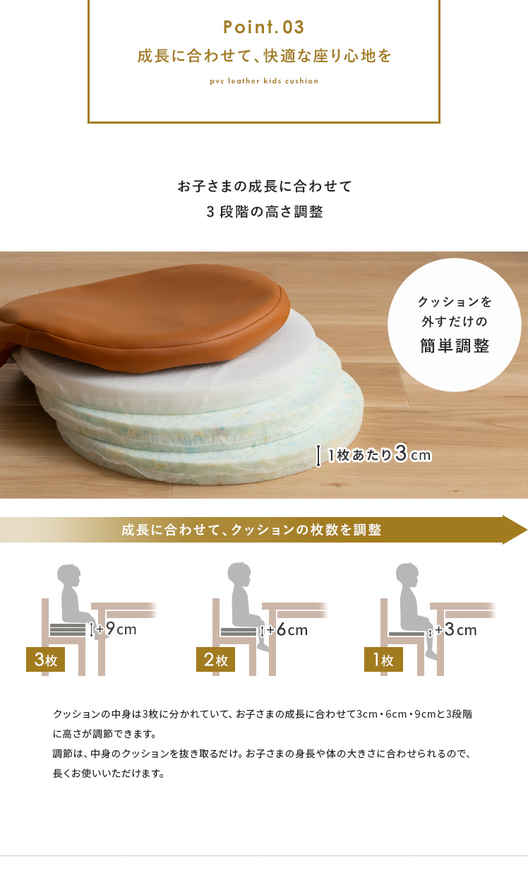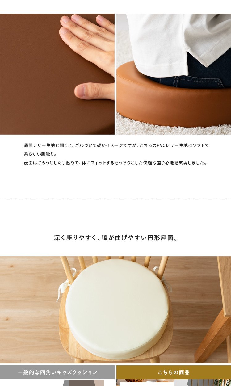 キッズクッション レザータイプ/「自分で椅子に座りたい」「ママとおんなじ椅子が良い」など“自分でやってみたい”が増えてきたお子さまにピッタリなキッズクッション。紐でくくるだけの簡単取り付けで、大人用の椅子がキッズチェアに早変わり。クッションの中身は3枚に分かれていて、お子様の成長に合わせて3段階の高さ調節が可能です。水や汚れに強いPVCレザーカバーは、濡れタオルでサッと拭き取るだけで手軽に食べこぼしなどを落としていただけます。お子さまにも、ママにも嬉しいキッズクッションで、食事のひと時をより楽しい時間に♪