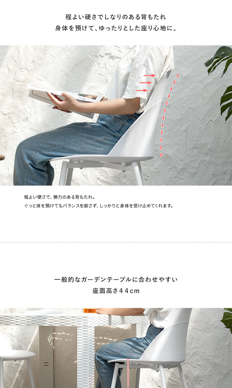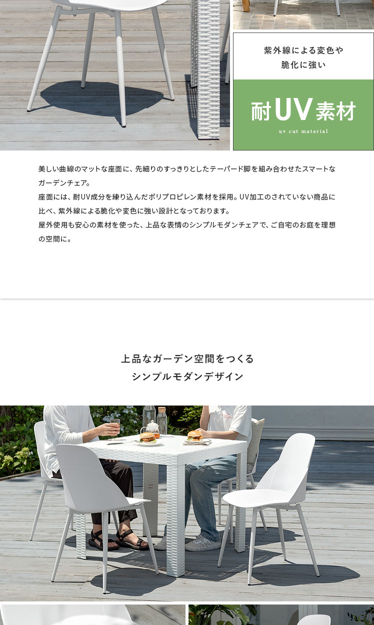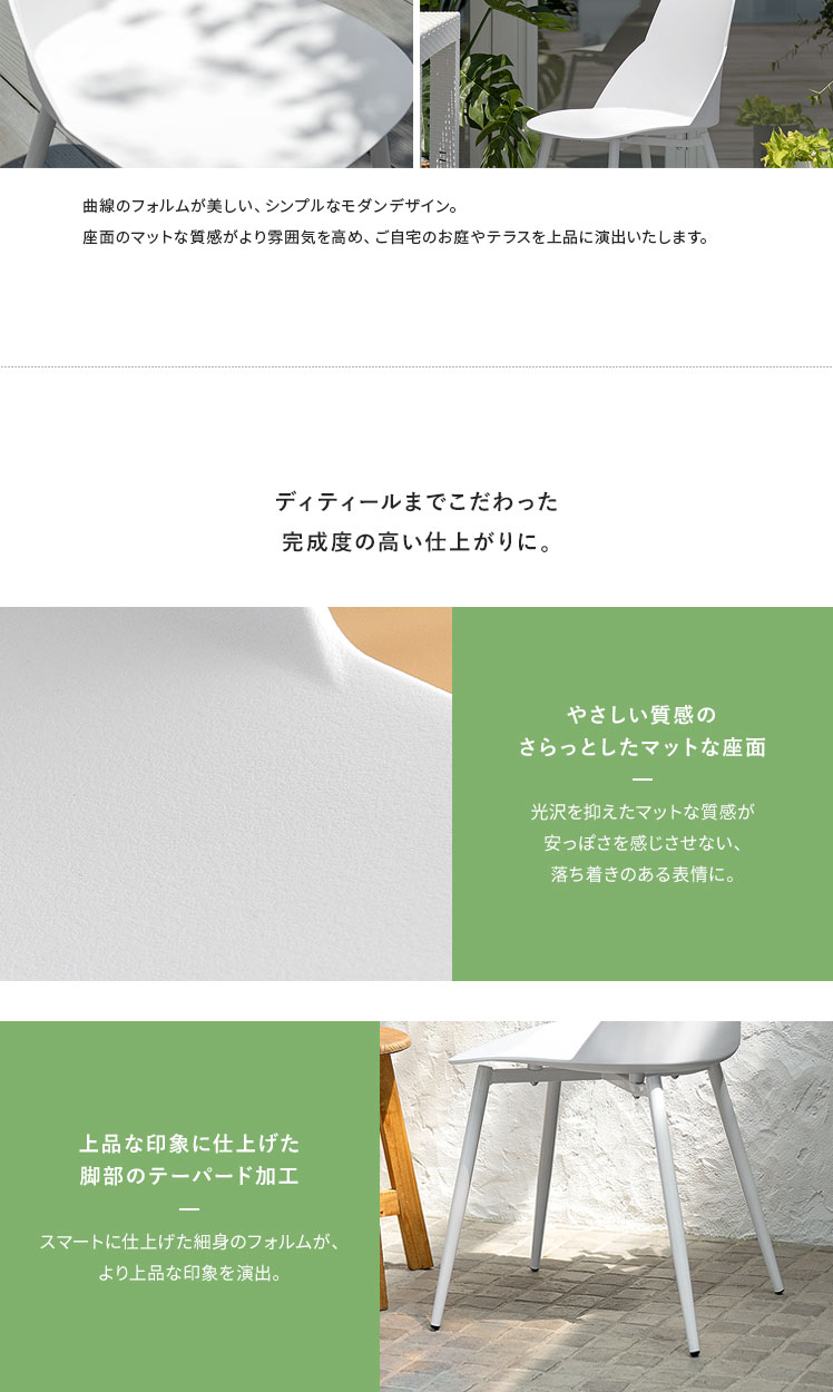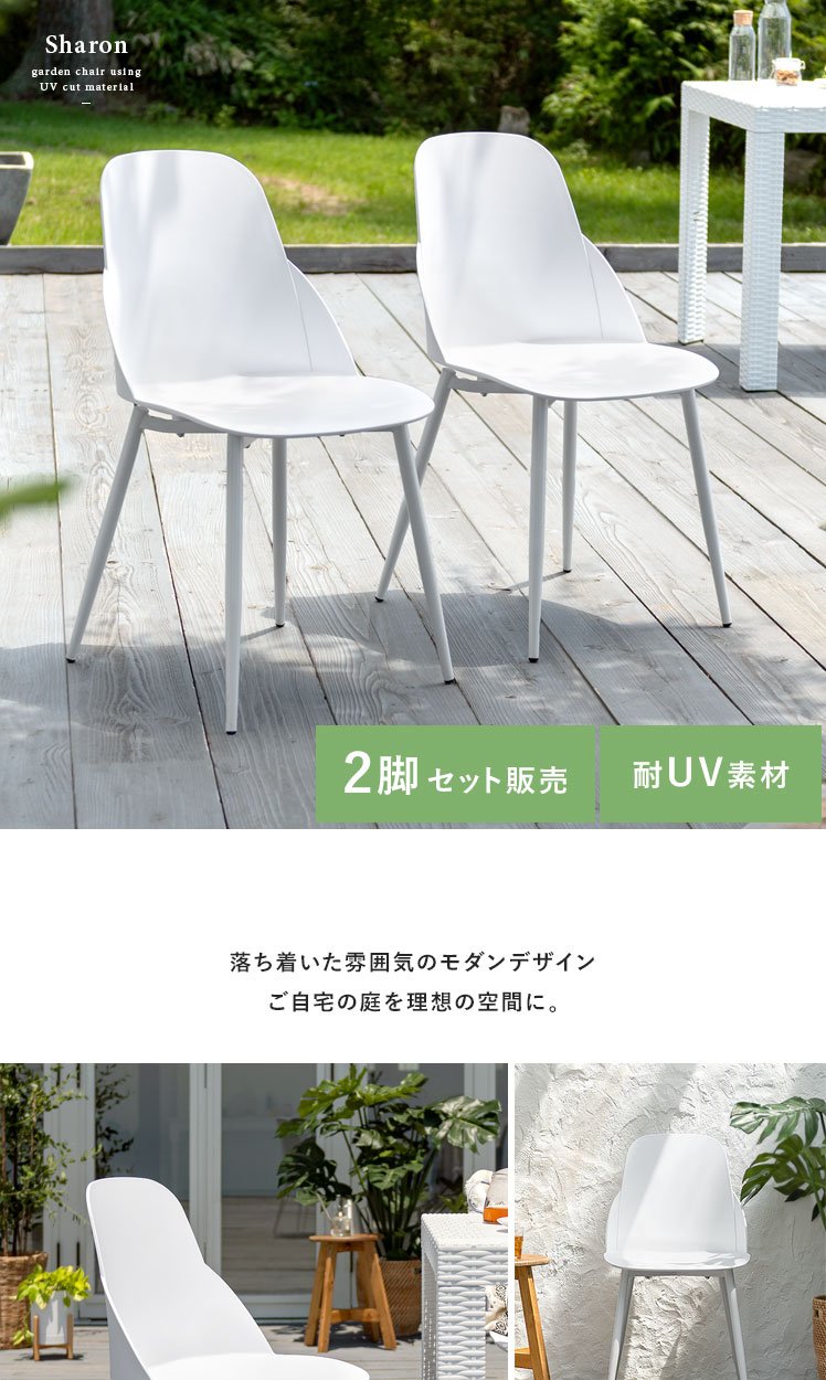 ガーデンチェアSharon〔シャロン〕 2脚セット販売/美しい曲線のマットな座面に、先細りのすっきりとしたテーパード脚を組み合わせたスマートなガーデンチェア。座面には、耐UV成分を練り込んだポリプロピレン素材を採用。UV加工のされていない商品に比べ、紫外線による脆化や変色に強い設計となっております。屋外使用も安心の素材を使った、上品な表情のシンプルモダンチェアで、ご自宅のお庭を理想の空間に。