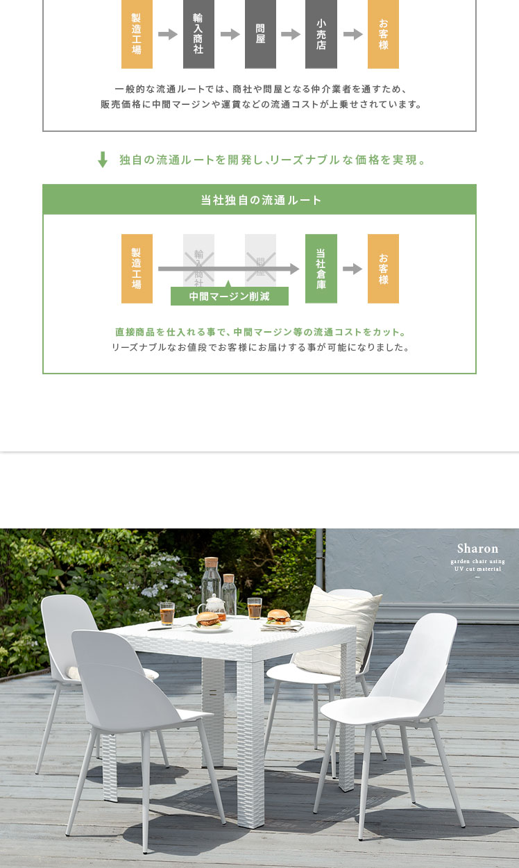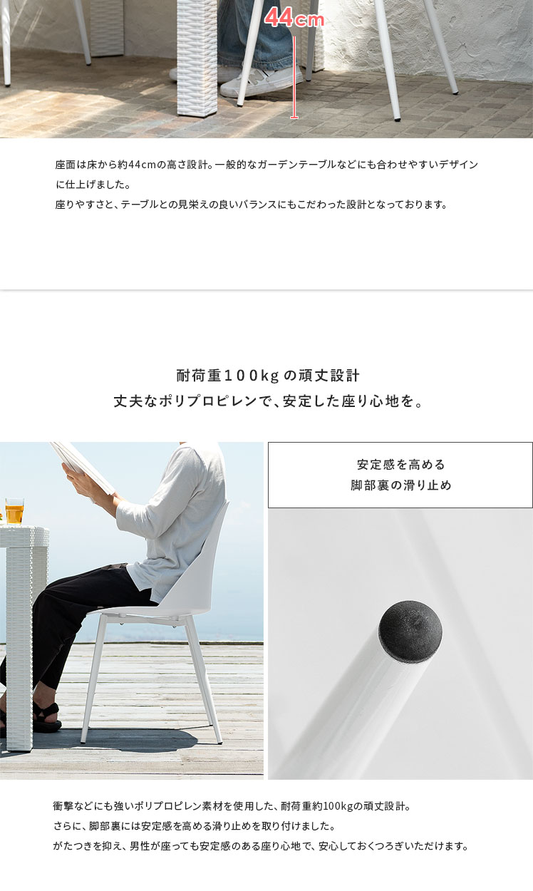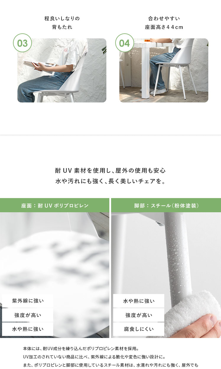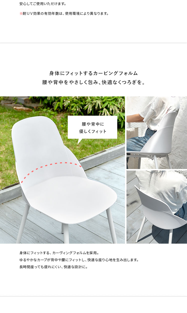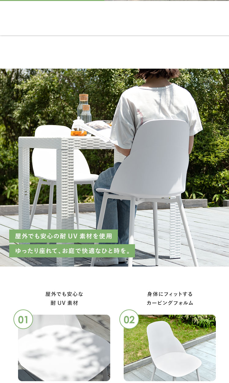 ガーデンチェアSharon〔シャロン〕 2脚セット販売/美しい曲線のマットな座面に、先細りのすっきりとしたテーパード脚を組み合わせたスマートなガーデンチェア。座面には、耐UV成分を練り込んだポリプロピレン素材を採用。UV加工のされていない商品に比べ、紫外線による脆化や変色に強い設計となっております。屋外使用も安心の素材を使った、上品な表情のシンプルモダンチェアで、ご自宅のお庭を理想の空間に。