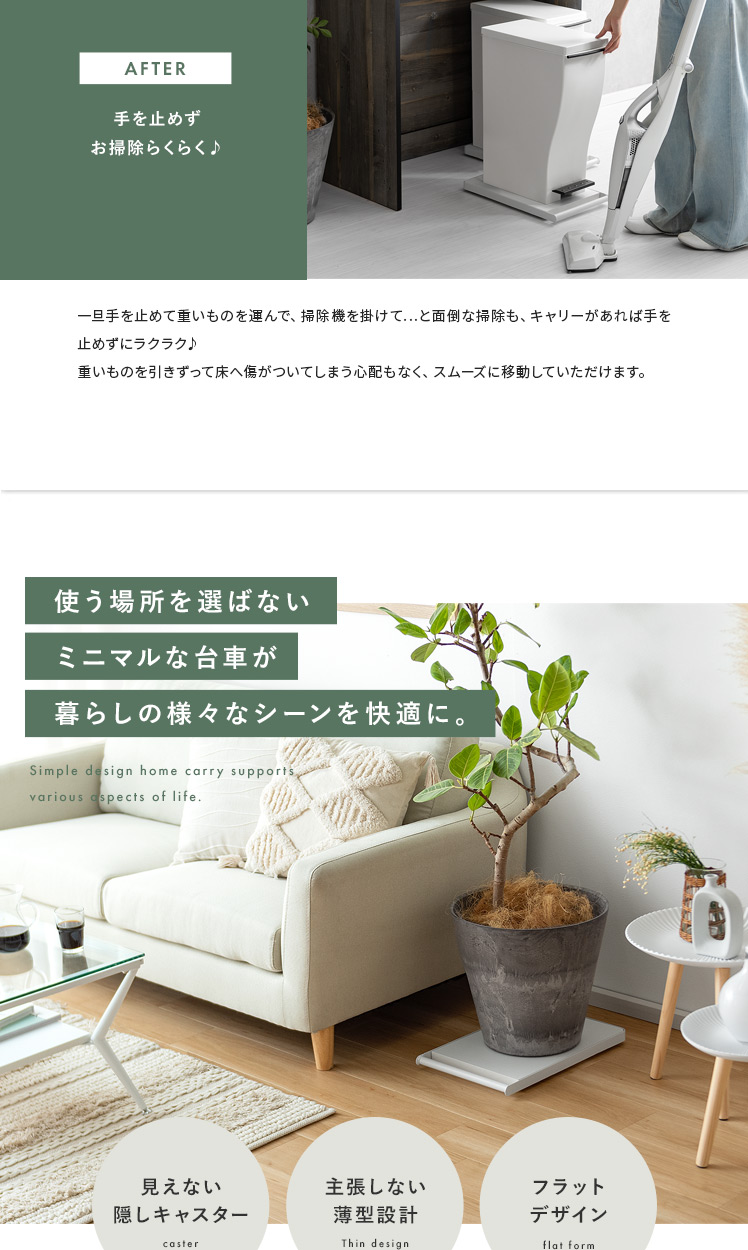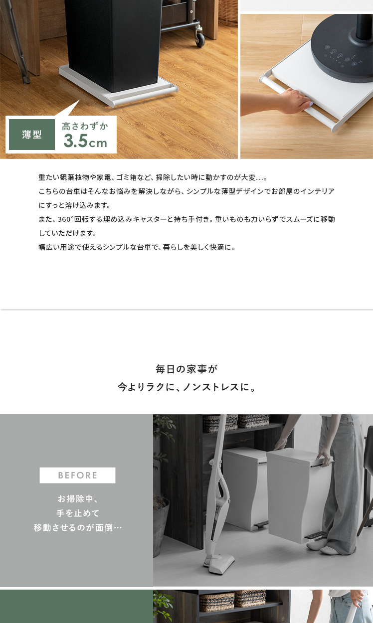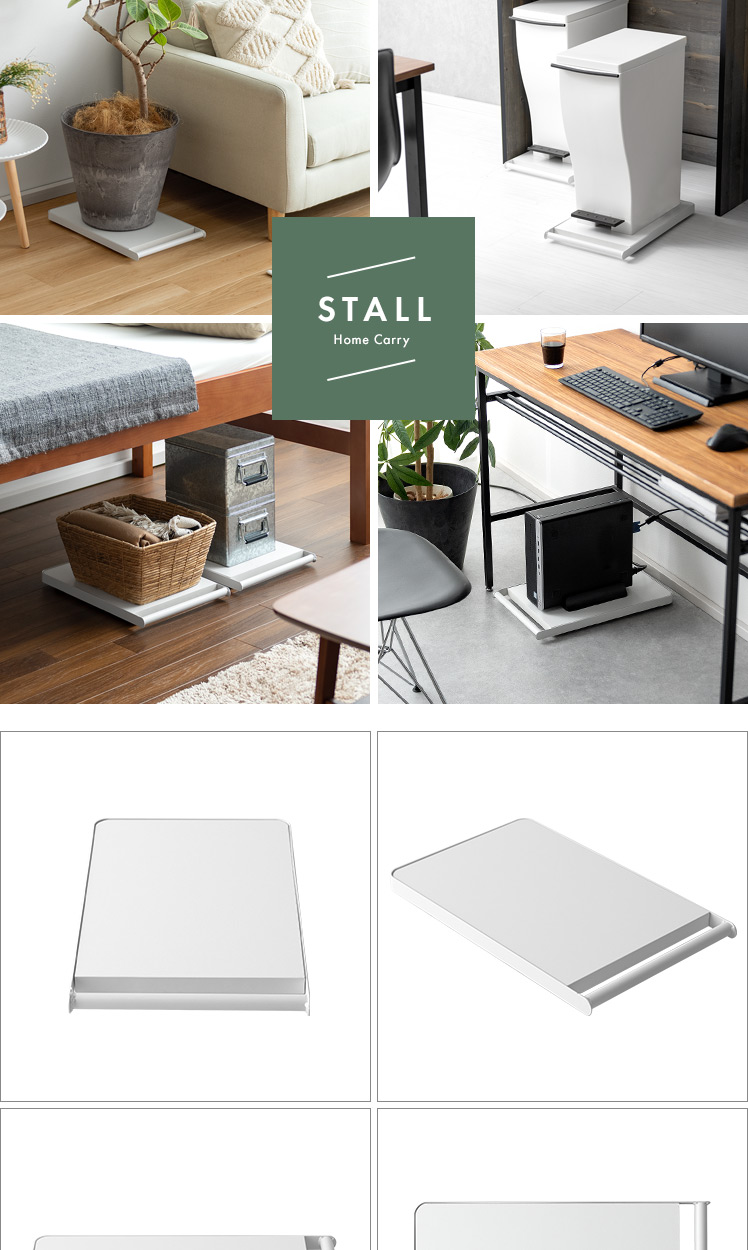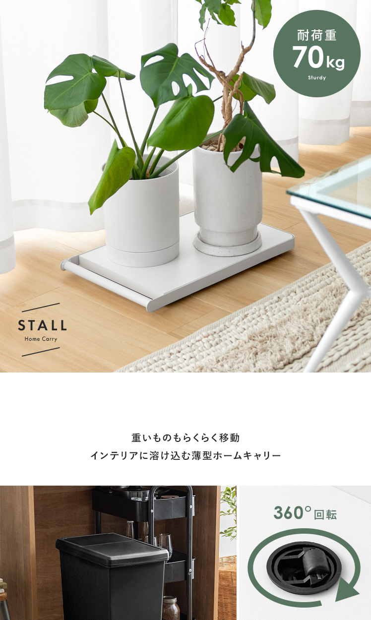 薄型ホームキャリー STALL〔ストール〕/重たい観葉植物や家電、ゴミ箱など、掃除したい時に動かすのが大変…。こちらの台車はそんなお悩みを解決しながら、シンプルな薄型デザインでお部屋のインテリアにすっと溶け込みます。また、360°回転する埋め込みキャスターと持ち手付き。重いものも力いらずでスムーズに移動していただけます。幅広い用途で使えるシンプルな台車で、暮らしを美しく快適に。