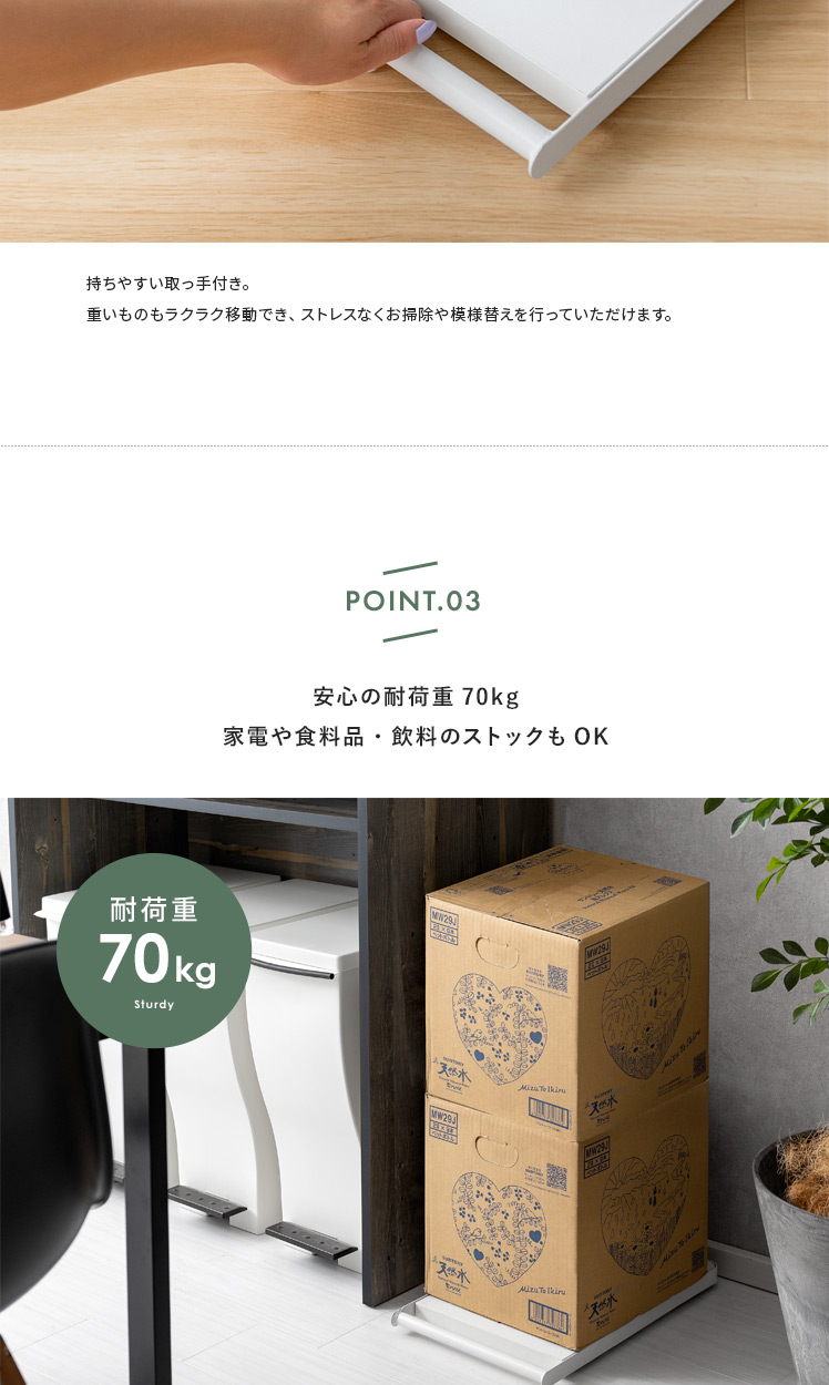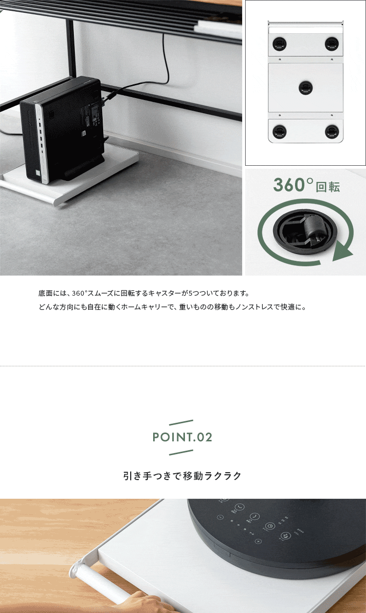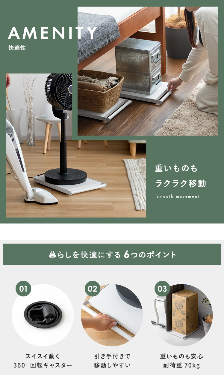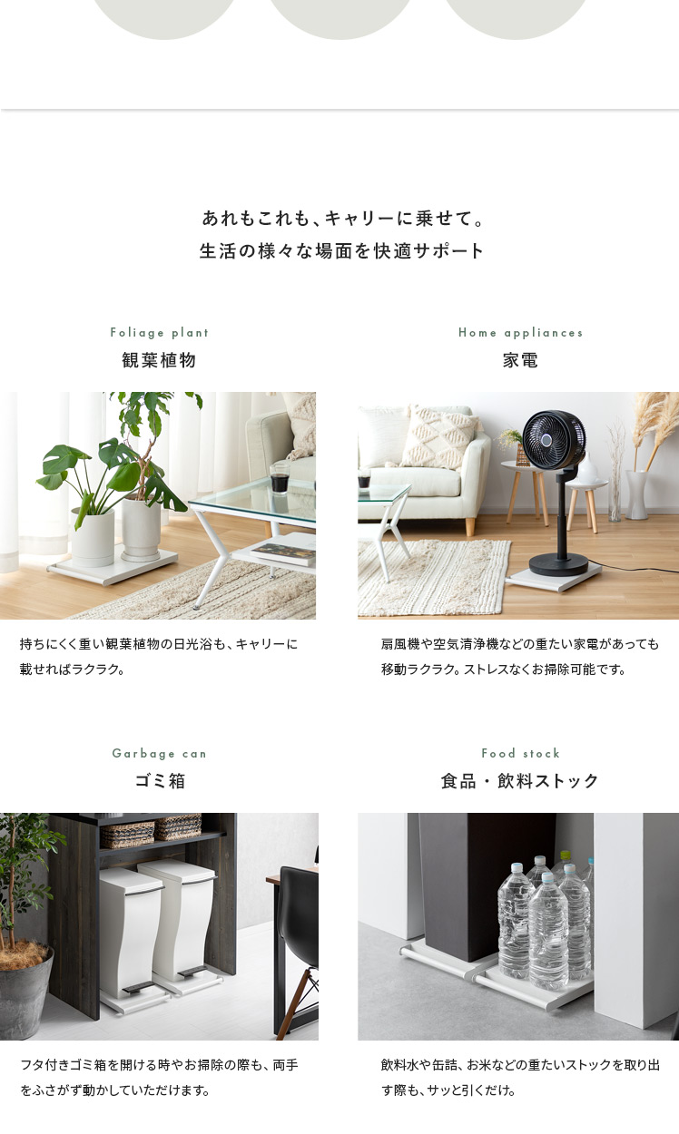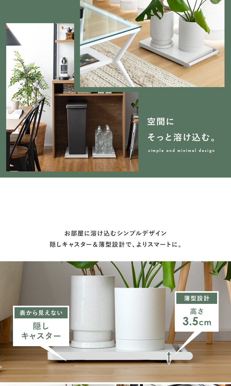 薄型ホームキャリー STALL〔ストール〕/重たい観葉植物や家電、ゴミ箱など、掃除したい時に動かすのが大変…。こちらの台車はそんなお悩みを解決しながら、シンプルな薄型デザインでお部屋のインテリアにすっと溶け込みます。また、360°回転する埋め込みキャスターと持ち手付き。重いものも力いらずでスムーズに移動していただけます。幅広い用途で使えるシンプルな台車で、暮らしを美しく快適に。