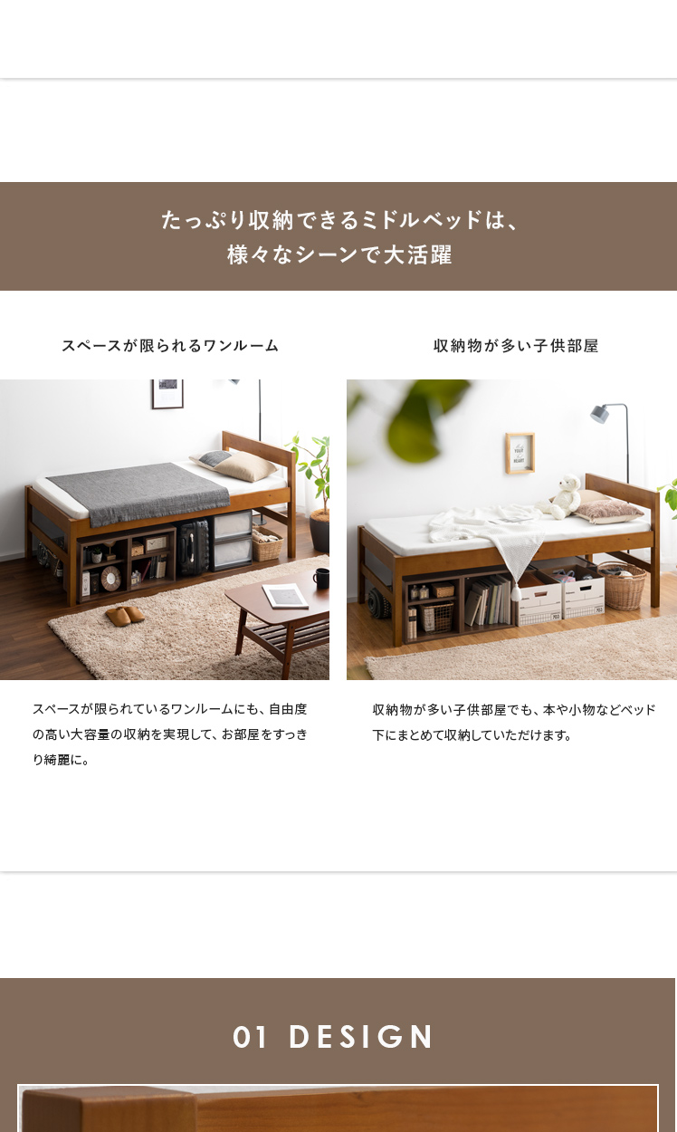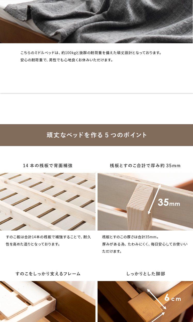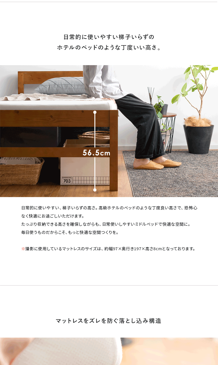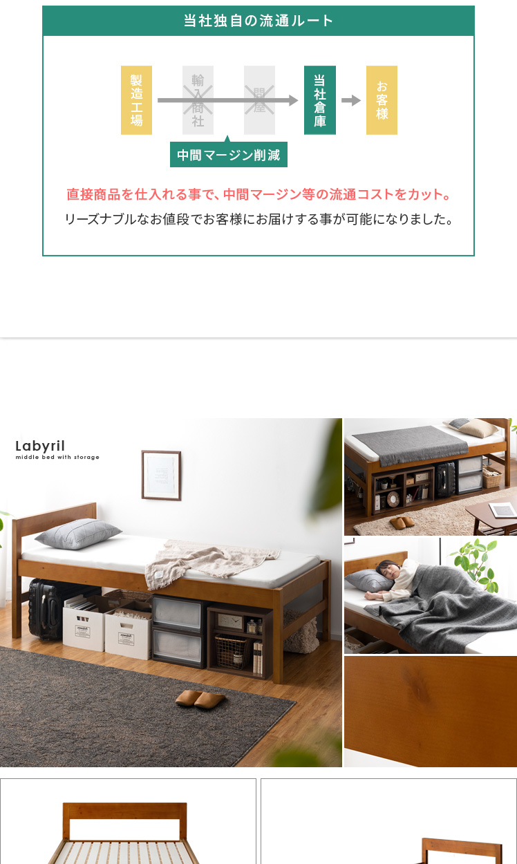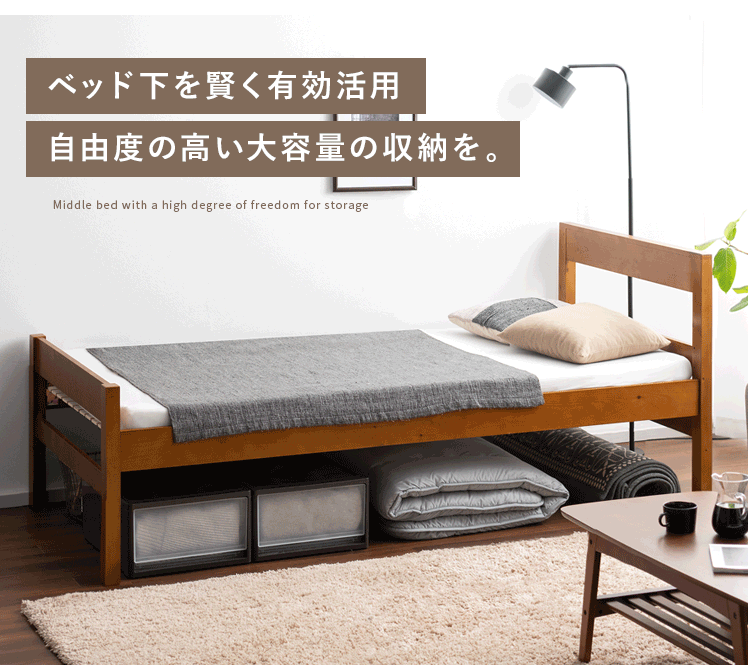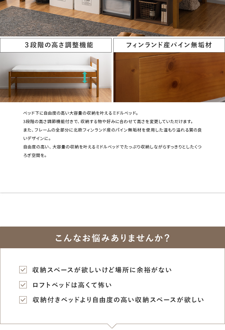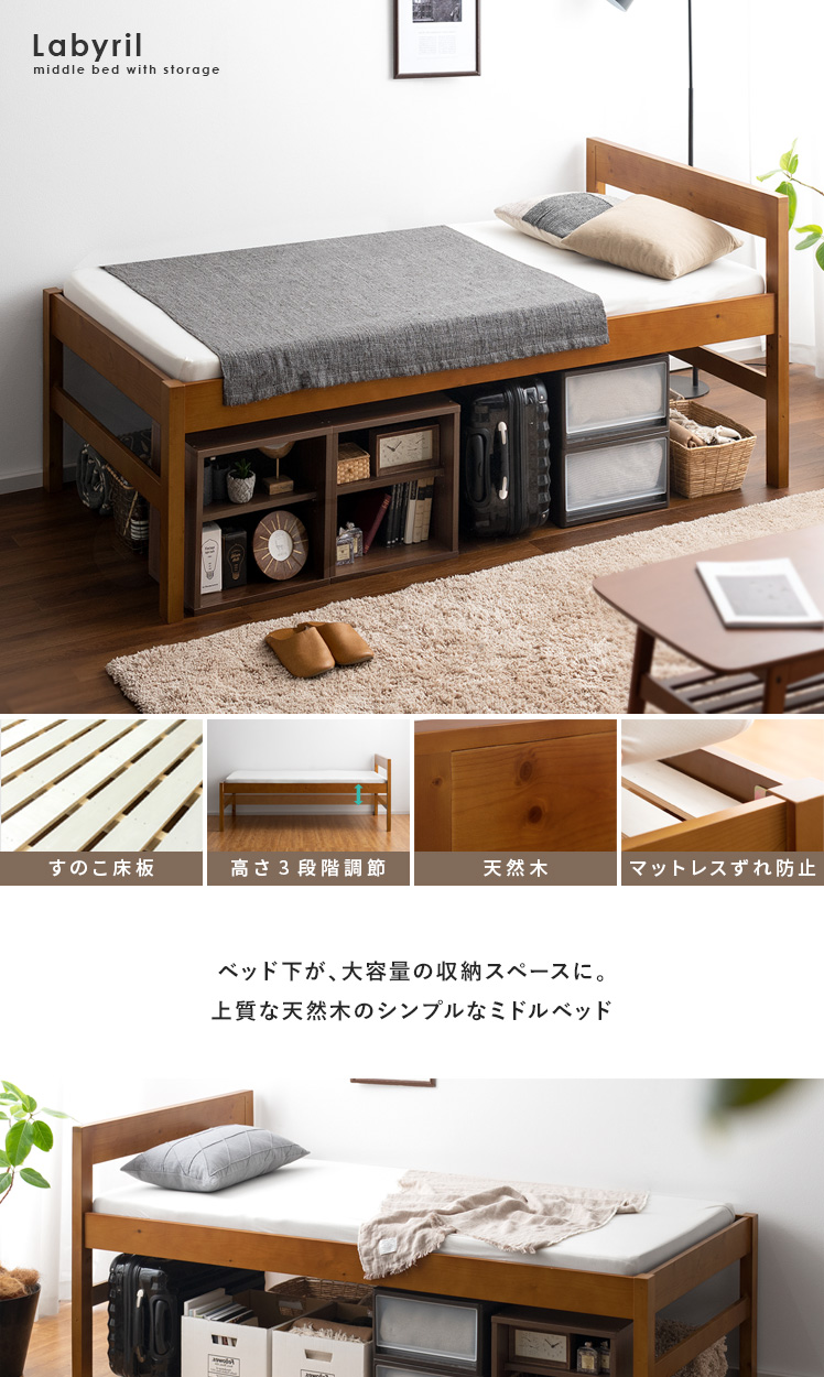 木製ミドルベッド Labyril〔ラビリル〕/ベッド下に自由度の高い大容量の収納を叶えるミドルベッド。3段階の高さ調節機能付きで、収納する物や好みに合わせて高さを変更していただけます。また、フレームの全部分に北欧フィンランド産のパイン無垢材を使用した温もり溢れる質の良いデザインに。自由度の高い、大容量の収納を叶えるミドルベッドでたっぷり収納しながらすっきりとしたくつろぎ空間を。