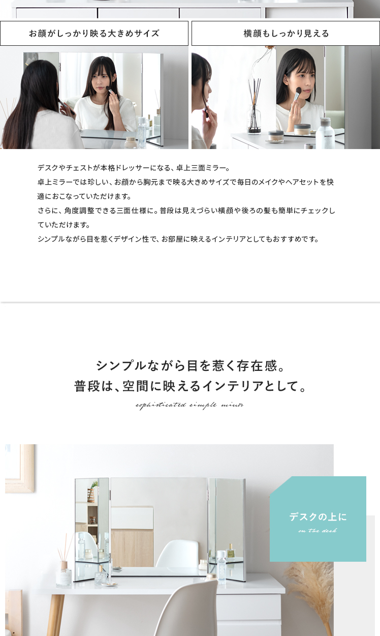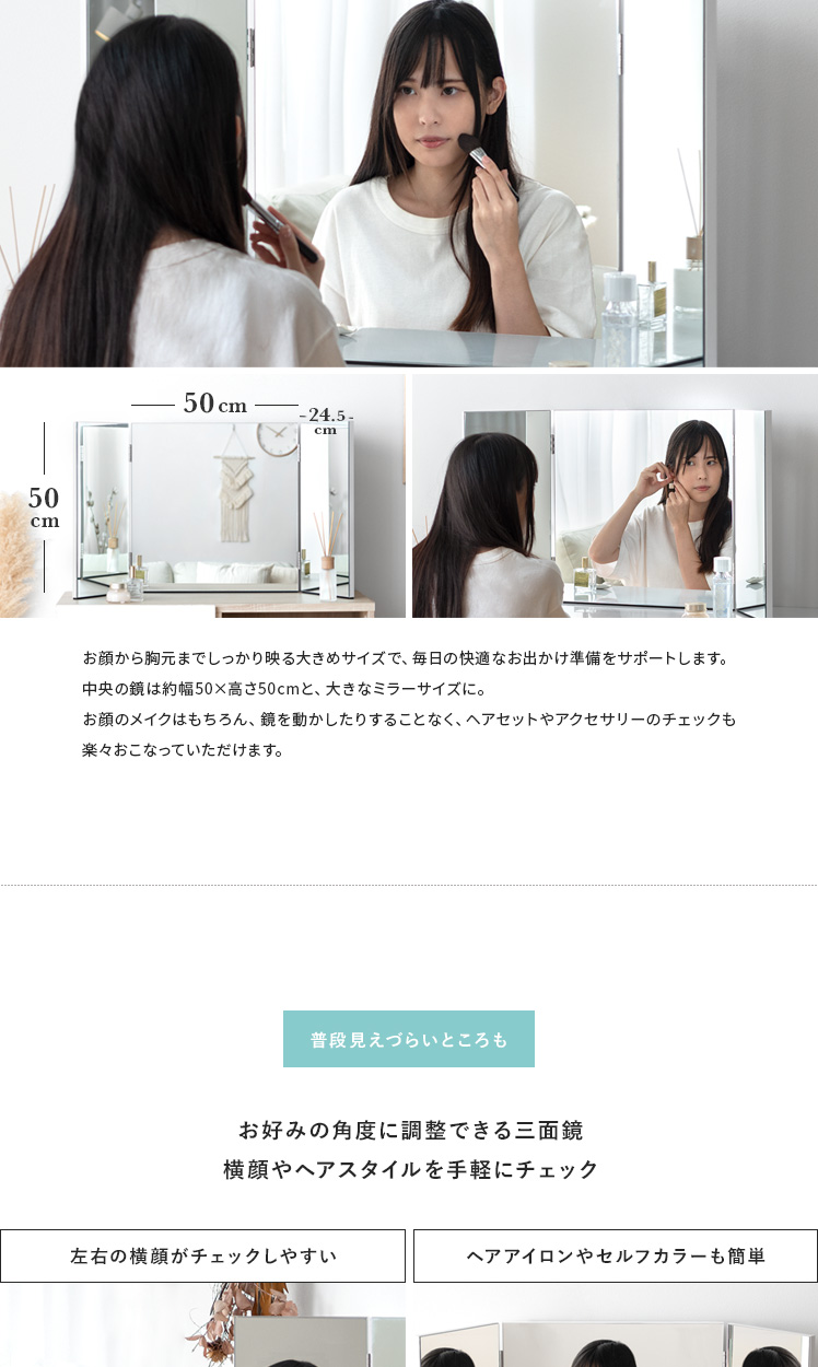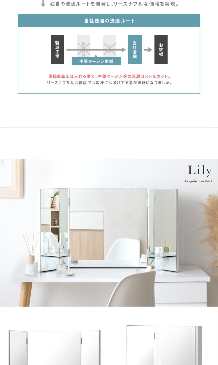 大型卓上三面鏡 Lily〔リリー〕/デスクやチェストが本格ドレッサーになる、卓上三面ミラー。卓上ミラーでは珍しい、お顔から胸元まで映る大きめサイズで毎日のメイクやヘアセットを快適におこなっていただけます。さらに、角度調整できる三面仕様に。普段は見えづらい横顔や後ろの髪も簡単にチェックしていただけます。シンプルながら目を惹くデザイン性で、お部屋に映えるインテリアとしてもおすすめです。