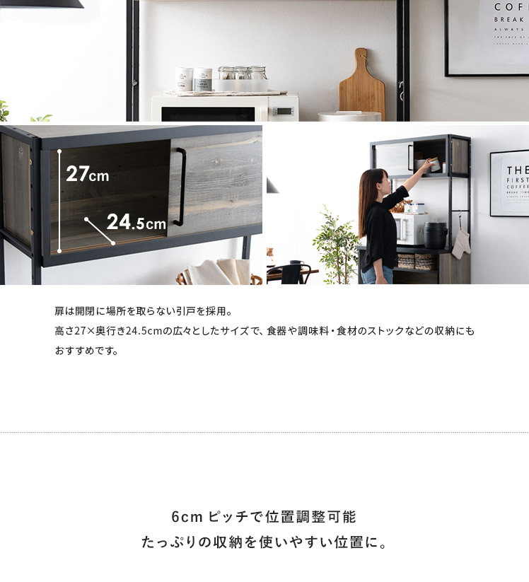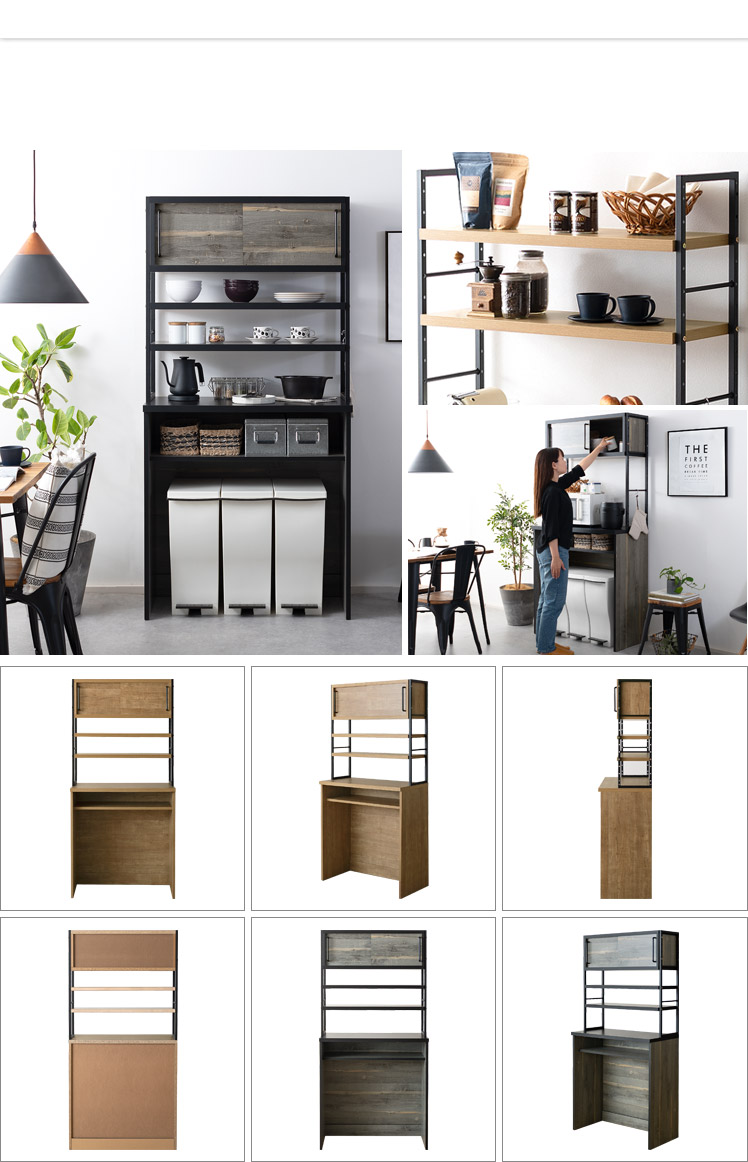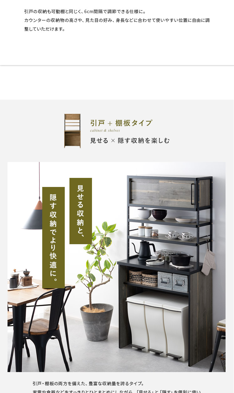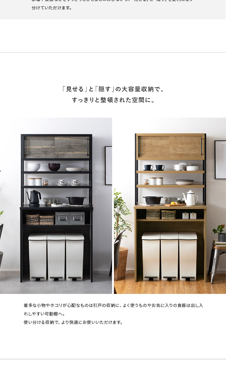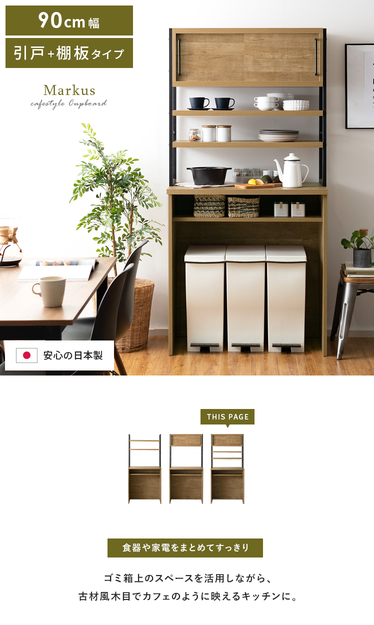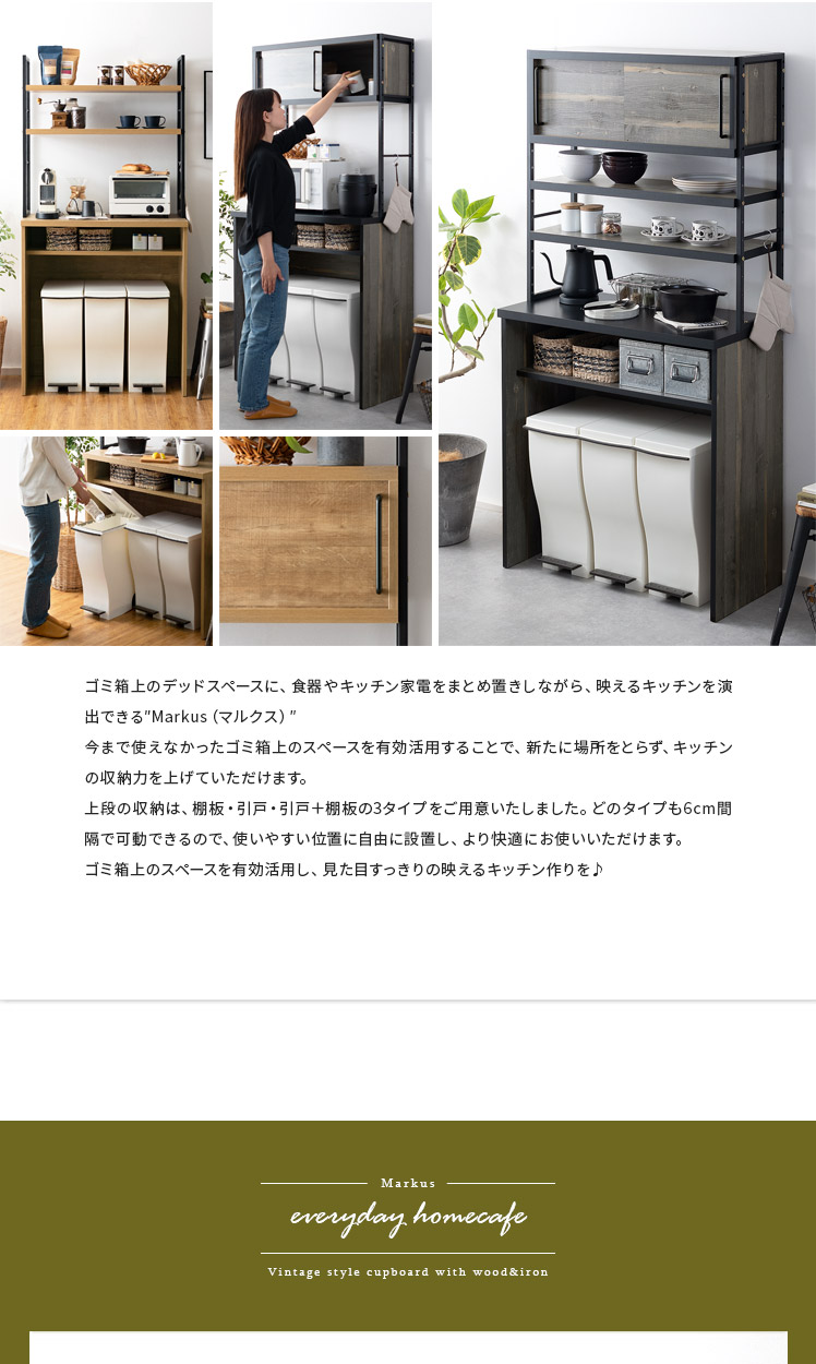 アイアンフレーム食器棚 Markus〔マルクス〕 幅90cm 引戸+棚板タイプ/ゴミ箱上のデッドスペースに、食器やキッチン家電をまとめ置きしながら、映えるキッチンを演出できる″Markus(マルクス)″今まで使えなかったゴミ箱上のスペースを有効活用することで、新たに場所をとらず、キッチンの収納力を上げていただけます。上段の収納は、棚板・引戸・引戸+棚板の3タイプをご用意いたしました。どのタイプも6cm間隔で可動できるので、使いやすい位置に自由に設置し、より快適にお使いいただけます。ゴミ箱上のスペースを有効活用し、見た目すっきりの映えるキッチン作りを♪