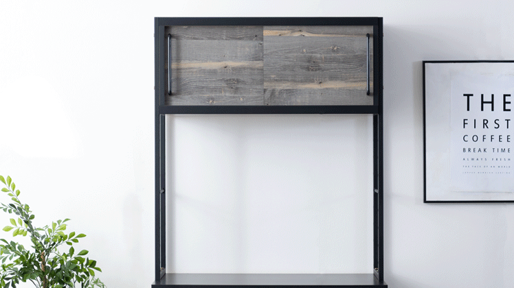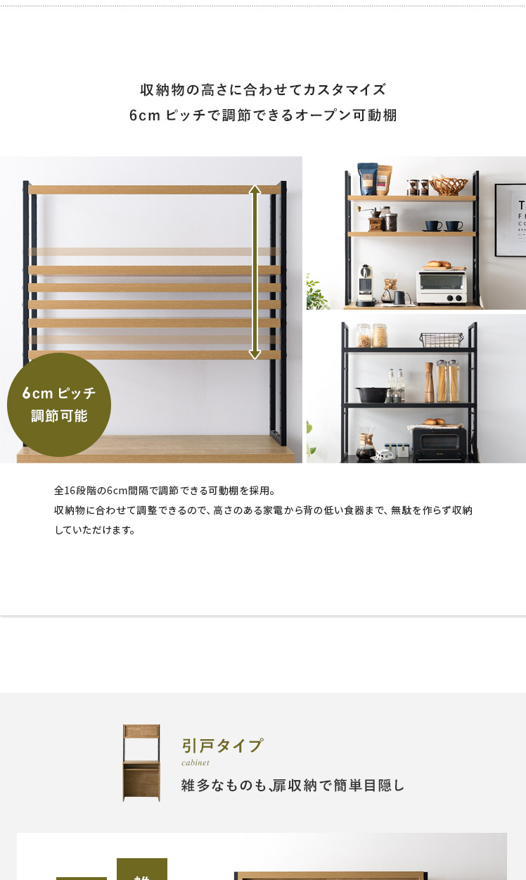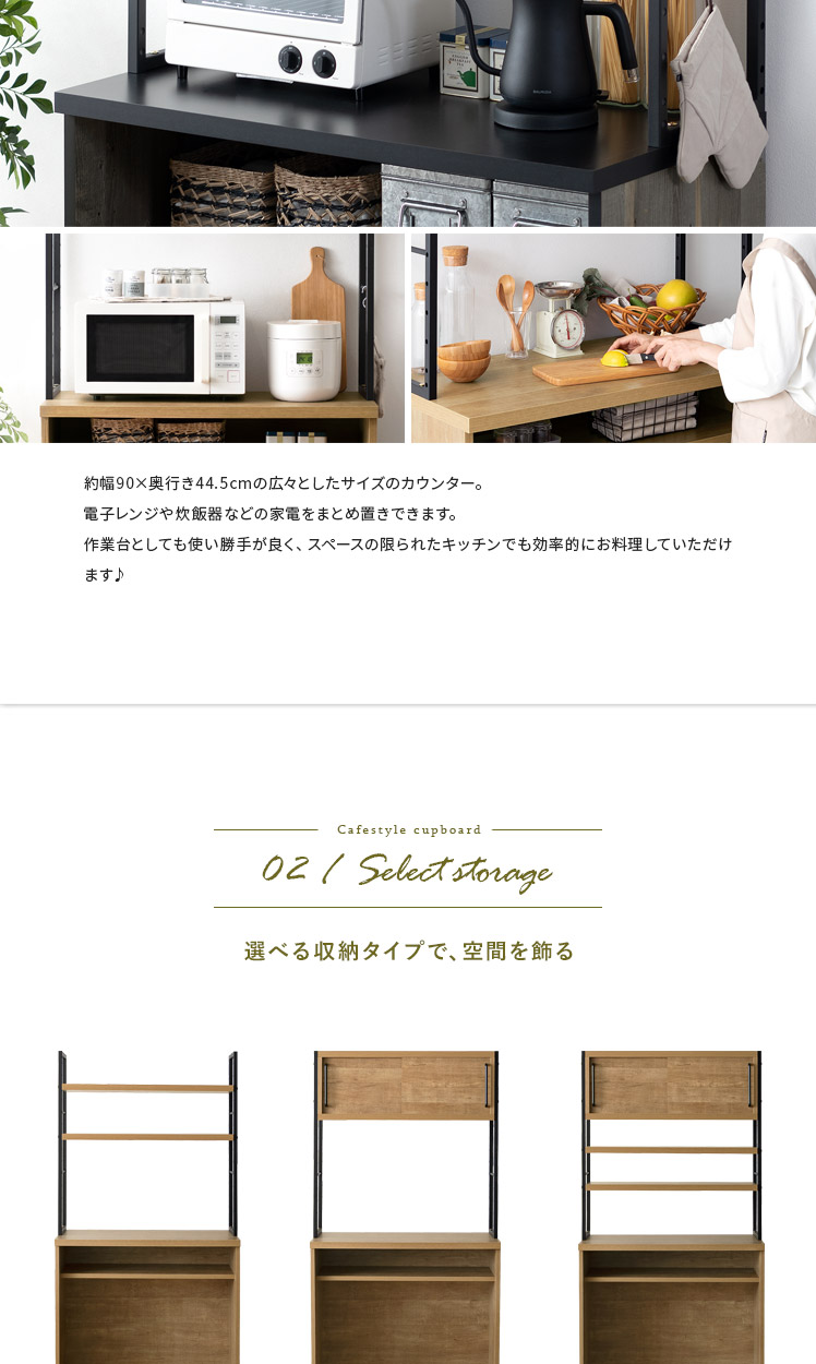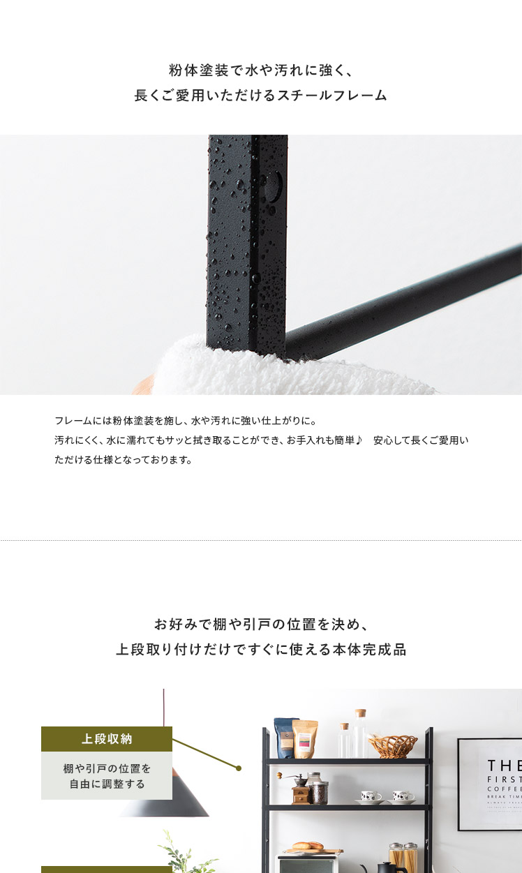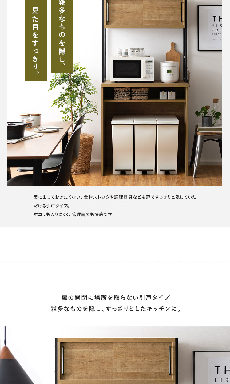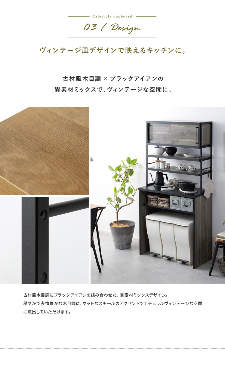 アイアンフレーム食器棚 Markus〔マルクス〕 幅90cm 引戸+棚板タイプ/ゴミ箱上のデッドスペースに、食器やキッチン家電をまとめ置きしながら、映えるキッチンを演出できる″Markus(マルクス)″今まで使えなかったゴミ箱上のスペースを有効活用することで、新たに場所をとらず、キッチンの収納力を上げていただけます。上段の収納は、棚板・引戸・引戸+棚板の3タイプをご用意いたしました。どのタイプも6cm間隔で可動できるので、使いやすい位置に自由に設置し、より快適にお使いいただけます。ゴミ箱上のスペースを有効活用し、見た目すっきりの映えるキッチン作りを♪