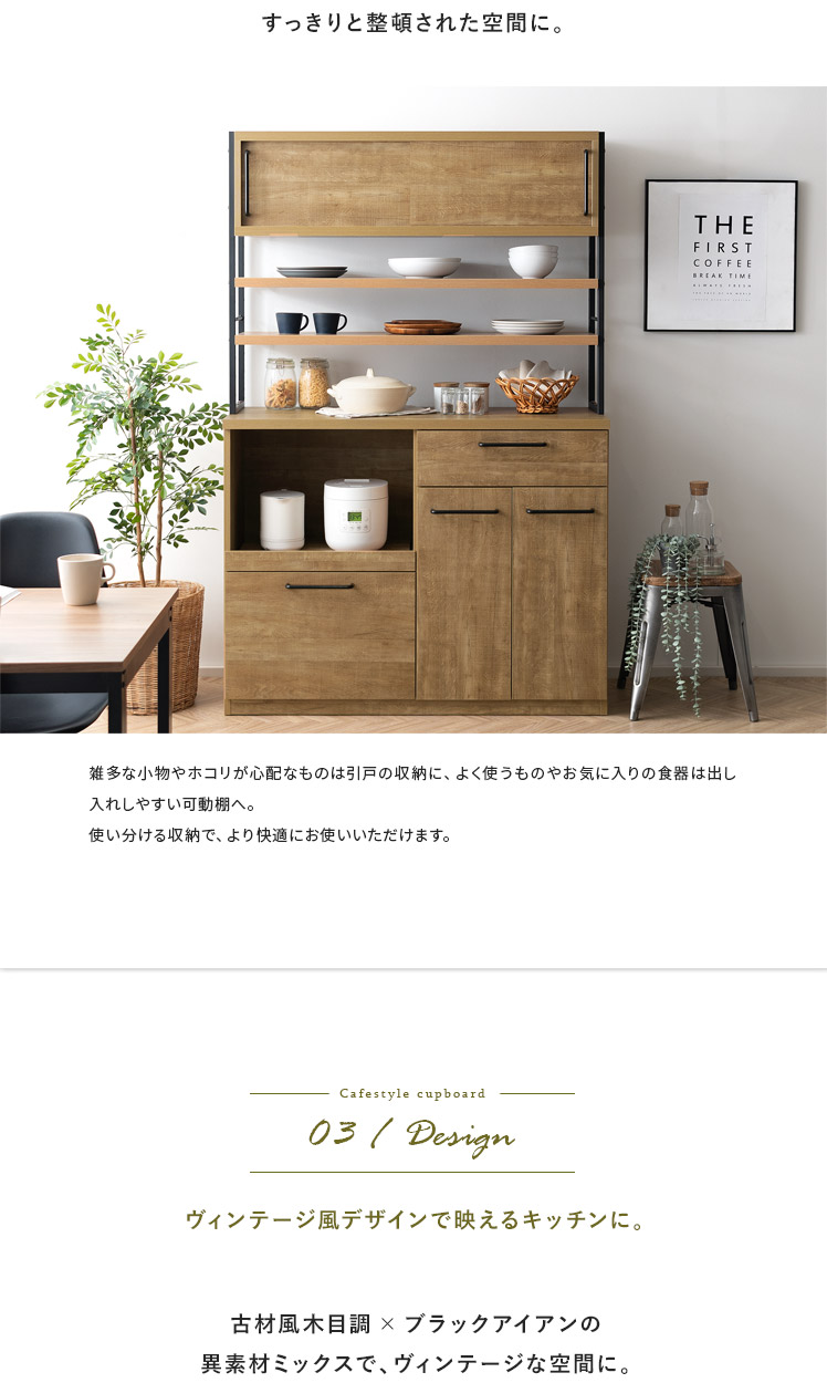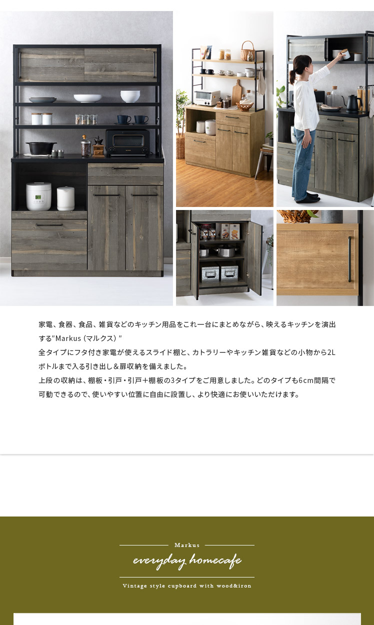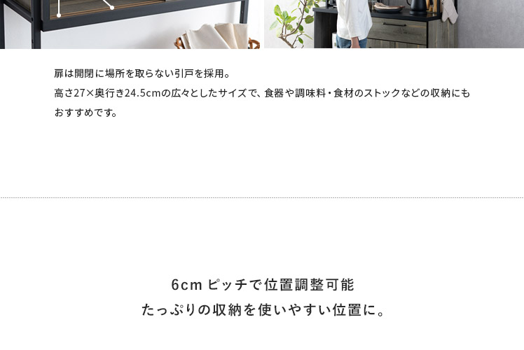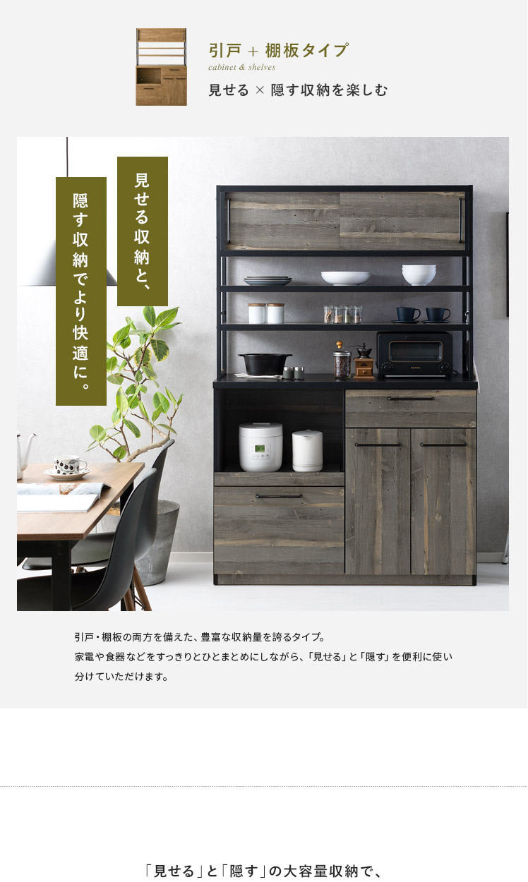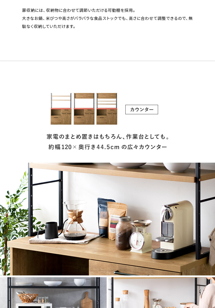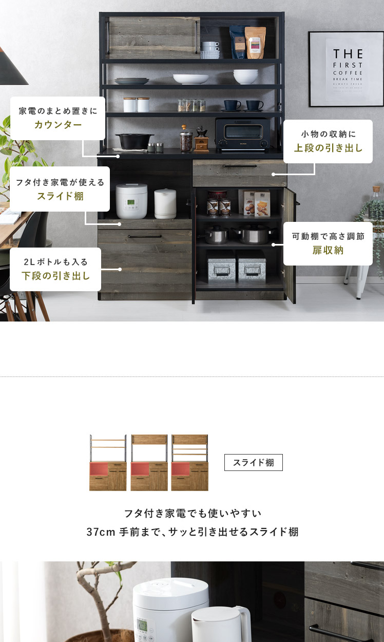 アイアンフレーム食器棚 Markus〔マルクス〕 幅120cm 引戸+棚板タイプ/家電、食器、食品、雑貨などのキッチン用品をこれ一台にまとめながら、映えるキッチンを演出する″Markus(マルクス)″全タイプにフタ付き家電が使えるスライド棚と、カトラリーやキッチン雑貨などの小物から2Lボトルまで入る引き出し&扉収納を備えました。上段の収納は、棚板・引戸・引戸+棚板の3タイプをご用意しました。どのタイプも6cm間隔で可動できるので、使いやすい位置に自由に設置し、より快適にお使いいただけます。