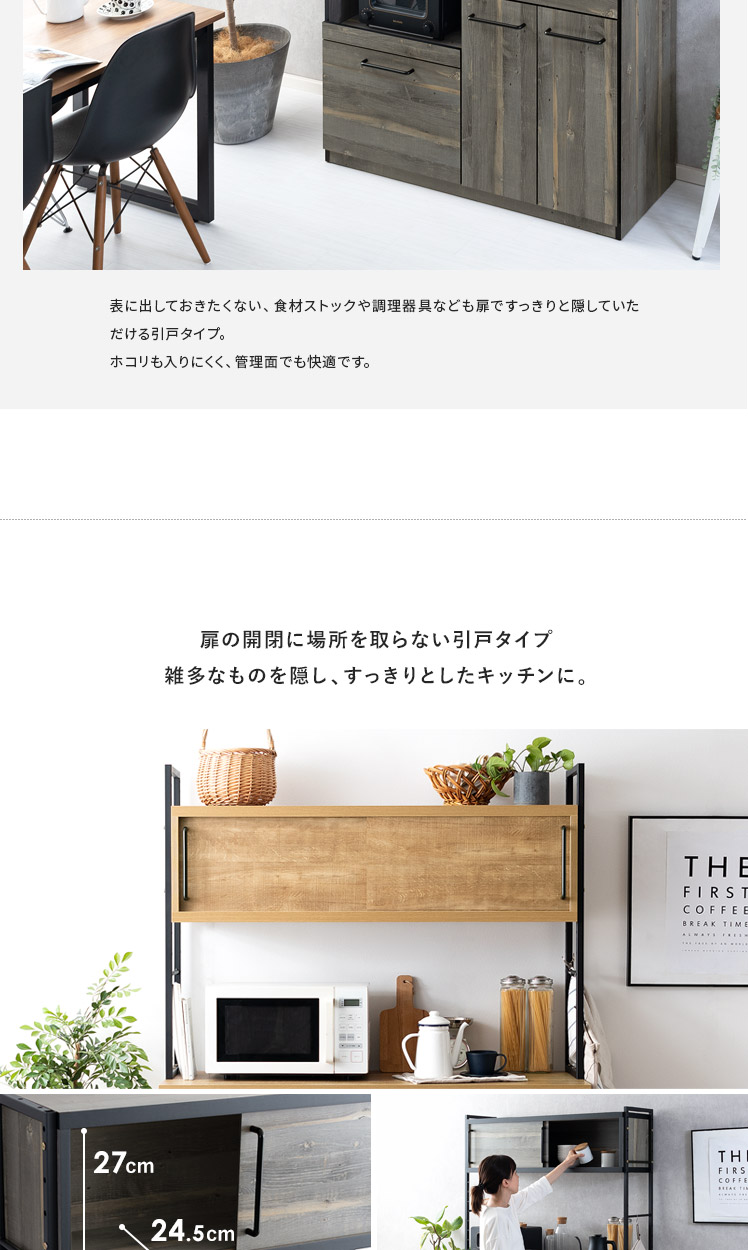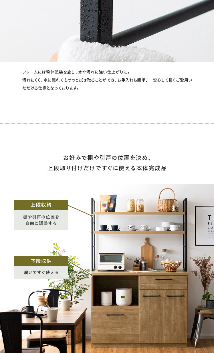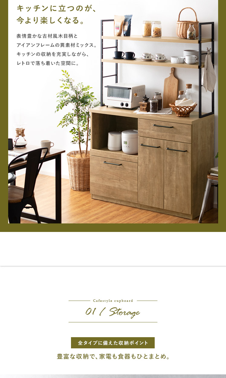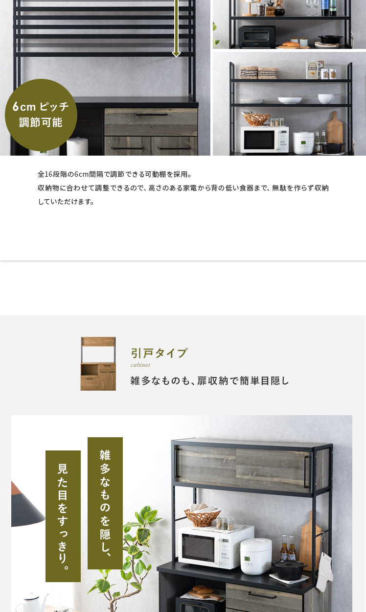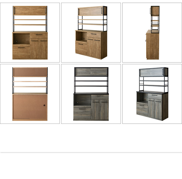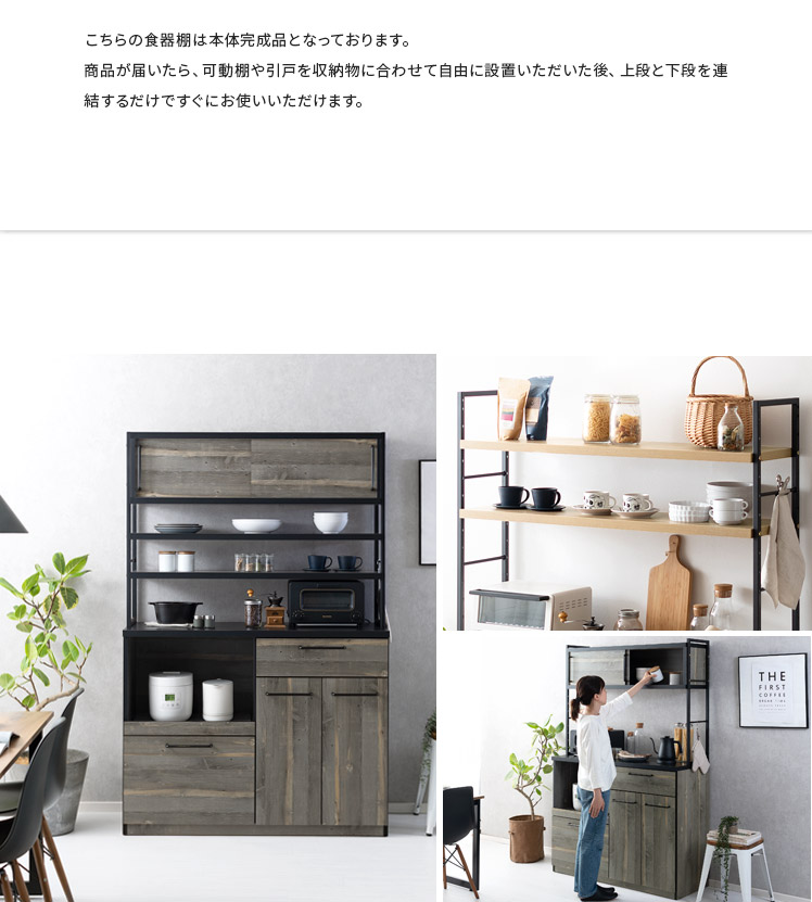 アイアンフレーム食器棚 Markus〔マルクス〕 幅120cm 引戸+棚板タイプ/家電、食器、食品、雑貨などのキッチン用品をこれ一台にまとめながら、映えるキッチンを演出する″Markus(マルクス)″全タイプにフタ付き家電が使えるスライド棚と、カトラリーやキッチン雑貨などの小物から2Lボトルまで入る引き出し&扉収納を備えました。上段の収納は、棚板・引戸・引戸+棚板の3タイプをご用意しました。どのタイプも6cm間隔で可動できるので、使いやすい位置に自由に設置し、より快適にお使いいただけます。
